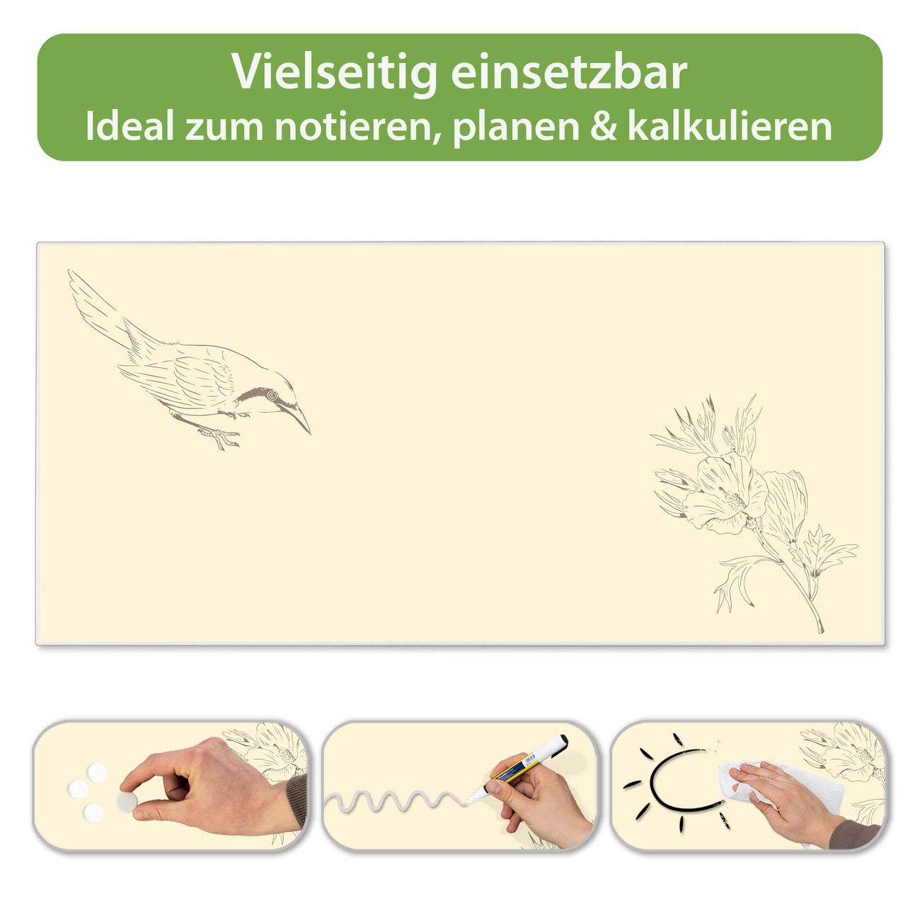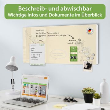 FUNKTION: Die banjado Magnettafel 78x37 cm im Design Motiv Vogel und Blüte vereint Funktionalität und modernes Wohndesign auf stilvolle Weise. Diese hochwertige Magnetwand aus Metall hilft Ihnen dabei, Notizen, Fotos, Termine, Einkaufslisten oder Rezepte übersichtlich zu organisieren. Als praktisches Memoboard sorgt sie für Struktur im Alltag und setzt gleichzeitig einen dekorativen Akzent an Ihrer Wand. DESIGN: Die Metalltafel besteht aus robustem, lackiertem Stahl und ist mit allen handelsüblichen Magneten nutzbar. Besonders praktisch ist die beschreibbare Oberfläche. Sie können die Magnettafel ganz einfach mit Kreidestiften beschriften und die Inhalte bei Bedarf mit einem feuchten Tuch wieder entfernen. So eignet sich das Memoboard ideal für Wochenpläne, Menüpläne, To Do Listen oder kreative Botschaften. DETAILS: Mit ihrem großzügigen Querformat von 78x37 cm bietet die Magnettafel ausreichend Platz für Ihre Organisation. Das Motiv Motiv Vogel und Blüte bringt eine warme, natürliche Optik in Küche, Flur, Büro oder Homeoffice und wirkt auch ohne Magnete oder Beschriftung wie ein modernes Wandbild. NUTZEN: Auf der Rückseite befinden sich vorgefertigte Löcher für eine schnelle und unkomplizierte Wandmontage. Jede banjado Magnettafel wird in Deutschland gefertigt und steht für Qualität, Langlebigkeit und liebevolle Verarbeitung. Dieses beschreibbare Memoboard ist die perfekte Kombination aus Metalltafel, Designobjekt und praktischer Magnetwand für Ihren Alltag. BANJADO: Wir sind ein kleines Team aus dem Herzen von Sachsen. Wir fertigen alle Artikel von Hand für Sie an, Sie erhalten keine preiswerte Importware. Auf Wunsch können Sie auch Ihr eigenes Foto auf die Magnettafel aufbringen, schreiben Sie uns an. Herzlichst, Ihr banjado-Team
