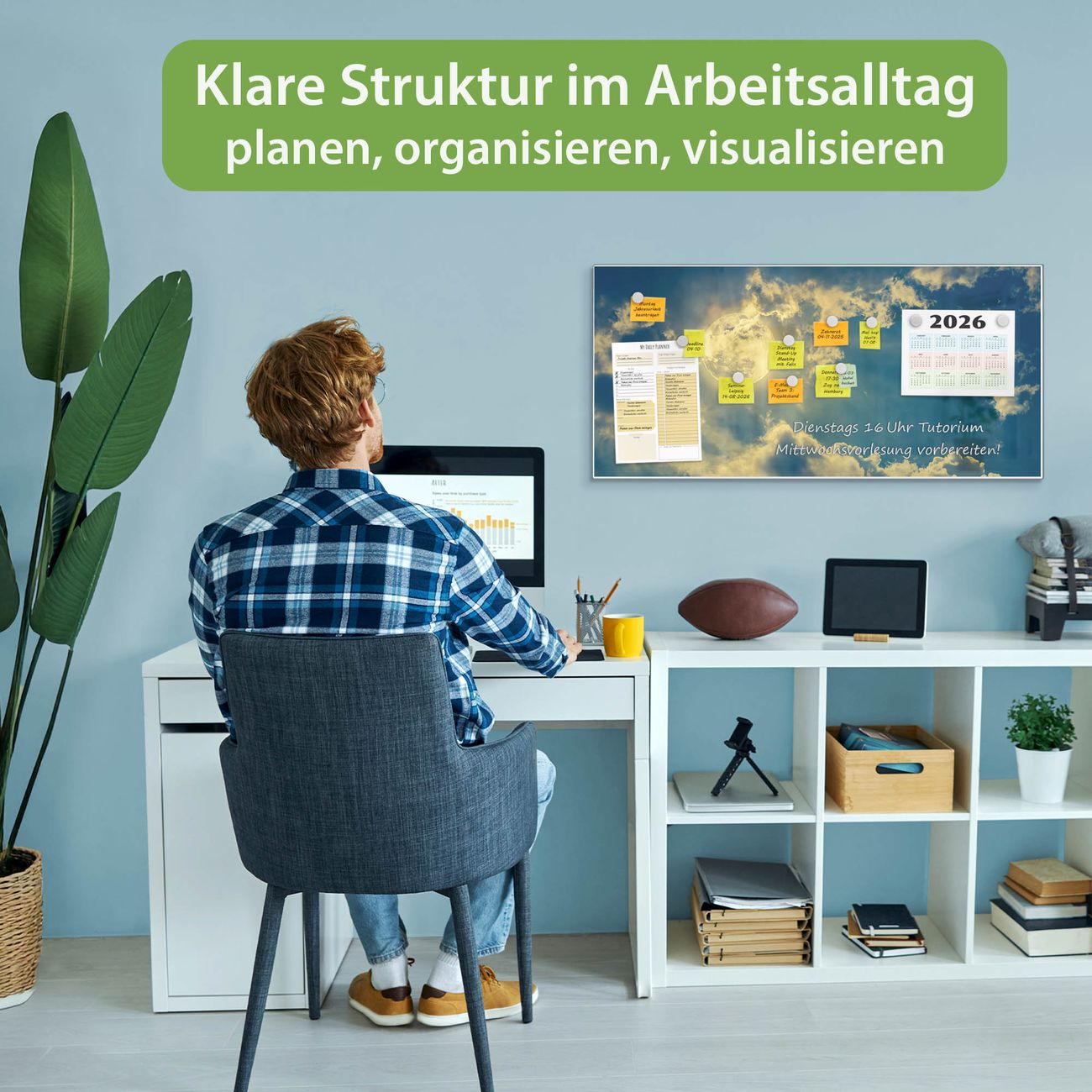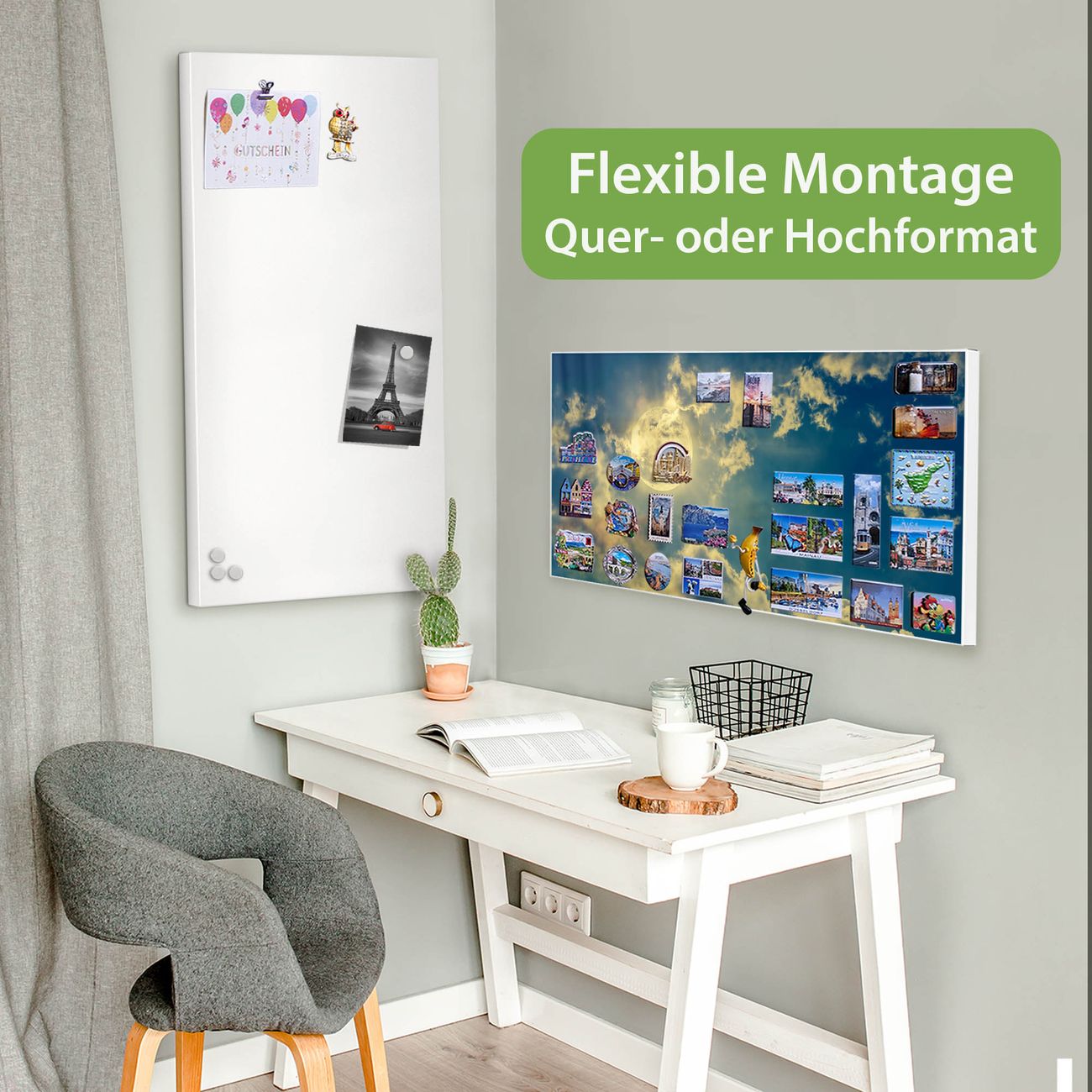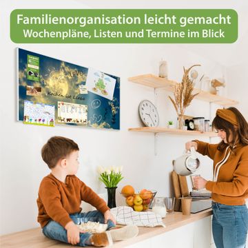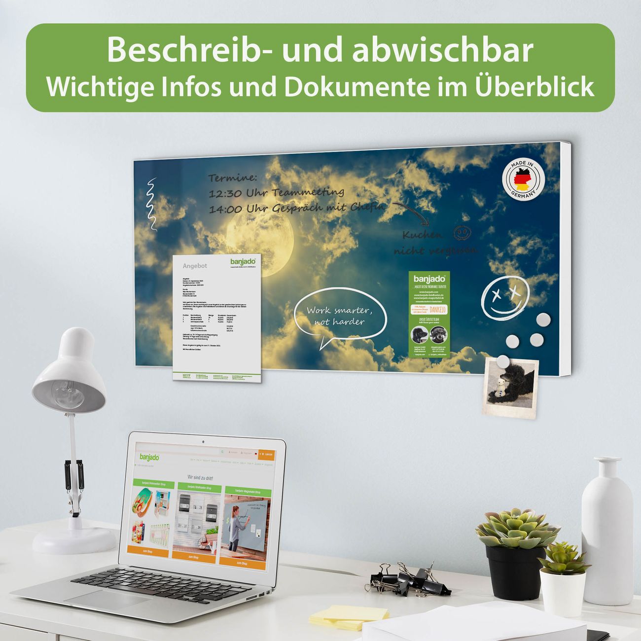 FUNKTION: Die banjado Magnettafel 78x37 cm im Design Motiv Vollmond 2 vereint Funktionalität und modernes Wohndesign auf stilvolle Weise. Diese hochwertige Magnetwand aus Metall hilft Ihnen dabei, Notizen, Fotos, Termine, Einkaufslisten oder Rezepte übersichtlich zu organisieren. Als praktisches Memoboard sorgt sie für Struktur im Alltag und setzt gleichzeitig einen dekorativen Akzent an Ihrer Wand. DESIGN: Die Metalltafel besteht aus robustem, lackiertem Stahl und ist mit allen handelsüblichen Magneten nutzbar. Besonders praktisch ist die beschreibbare Oberfläche. Sie können die Magnettafel ganz einfach mit Kreidestiften beschriften und die Inhalte bei Bedarf mit einem feuchten Tuch wieder entfernen. So eignet sich das Memoboard ideal für Wochenpläne, Menüpläne, To Do Listen oder kreative Botschaften. DETAILS: Mit ihrem großzügigen Querformat von 78x37 cm bietet die Magnettafel ausreichend Platz für Ihre Organisation. Das Motiv Motiv Vollmond 2 bringt eine warme, natürliche Optik in Küche, Flur, Büro oder Homeoffice und wirkt auch ohne Magnete oder Beschriftung wie ein modernes Wandbild. NUTZEN: Auf der Rückseite befinden sich vorgefertigte Löcher für eine schnelle und unkomplizierte Wandmontage. Jede banjado Magnettafel wird in Deutschland gefertigt und steht für Qualität, Langlebigkeit und liebevolle Verarbeitung. Dieses beschreibbare Memoboard ist die perfekte Kombination aus Metalltafel, Designobjekt und praktischer Magnetwand für Ihren Alltag. BANJADO: Wir sind ein kleines Team aus dem Herzen von Sachsen. Wir fertigen alle Artikel von Hand für Sie an, Sie erhalten keine preiswerte Importware. Auf Wunsch können Sie auch Ihr eigenes Foto auf die Magnettafel aufbringen, schreiben Sie uns an. Herzlichst, Ihr banjado-Team