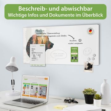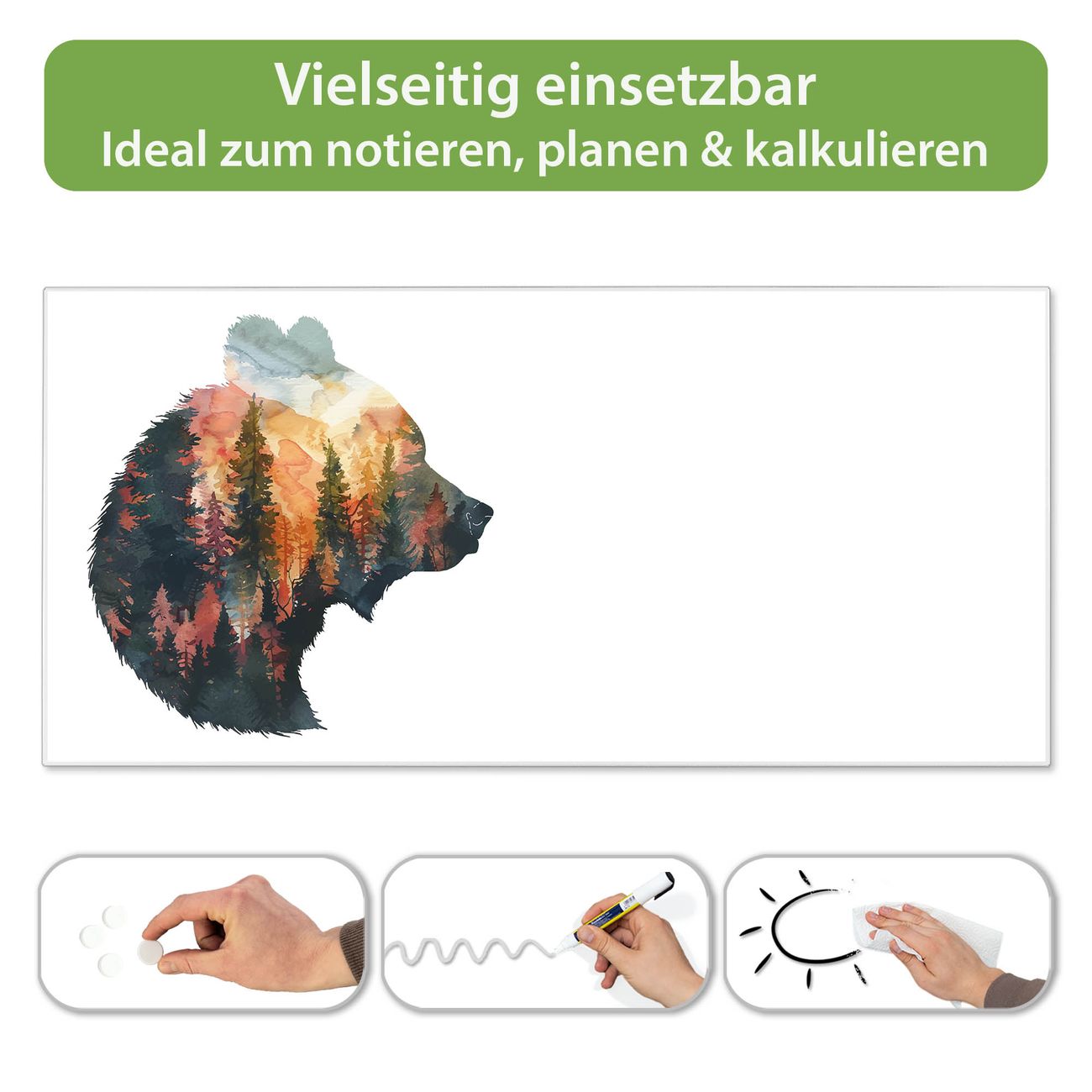 FUNKTION: Die banjado Magnettafel 78x37 cm im Design Motiv Wald und Bär Silhouette vereint Funktionalität und modernes Wohndesign auf stilvolle Weise. Diese hochwertige Magnetwand aus Metall hilft Ihnen dabei, Notizen, Fotos, Termine, Einkaufslisten oder Rezepte übersichtlich zu organisieren. Als praktisches Memoboard sorgt sie für Struktur im Alltag und setzt gleichzeitig einen dekorativen Akzent an Ihrer Wand. DESIGN: Die Metalltafel besteht aus robustem, lackiertem Stahl und ist mit allen handelsüblichen Magneten nutzbar. Besonders praktisch ist die beschreibbare Oberfläche. Sie können die Magnettafel ganz einfach mit Kreidestiften beschriften und die Inhalte bei Bedarf mit einem feuchten Tuch wieder entfernen. So eignet sich das Memoboard ideal für Wochenpläne, Menüpläne, To Do Listen oder kreative Botschaften. DETAILS: Mit ihrem großzügigen Querformat von 78x37 cm bietet die Magnettafel ausreichend Platz für Ihre Organisation. Das Motiv Motiv Wald und Bär Silhouette bringt eine warme, natürliche Optik in Küche, Flur, Büro oder Homeoffice und wirkt auch ohne Magnete oder Beschriftung wie ein modernes Wandbild. NUTZEN: Auf der Rückseite befinden sich vorgefertigte Löcher für eine schnelle und unkomplizierte Wandmontage. Jede banjado Magnettafel wird in Deutschland gefertigt und steht für Qualität, Langlebigkeit und liebevolle Verarbeitung. Dieses beschreibbare Memoboard ist die perfekte Kombination aus Metalltafel, Designobjekt und praktischer Magnetwand für Ihren Alltag. BANJADO: Wir sind ein kleines Team aus dem Herzen von Sachsen. Wir fertigen alle Artikel von Hand für Sie an, Sie erhalten keine preiswerte Importware. Auf Wunsch können Sie auch Ihr eigenes Foto auf die Magnettafel aufbringen, schreiben Sie uns an. Herzlichst, Ihr banjado-Team