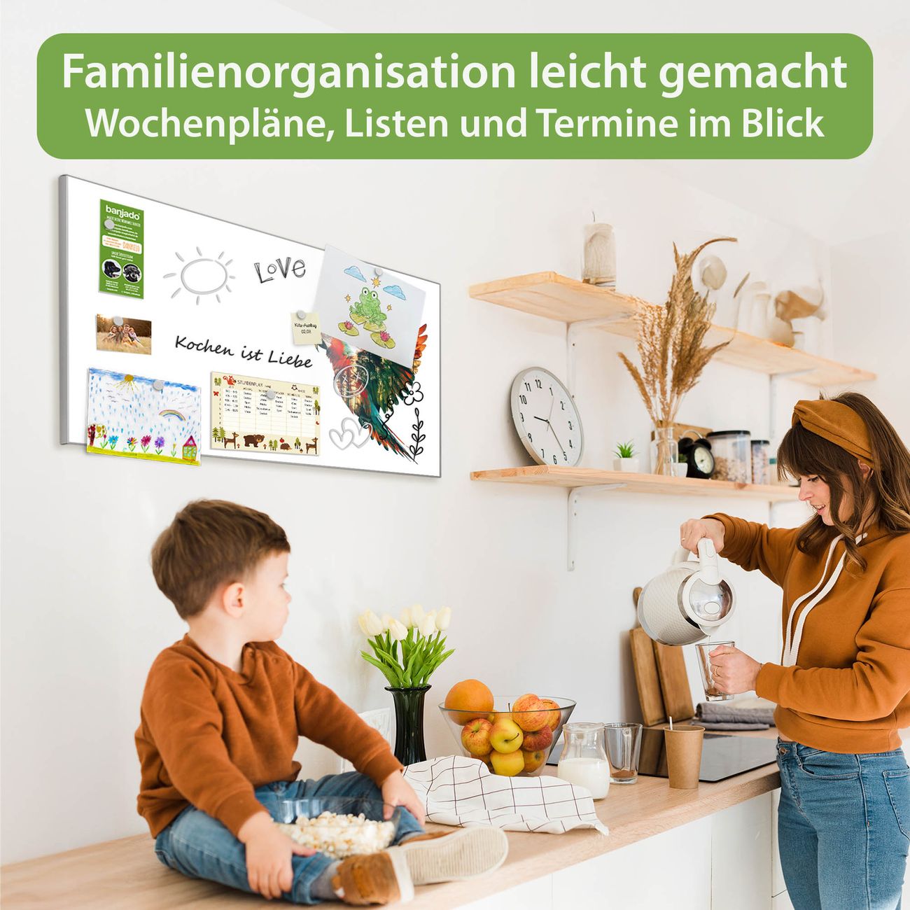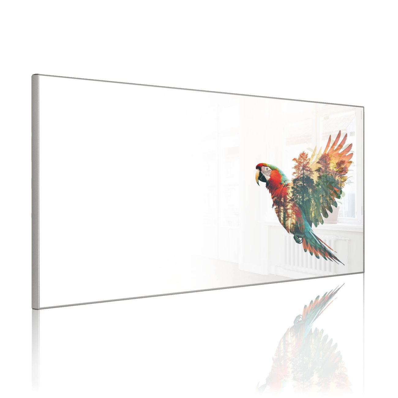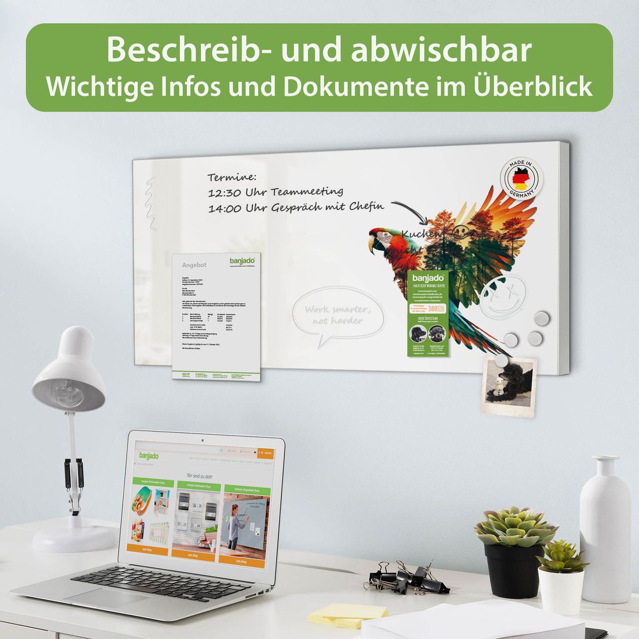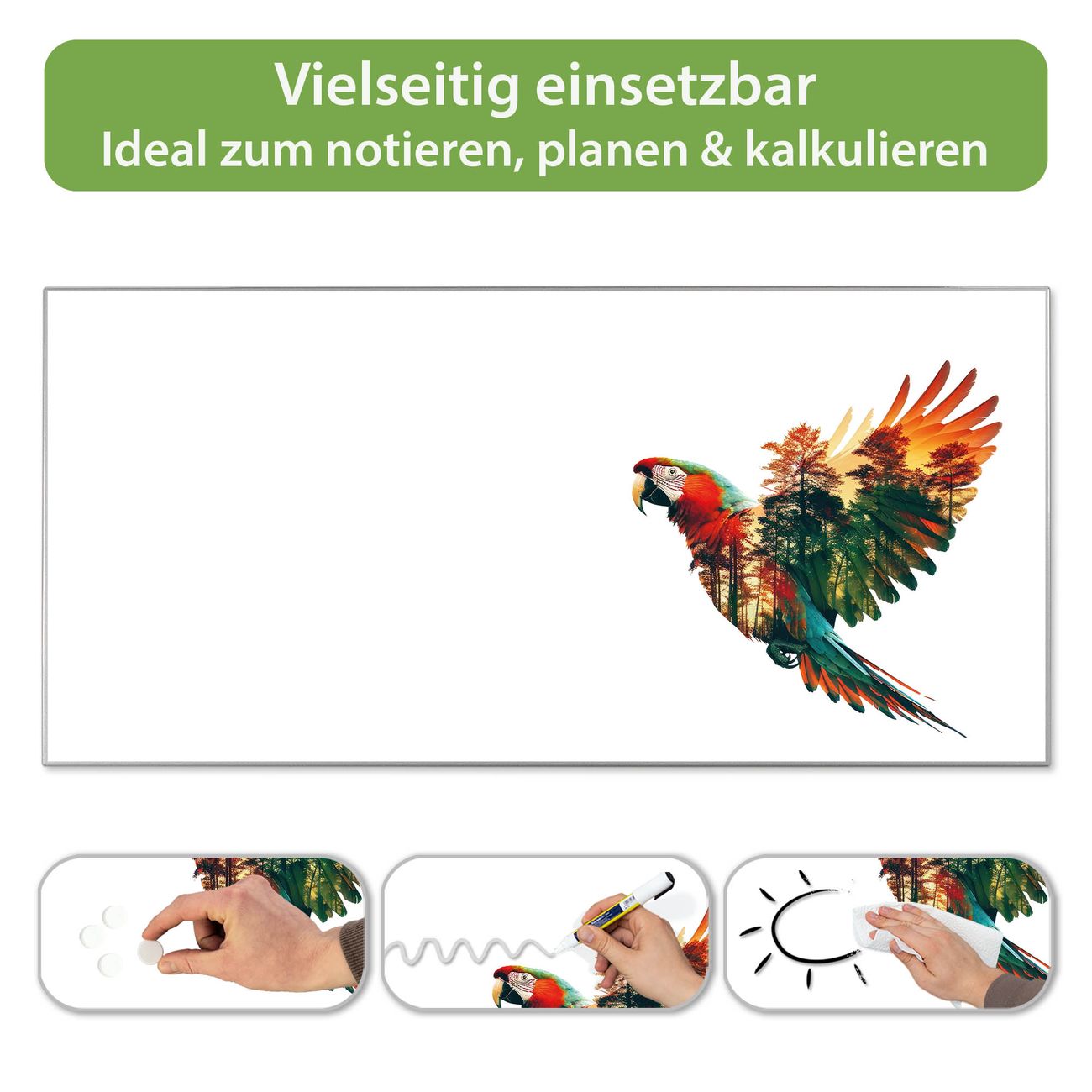 FUNKTION: Die banjado Magnettafel 78x37 cm im Design Motiv Wald und Vogel Silhouette vereint Funktionalität und modernes Wohndesign auf stilvolle Weise. Diese hochwertige Magnetwand aus Metall hilft Ihnen dabei, Notizen, Fotos, Termine, Einkaufslisten oder Rezepte übersichtlich zu organisieren. Als praktisches Memoboard sorgt sie für Struktur im Alltag und setzt gleichzeitig einen dekorativen Akzent an Ihrer Wand. DESIGN: Die Metalltafel besteht aus robustem, lackiertem Stahl und ist mit allen handelsüblichen Magneten nutzbar. Besonders praktisch ist die beschreibbare Oberfläche. Sie können die Magnettafel ganz einfach mit Kreidestiften beschriften und die Inhalte bei Bedarf mit einem feuchten Tuch wieder entfernen. So eignet sich das Memoboard ideal für Wochenpläne, Menüpläne, To Do Listen oder kreative Botschaften. DETAILS: Mit ihrem großzügigen Querformat von 78x37 cm bietet die Magnettafel ausreichend Platz für Ihre Organisation. Das Motiv Motiv Wald und Vogel Silhouette bringt eine warme, natürliche Optik in Küche, Flur, Büro oder Homeoffice und wirkt auch ohne Magnete oder Beschriftung wie ein modernes Wandbild. NUTZEN: Auf der Rückseite befinden sich vorgefertigte Löcher für eine schnelle und unkomplizierte Wandmontage. Jede banjado Magnettafel wird in Deutschland gefertigt und steht für Qualität, Langlebigkeit und liebevolle Verarbeitung. Dieses beschreibbare Memoboard ist die perfekte Kombination aus Metalltafel, Designobjekt und praktischer Magnetwand für Ihren Alltag. BANJADO: Wir sind ein kleines Team aus dem Herzen von Sachsen. Wir fertigen alle Artikel von Hand für Sie an, Sie erhalten keine preiswerte Importware. Auf Wunsch können Sie auch Ihr eigenes Foto auf die Magnettafel aufbringen, schreiben Sie uns an. Herzlichst, Ihr banjado-Team