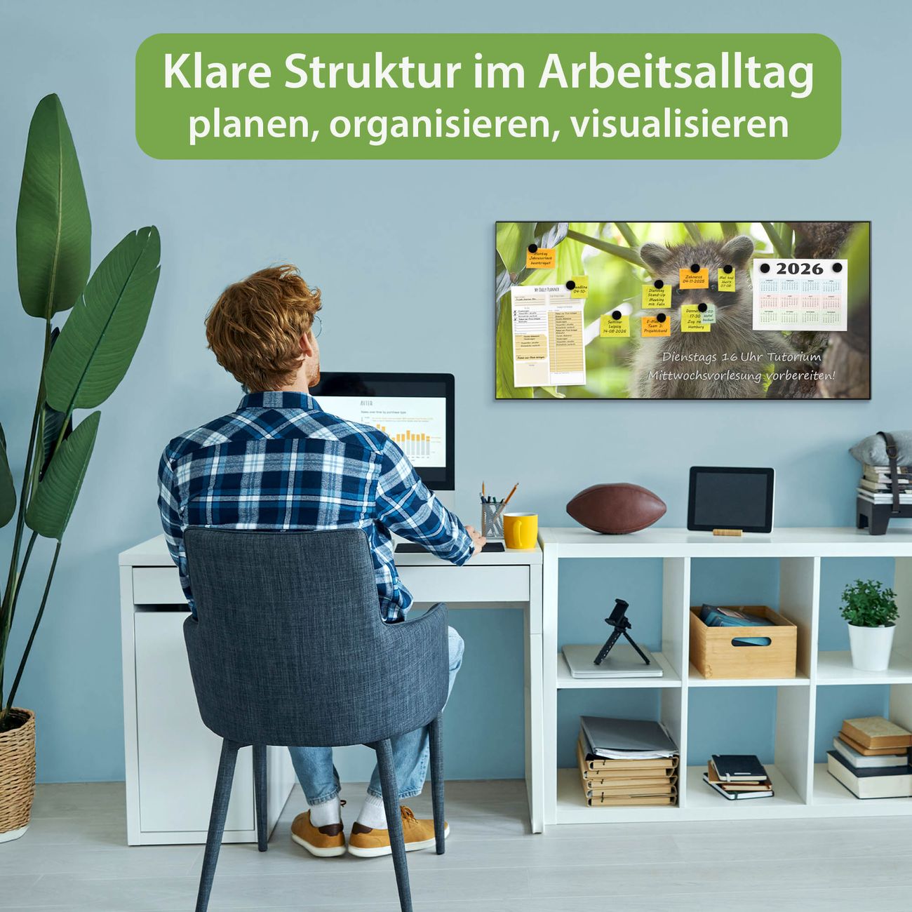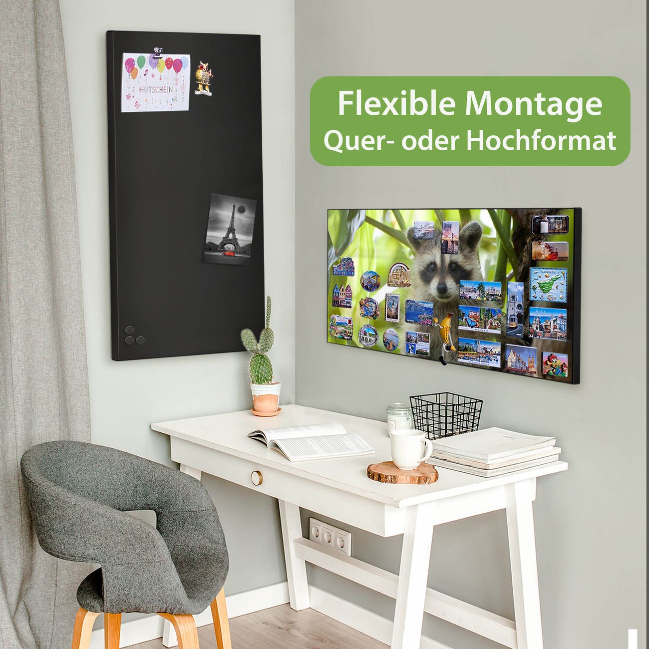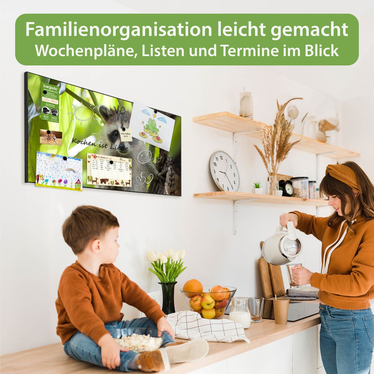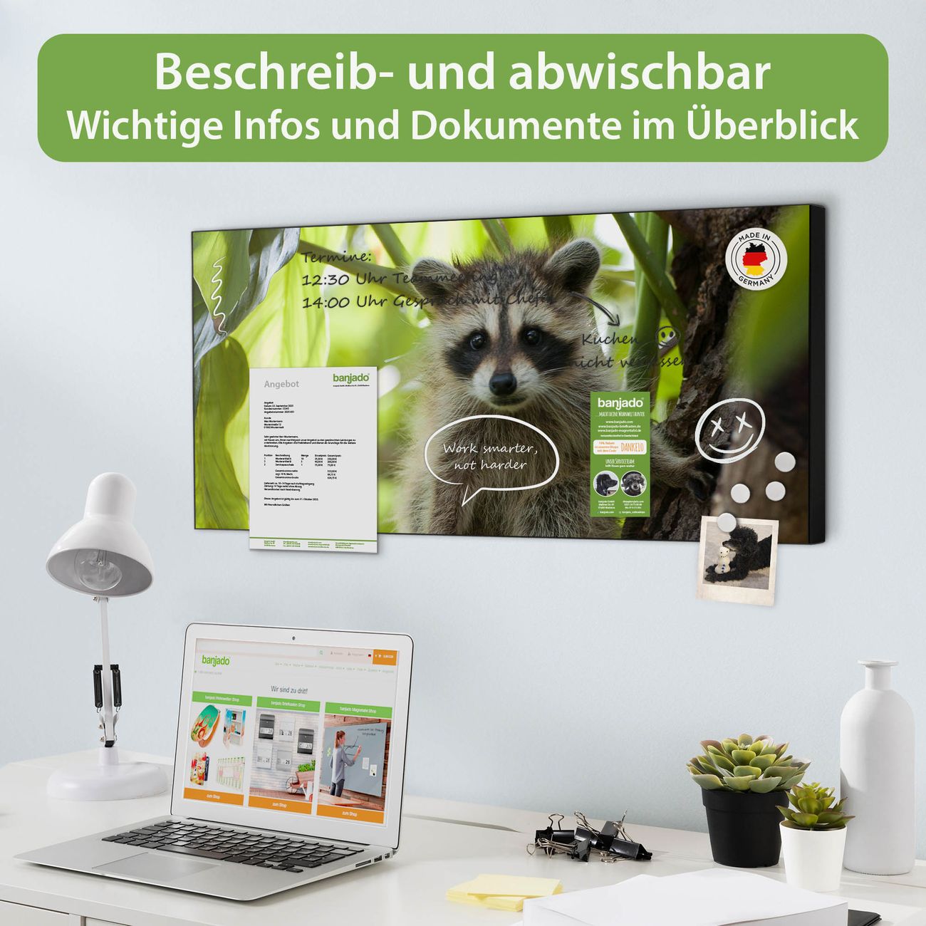 FUNKTION: Die banjado Magnettafel 78x37 cm im Design Motiv Waschbär vereint Funktionalität und modernes Wohndesign auf stilvolle Weise. Diese hochwertige Magnetwand aus Metall hilft Ihnen dabei, Notizen, Fotos, Termine, Einkaufslisten oder Rezepte übersichtlich zu organisieren. Als praktisches Memoboard sorgt sie für Struktur im Alltag und setzt gleichzeitig einen dekorativen Akzent an Ihrer Wand. DESIGN: Die Metalltafel besteht aus robustem, lackiertem Stahl und ist mit allen handelsüblichen Magneten nutzbar. Besonders praktisch ist die beschreibbare Oberfläche. Sie können die Magnettafel ganz einfach mit Kreidestiften beschriften und die Inhalte bei Bedarf mit einem feuchten Tuch wieder entfernen. So eignet sich das Memoboard ideal für Wochenpläne, Menüpläne, To Do Listen oder kreative Botschaften. DETAILS: Mit ihrem großzügigen Querformat von 78x37 cm bietet die Magnettafel ausreichend Platz für Ihre Organisation. Das Motiv Motiv Waschbär bringt eine warme, natürliche Optik in Küche, Flur, Büro oder Homeoffice und wirkt auch ohne Magnete oder Beschriftung wie ein modernes Wandbild. NUTZEN: Auf der Rückseite befinden sich vorgefertigte Löcher für eine schnelle und unkomplizierte Wandmontage. Jede banjado Magnettafel wird in Deutschland gefertigt und steht für Qualität, Langlebigkeit und liebevolle Verarbeitung. Dieses beschreibbare Memoboard ist die perfekte Kombination aus Metalltafel, Designobjekt und praktischer Magnetwand für Ihren Alltag. BANJADO: Wir sind ein kleines Team aus dem Herzen von Sachsen. Wir fertigen alle Artikel von Hand für Sie an, Sie erhalten keine preiswerte Importware. Auf Wunsch können Sie auch Ihr eigenes Foto auf die Magnettafel aufbringen, schreiben Sie uns an. Herzlichst, Ihr banjado-Team