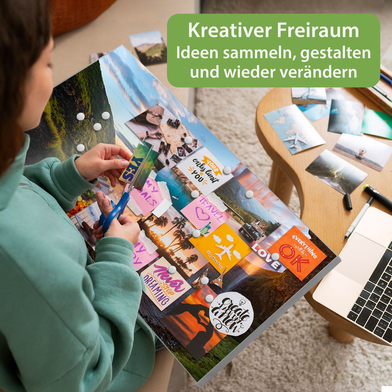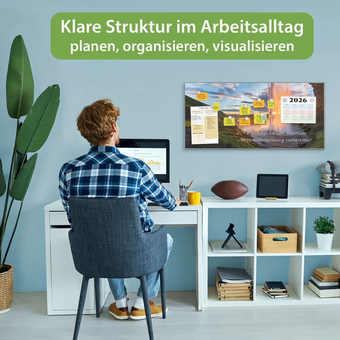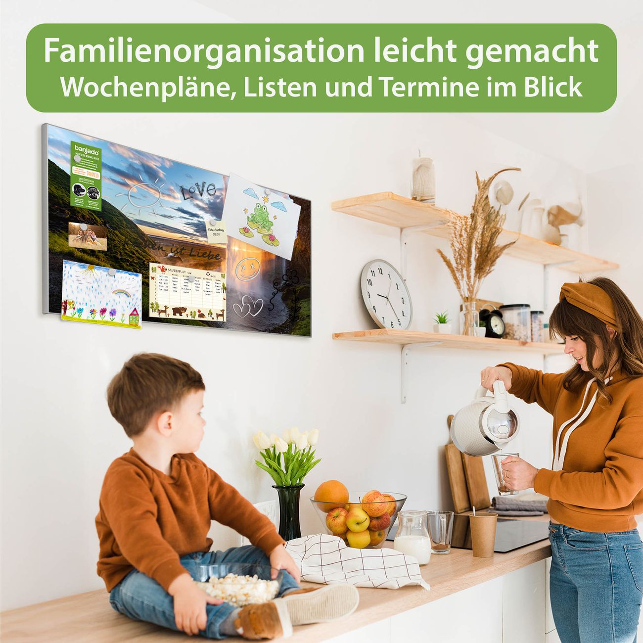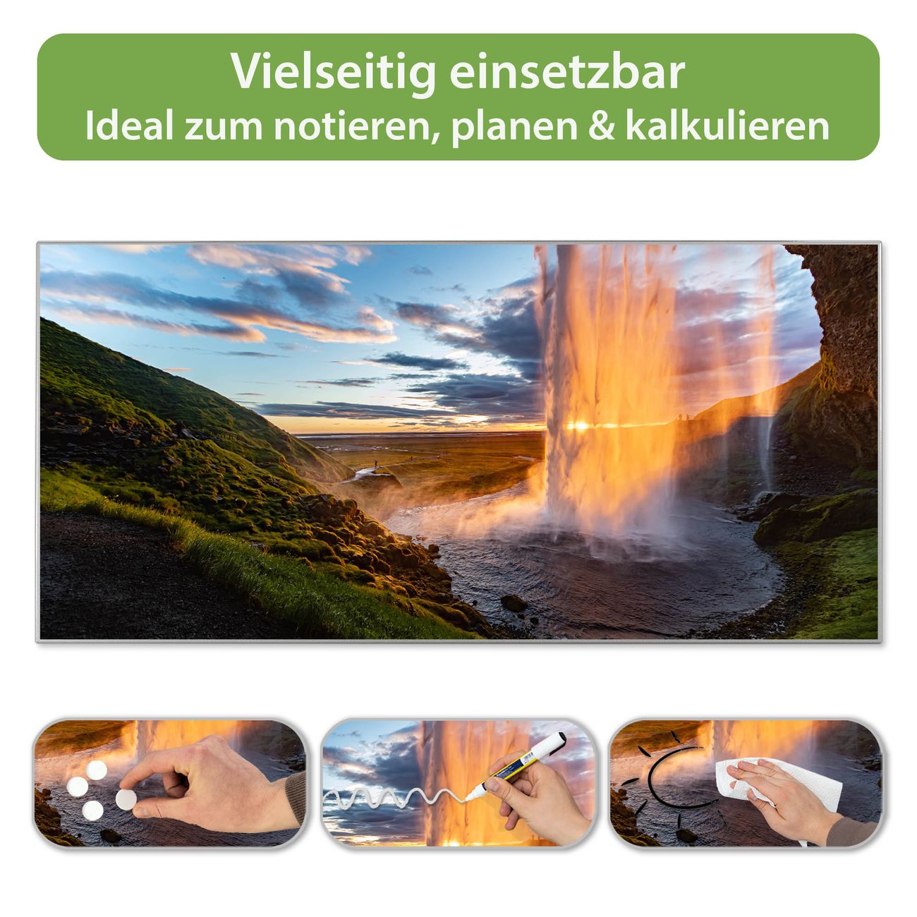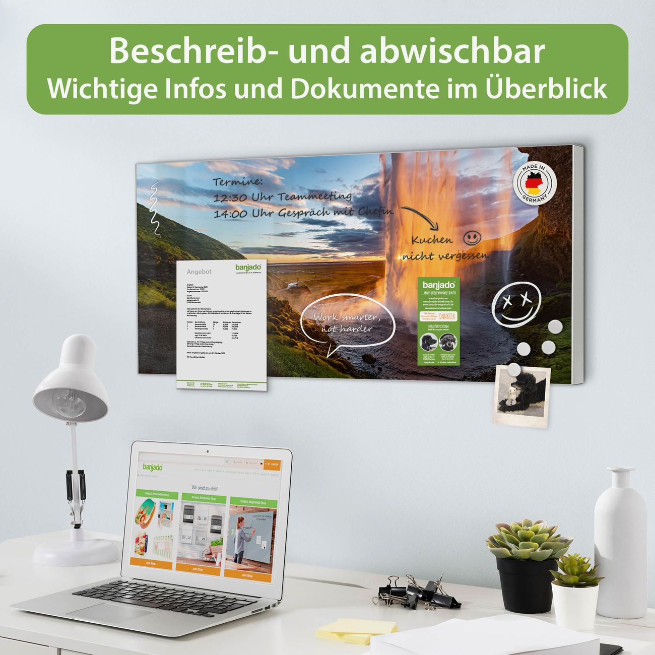 FUNKTION: Die banjado Magnettafel 78x37 cm im Design Motiv Wasserfall im Sonnenlicht vereint Funktionalität und modernes Wohndesign auf stilvolle Weise. Diese hochwertige Magnetwand aus Metall hilft Ihnen dabei, Notizen, Fotos, Termine, Einkaufslisten oder Rezepte übersichtlich zu organisieren. Als praktisches Memoboard sorgt sie für Struktur im Alltag und setzt gleichzeitig einen dekorativen Akzent an Ihrer Wand. DESIGN: Die Metalltafel besteht aus robustem, lackiertem Stahl und ist mit allen handelsüblichen Magneten nutzbar. Besonders praktisch ist die beschreibbare Oberfläche. Sie können die Magnettafel ganz einfach mit Kreidestiften beschriften und die Inhalte bei Bedarf mit einem feuchten Tuch wieder entfernen. So eignet sich das Memoboard ideal für Wochenpläne, Menüpläne, To Do Listen oder kreative Botschaften. DETAILS: Mit ihrem großzügigen Querformat von 78x37 cm bietet die Magnettafel ausreichend Platz für Ihre Organisation. Das Motiv Motiv Wasserfall im Sonnenlicht bringt eine warme, natürliche Optik in Küche, Flur, Büro oder Homeoffice und wirkt auch ohne Magnete oder Beschriftung wie ein modernes Wandbild. NUTZEN: Auf der Rückseite befinden sich vorgefertigte Löcher für eine schnelle und unkomplizierte Wandmontage. Jede banjado Magnettafel wird in Deutschland gefertigt und steht für Qualität, Langlebigkeit und liebevolle Verarbeitung. Dieses beschreibbare Memoboard ist die perfekte Kombination aus Metalltafel, Designobjekt und praktischer Magnetwand für Ihren Alltag. BANJADO: Wir sind ein kleines Team aus dem Herzen von Sachsen. Wir fertigen alle Artikel von Hand für Sie an, Sie erhalten keine preiswerte Importware. Auf Wunsch können Sie auch Ihr eigenes Foto auf die Magnettafel aufbringen, schreiben Sie uns an. Herzlichst, Ihr banjado-Team