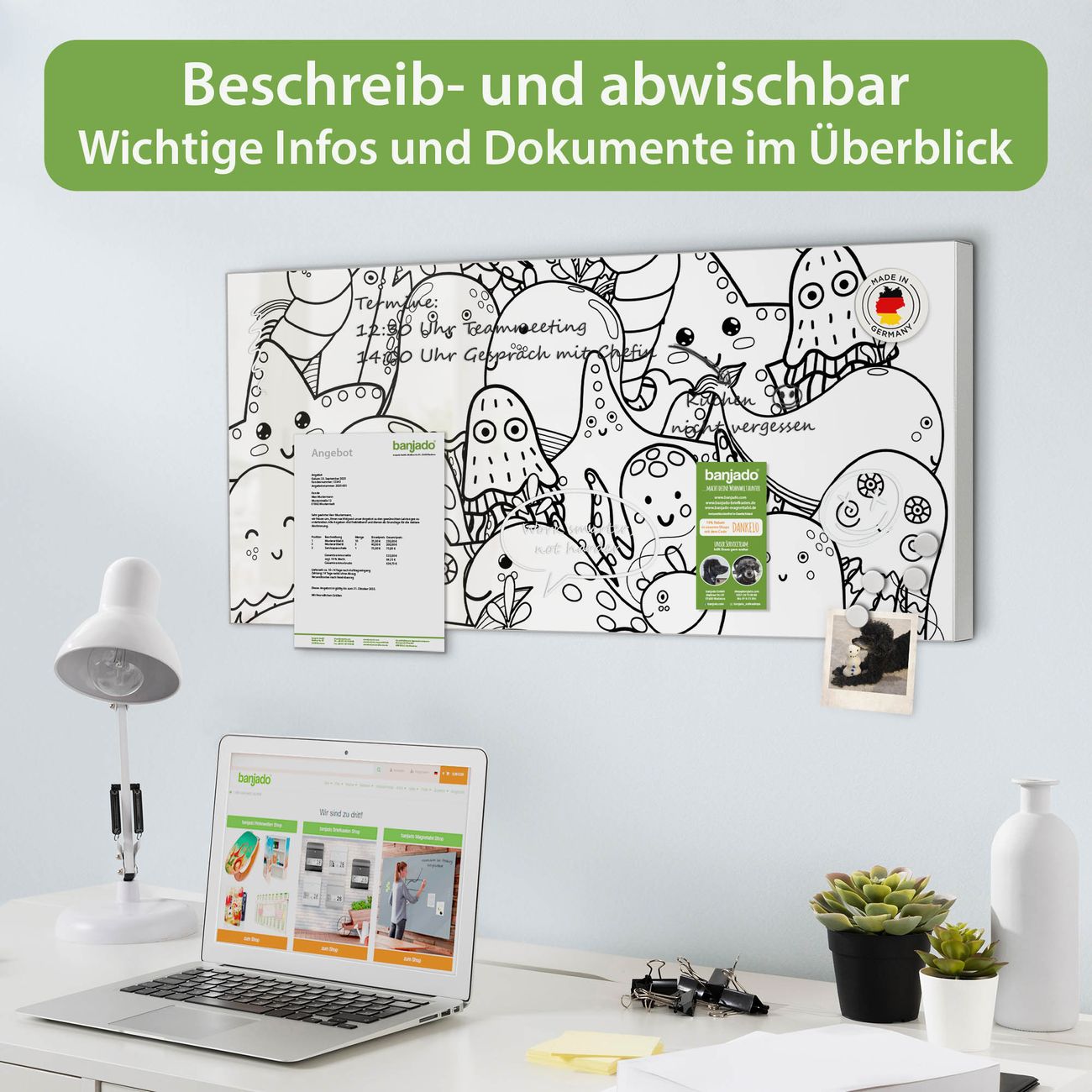 FUNKTION: Die banjado Magnettafel 78x37 cm im Design Motiv Wassermonsterchen 2 vereint Funktionalität und modernes Wohndesign auf stilvolle Weise. Diese hochwertige Magnetwand aus Metall hilft Ihnen dabei, Notizen, Fotos, Termine, Einkaufslisten oder Rezepte übersichtlich zu organisieren. Als praktisches Memoboard sorgt sie für Struktur im Alltag und setzt gleichzeitig einen dekorativen Akzent an Ihrer Wand. DESIGN: Die Metalltafel besteht aus robustem, lackiertem Stahl und ist mit allen handelsüblichen Magneten nutzbar. Besonders praktisch ist die beschreibbare Oberfläche. Sie können die Magnettafel ganz einfach mit Kreidestiften beschriften und die Inhalte bei Bedarf mit einem feuchten Tuch wieder entfernen. So eignet sich das Memoboard ideal für Wochenpläne, Menüpläne, To Do Listen oder kreative Botschaften. DETAILS: Mit ihrem großzügigen Querformat von 78x37 cm bietet die Magnettafel ausreichend Platz für Ihre Organisation. Das Motiv Motiv Wassermonsterchen 2 bringt eine warme, natürliche Optik in Küche, Flur, Büro oder Homeoffice und wirkt auch ohne Magnete oder Beschriftung wie ein modernes Wandbild. NUTZEN: Auf der Rückseite befinden sich vorgefertigte Löcher für eine schnelle und unkomplizierte Wandmontage. Jede banjado Magnettafel wird in Deutschland gefertigt und steht für Qualität, Langlebigkeit und liebevolle Verarbeitung. Dieses beschreibbare Memoboard ist die perfekte Kombination aus Metalltafel, Designobjekt und praktischer Magnetwand für Ihren Alltag. BANJADO: Wir sind ein kleines Team aus dem Herzen von Sachsen. Wir fertigen alle Artikel von Hand für Sie an, Sie erhalten keine preiswerte Importware. Auf Wunsch können Sie auch Ihr eigenes Foto auf die Magnettafel aufbringen, schreiben Sie uns an. Herzlichst, Ihr banjado-Team