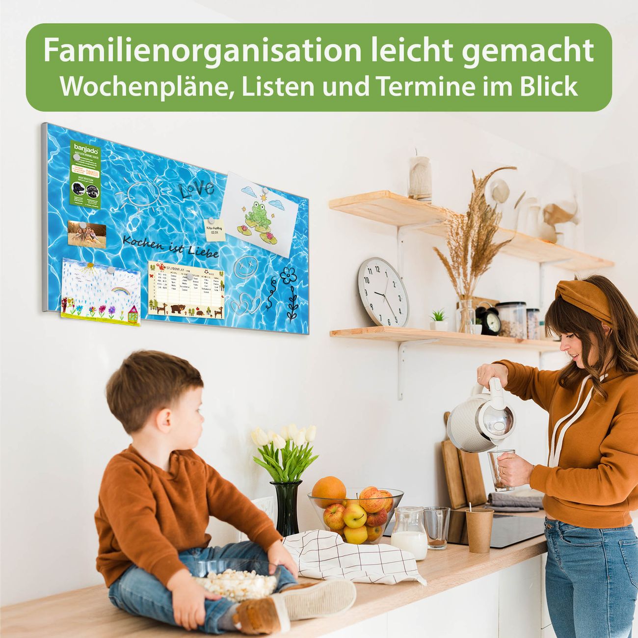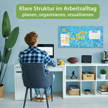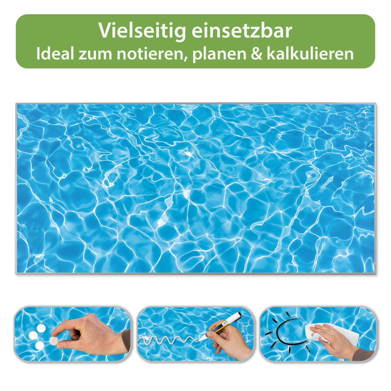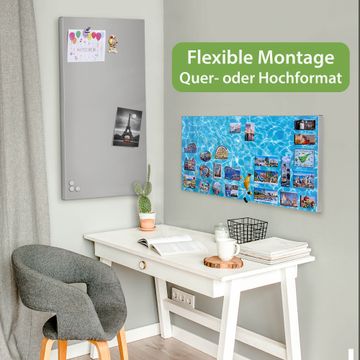 FUNKTION: Die banjado Magnettafel 78x37 cm im Design Motiv Wasseroberfläche vereint Funktionalität und modernes Wohndesign auf stilvolle Weise. Diese hochwertige Magnetwand aus Metall hilft Ihnen dabei, Notizen, Fotos, Termine, Einkaufslisten oder Rezepte übersichtlich zu organisieren. Als praktisches Memoboard sorgt sie für Struktur im Alltag und setzt gleichzeitig einen dekorativen Akzent an Ihrer Wand. DESIGN: Die Metalltafel besteht aus robustem, lackiertem Stahl und ist mit allen handelsüblichen Magneten nutzbar. Besonders praktisch ist die beschreibbare Oberfläche. Sie können die Magnettafel ganz einfach mit Kreidestiften beschriften und die Inhalte bei Bedarf mit einem feuchten Tuch wieder entfernen. So eignet sich das Memoboard ideal für Wochenpläne, Menüpläne, To Do Listen oder kreative Botschaften. DETAILS: Mit ihrem großzügigen Querformat von 78x37 cm bietet die Magnettafel ausreichend Platz für Ihre Organisation. Das Motiv Motiv Wasseroberfläche bringt eine warme, natürliche Optik in Küche, Flur, Büro oder Homeoffice und wirkt auch ohne Magnete oder Beschriftung wie ein modernes Wandbild. NUTZEN: Auf der Rückseite befinden sich vorgefertigte Löcher für eine schnelle und unkomplizierte Wandmontage. Jede banjado Magnettafel wird in Deutschland gefertigt und steht für Qualität, Langlebigkeit und liebevolle Verarbeitung. Dieses beschreibbare Memoboard ist die perfekte Kombination aus Metalltafel, Designobjekt und praktischer Magnetwand für Ihren Alltag. BANJADO: Wir sind ein kleines Team aus dem Herzen von Sachsen. Wir fertigen alle Artikel von Hand für Sie an, Sie erhalten keine preiswerte Importware. Auf Wunsch können Sie auch Ihr eigenes Foto auf die Magnettafel aufbringen, schreiben Sie uns an. Herzlichst, Ihr banjado-Team