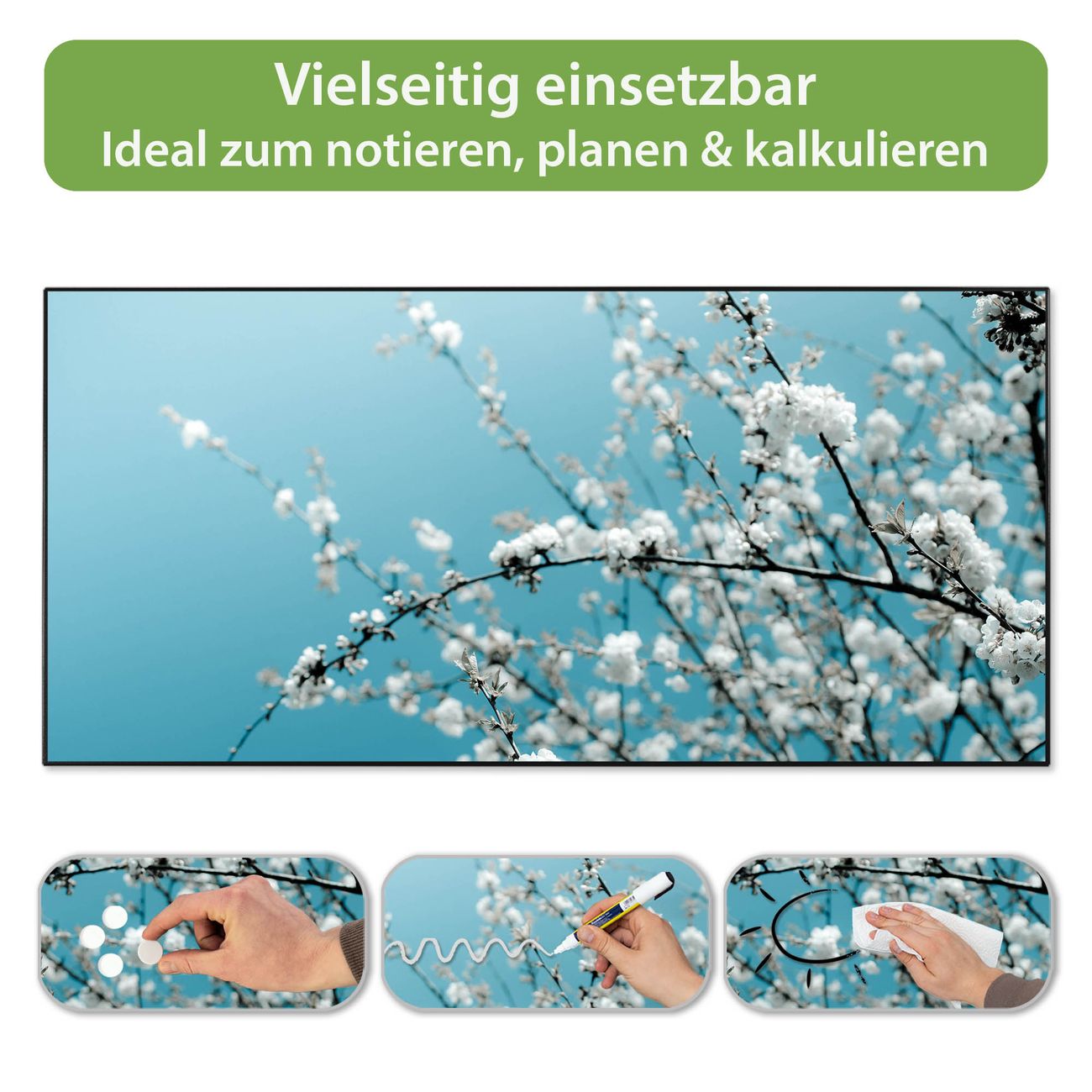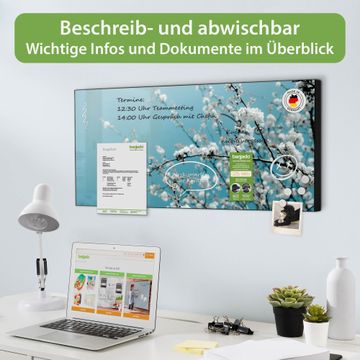 FUNKTION: Die banjado Magnettafel 78x37 cm im Design Motiv weiße Kirschblüten vereint Funktionalität und modernes Wohndesign auf stilvolle Weise. Diese hochwertige Magnetwand aus Metall hilft Ihnen dabei, Notizen, Fotos, Termine, Einkaufslisten oder Rezepte übersichtlich zu organisieren. Als praktisches Memoboard sorgt sie für Struktur im Alltag und setzt gleichzeitig einen dekorativen Akzent an Ihrer Wand. DESIGN: Die Metalltafel besteht aus robustem, lackiertem Stahl und ist mit allen handelsüblichen Magneten nutzbar. Besonders praktisch ist die beschreibbare Oberfläche. Sie können die Magnettafel ganz einfach mit Kreidestiften beschriften und die Inhalte bei Bedarf mit einem feuchten Tuch wieder entfernen. So eignet sich das Memoboard ideal für Wochenpläne, Menüpläne, To Do Listen oder kreative Botschaften. DETAILS: Mit ihrem großzügigen Querformat von 78x37 cm bietet die Magnettafel ausreichend Platz für Ihre Organisation. Das Motiv Motiv weiße Kirschblüten bringt eine warme, natürliche Optik in Küche, Flur, Büro oder Homeoffice und wirkt auch ohne Magnete oder Beschriftung wie ein modernes Wandbild. NUTZEN: Auf der Rückseite befinden sich vorgefertigte Löcher für eine schnelle und unkomplizierte Wandmontage. Jede banjado Magnettafel wird in Deutschland gefertigt und steht für Qualität, Langlebigkeit und liebevolle Verarbeitung. Dieses beschreibbare Memoboard ist die perfekte Kombination aus Metalltafel, Designobjekt und praktischer Magnetwand für Ihren Alltag. BANJADO: Wir sind ein kleines Team aus dem Herzen von Sachsen. Wir fertigen alle Artikel von Hand für Sie an, Sie erhalten keine preiswerte Importware. Auf Wunsch können Sie auch Ihr eigenes Foto auf die Magnettafel aufbringen, schreiben Sie uns an. Herzlichst, Ihr banjado-Team