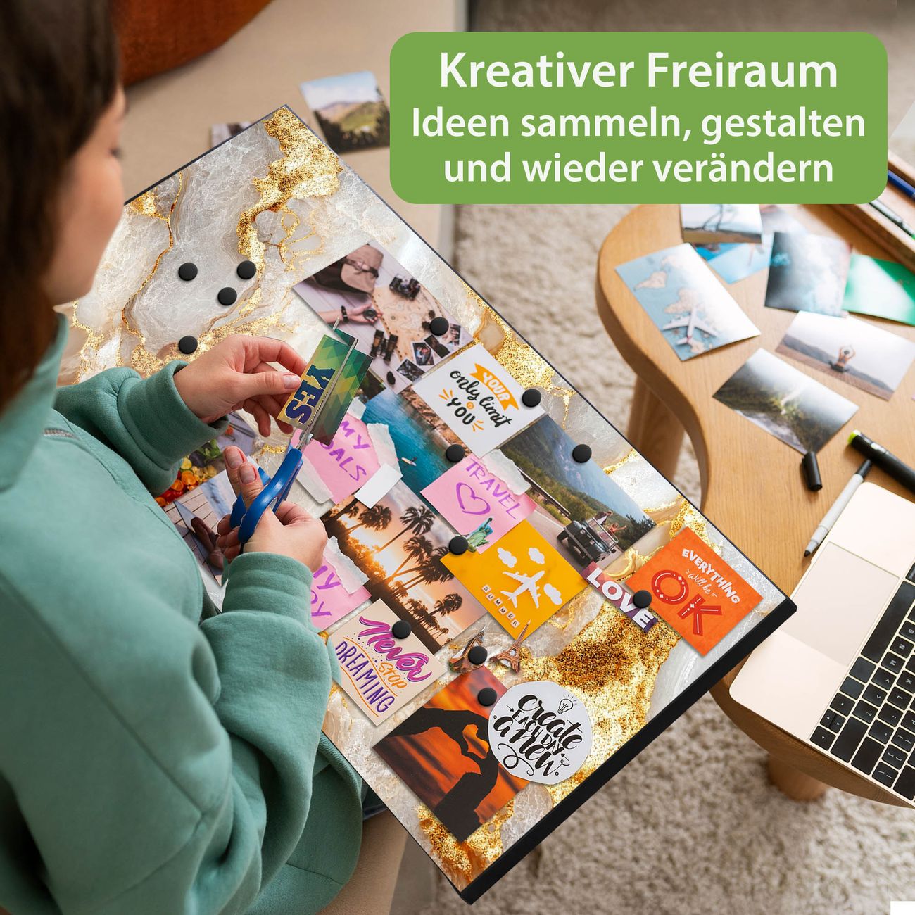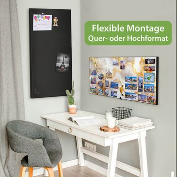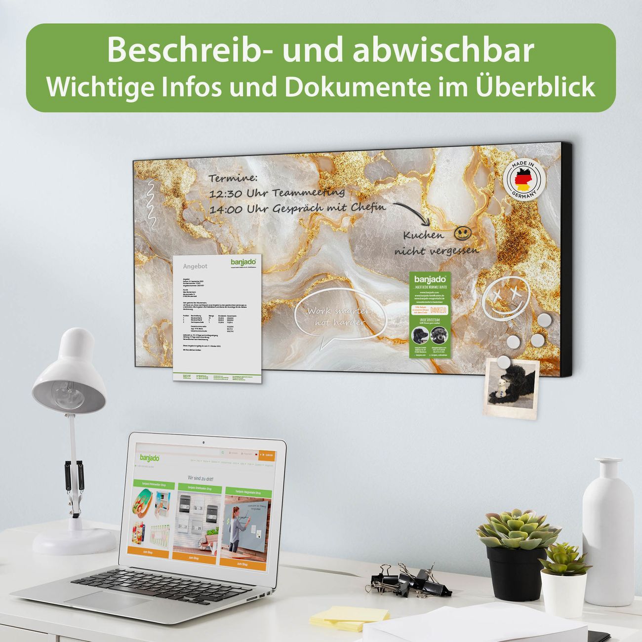 FUNKTION: Die banjado Magnettafel 78x37 cm im Design Motiv Weißer Marmor mit Gold 1 vereint Funktionalität und modernes Wohndesign auf stilvolle Weise. Diese hochwertige Magnetwand aus Metall hilft Ihnen dabei, Notizen, Fotos, Termine, Einkaufslisten oder Rezepte übersichtlich zu organisieren. Als praktisches Memoboard sorgt sie für Struktur im Alltag und setzt gleichzeitig einen dekorativen Akzent an Ihrer Wand. DESIGN: Die Metalltafel besteht aus robustem, lackiertem Stahl und ist mit allen handelsüblichen Magneten nutzbar. Besonders praktisch ist die beschreibbare Oberfläche. Sie können die Magnettafel ganz einfach mit Kreidestiften beschriften und die Inhalte bei Bedarf mit einem feuchten Tuch wieder entfernen. So eignet sich das Memoboard ideal für Wochenpläne, Menüpläne, To Do Listen oder kreative Botschaften. DETAILS: Mit ihrem großzügigen Querformat von 78x37 cm bietet die Magnettafel ausreichend Platz für Ihre Organisation. Das Motiv Motiv Weißer Marmor mit Gold 1 bringt eine warme, natürliche Optik in Küche, Flur, Büro oder Homeoffice und wirkt auch ohne Magnete oder Beschriftung wie ein modernes Wandbild. NUTZEN: Auf der Rückseite befinden sich vorgefertigte Löcher für eine schnelle und unkomplizierte Wandmontage. Jede banjado Magnettafel wird in Deutschland gefertigt und steht für Qualität, Langlebigkeit und liebevolle Verarbeitung. Dieses beschreibbare Memoboard ist die perfekte Kombination aus Metalltafel, Designobjekt und praktischer Magnetwand für Ihren Alltag. BANJADO: Wir sind ein kleines Team aus dem Herzen von Sachsen. Wir fertigen alle Artikel von Hand für Sie an, Sie erhalten keine preiswerte Importware. Auf Wunsch können Sie auch Ihr eigenes Foto auf die Magnettafel aufbringen, schreiben Sie uns an. Herzlichst, Ihr banjado-Team
