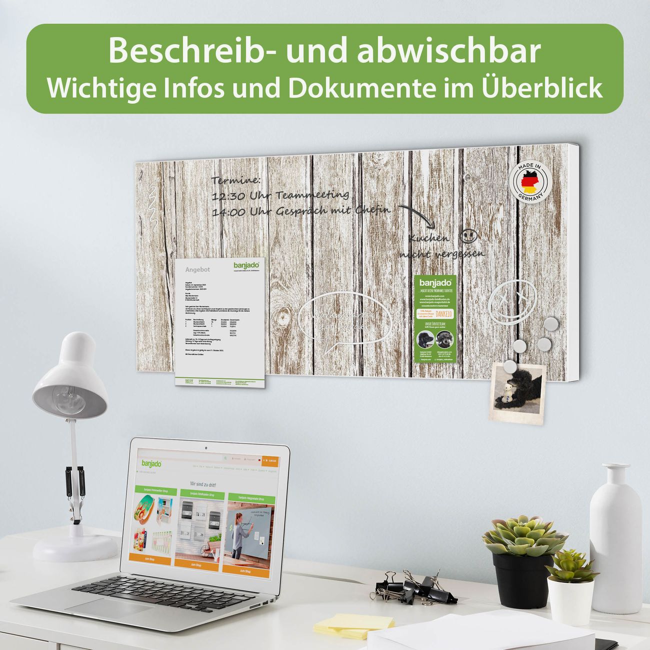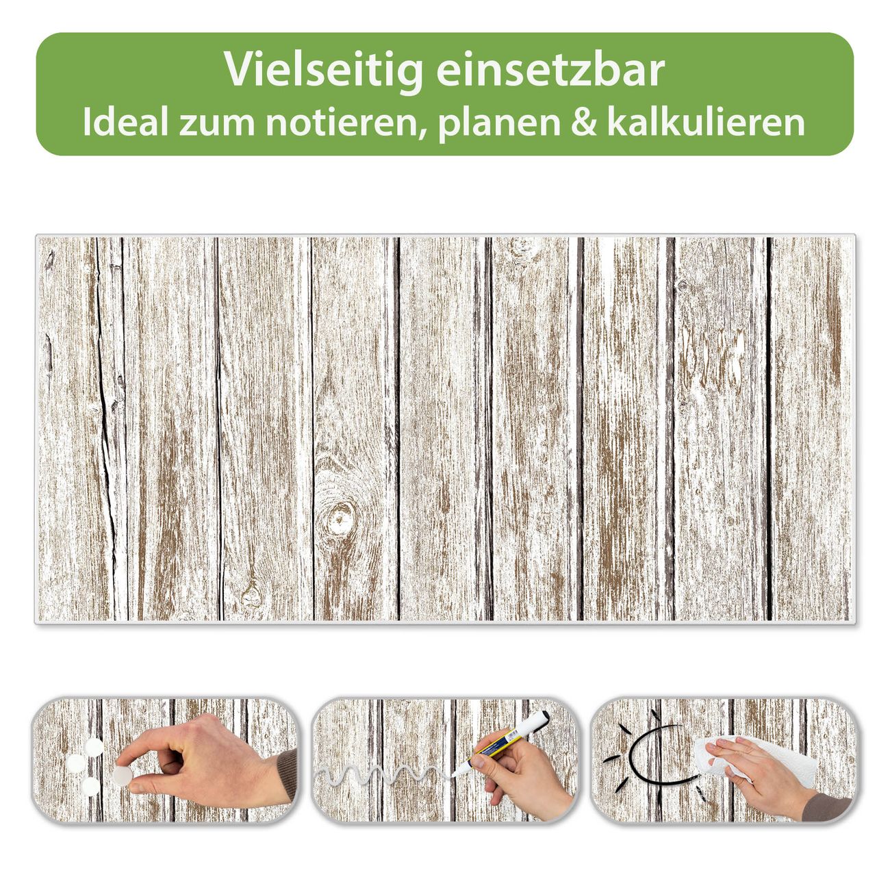 FUNKTION: Die banjado Magnettafel 78x37 cm im Design Motiv Weißes Holz vereint Funktionalität und modernes Wohndesign auf stilvolle Weise. Diese hochwertige Magnetwand aus Metall hilft Ihnen dabei, Notizen, Fotos, Termine, Einkaufslisten oder Rezepte übersichtlich zu organisieren. Als praktisches Memoboard sorgt sie für Struktur im Alltag und setzt gleichzeitig einen dekorativen Akzent an Ihrer Wand. DESIGN: Die Metalltafel besteht aus robustem, lackiertem Stahl und ist mit allen handelsüblichen Magneten nutzbar. Besonders praktisch ist die beschreibbare Oberfläche. Sie können die Magnettafel ganz einfach mit Kreidestiften beschriften und die Inhalte bei Bedarf mit einem feuchten Tuch wieder entfernen. So eignet sich das Memoboard ideal für Wochenpläne, Menüpläne, To Do Listen oder kreative Botschaften. DETAILS: Mit ihrem großzügigen Querformat von 78x37 cm bietet die Magnettafel ausreichend Platz für Ihre Organisation. Das Motiv Motiv Weißes Holz bringt eine warme, natürliche Optik in Küche, Flur, Büro oder Homeoffice und wirkt auch ohne Magnete oder Beschriftung wie ein modernes Wandbild. NUTZEN: Auf der Rückseite befinden sich vorgefertigte Löcher für eine schnelle und unkomplizierte Wandmontage. Jede banjado Magnettafel wird in Deutschland gefertigt und steht für Qualität, Langlebigkeit und liebevolle Verarbeitung. Dieses beschreibbare Memoboard ist die perfekte Kombination aus Metalltafel, Designobjekt und praktischer Magnetwand für Ihren Alltag. BANJADO: Wir sind ein kleines Team aus dem Herzen von Sachsen. Wir fertigen alle Artikel von Hand für Sie an, Sie erhalten keine preiswerte Importware. Auf Wunsch können Sie auch Ihr eigenes Foto auf die Magnettafel aufbringen, schreiben Sie uns an. Herzlichst, Ihr banjado-Team
