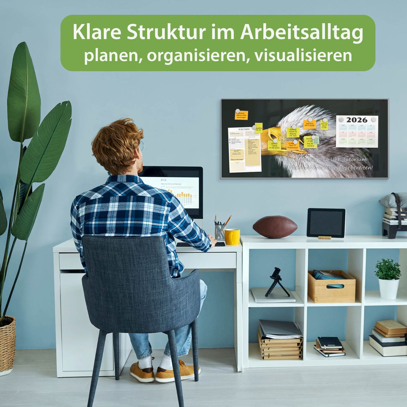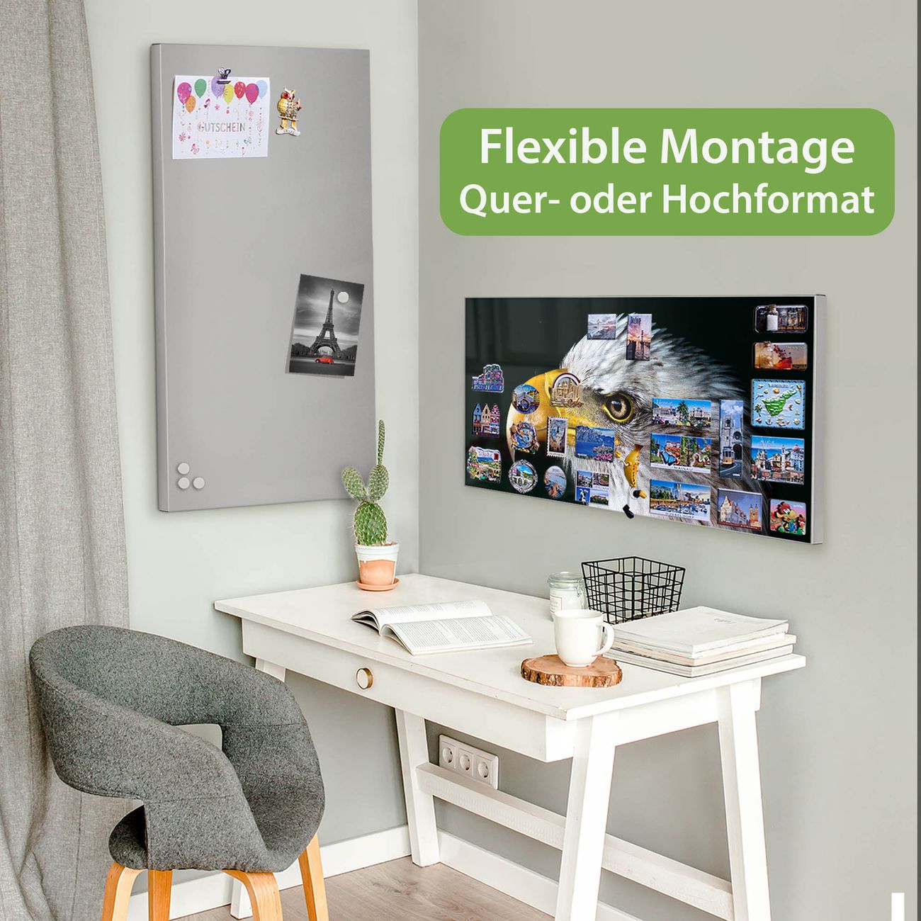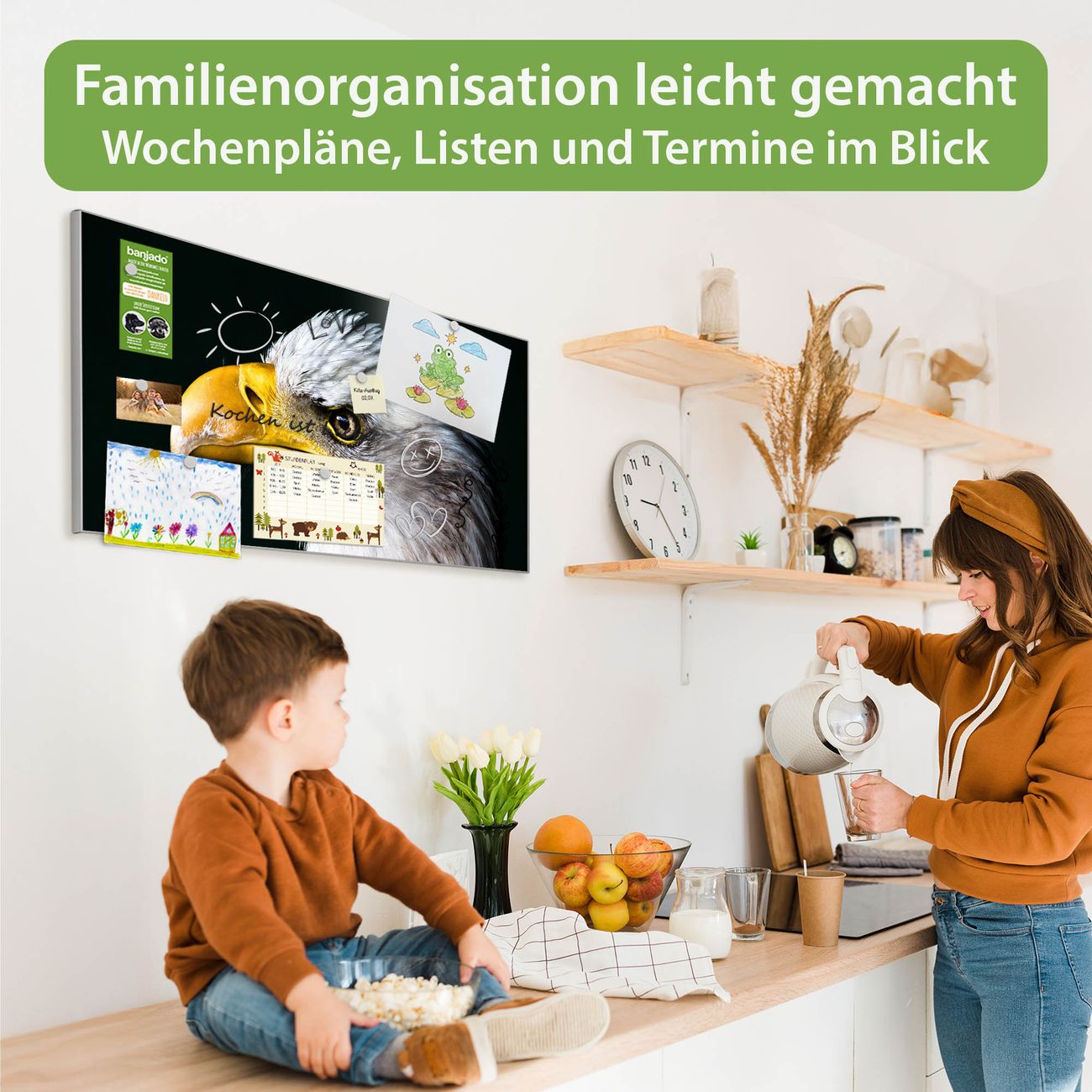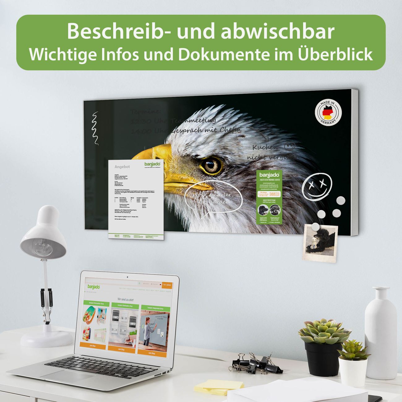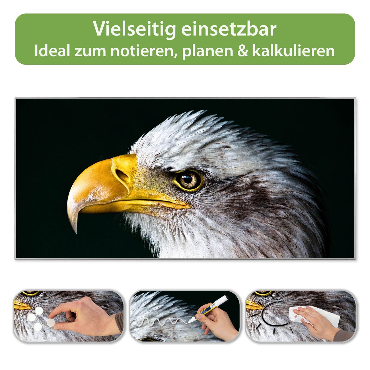 FUNKTION: Die banjado Magnettafel 78x37 cm im Design Motiv Weißkopfseeadler vereint Funktionalität und modernes Wohndesign auf stilvolle Weise. Diese hochwertige Magnetwand aus Metall hilft Ihnen dabei, Notizen, Fotos, Termine, Einkaufslisten oder Rezepte übersichtlich zu organisieren. Als praktisches Memoboard sorgt sie für Struktur im Alltag und setzt gleichzeitig einen dekorativen Akzent an Ihrer Wand. DESIGN: Die Metalltafel besteht aus robustem, lackiertem Stahl und ist mit allen handelsüblichen Magneten nutzbar. Besonders praktisch ist die beschreibbare Oberfläche. Sie können die Magnettafel ganz einfach mit Kreidestiften beschriften und die Inhalte bei Bedarf mit einem feuchten Tuch wieder entfernen. So eignet sich das Memoboard ideal für Wochenpläne, Menüpläne, To Do Listen oder kreative Botschaften. DETAILS: Mit ihrem großzügigen Querformat von 78x37 cm bietet die Magnettafel ausreichend Platz für Ihre Organisation. Das Motiv Motiv Weißkopfseeadler bringt eine warme, natürliche Optik in Küche, Flur, Büro oder Homeoffice und wirkt auch ohne Magnete oder Beschriftung wie ein modernes Wandbild. NUTZEN: Auf der Rückseite befinden sich vorgefertigte Löcher für eine schnelle und unkomplizierte Wandmontage. Jede banjado Magnettafel wird in Deutschland gefertigt und steht für Qualität, Langlebigkeit und liebevolle Verarbeitung. Dieses beschreibbare Memoboard ist die perfekte Kombination aus Metalltafel, Designobjekt und praktischer Magnetwand für Ihren Alltag. BANJADO: Wir sind ein kleines Team aus dem Herzen von Sachsen. Wir fertigen alle Artikel von Hand für Sie an, Sie erhalten keine preiswerte Importware. Auf Wunsch können Sie auch Ihr eigenes Foto auf die Magnettafel aufbringen, schreiben Sie uns an. Herzlichst, Ihr banjado-Team