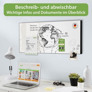 FUNKTION: Die banjado Magnettafel 78x37 cm im Design Motiv Welt in den Händen vereint Funktionalität und modernes Wohndesign auf stilvolle Weise. Diese hochwertige Magnetwand aus Metall hilft Ihnen dabei, Notizen, Fotos, Termine, Einkaufslisten oder Rezepte übersichtlich zu organisieren. Als praktisches Memoboard sorgt sie für Struktur im Alltag und setzt gleichzeitig einen dekorativen Akzent an Ihrer Wand. DESIGN: Die Metalltafel besteht aus robustem, lackiertem Stahl und ist mit allen handelsüblichen Magneten nutzbar. Besonders praktisch ist die beschreibbare Oberfläche. Sie können die Magnettafel ganz einfach mit Kreidestiften beschriften und die Inhalte bei Bedarf mit einem feuchten Tuch wieder entfernen. So eignet sich das Memoboard ideal für Wochenpläne, Menüpläne, To Do Listen oder kreative Botschaften. DETAILS: Mit ihrem großzügigen Querformat von 78x37 cm bietet die Magnettafel ausreichend Platz für Ihre Organisation. Das Motiv Motiv Welt in den Händen bringt eine warme, natürliche Optik in Küche, Flur, Büro oder Homeoffice und wirkt auch ohne Magnete oder Beschriftung wie ein modernes Wandbild. NUTZEN: Auf der Rückseite befinden sich vorgefertigte Löcher für eine schnelle und unkomplizierte Wandmontage. Jede banjado Magnettafel wird in Deutschland gefertigt und steht für Qualität, Langlebigkeit und liebevolle Verarbeitung. Dieses beschreibbare Memoboard ist die perfekte Kombination aus Metalltafel, Designobjekt und praktischer Magnetwand für Ihren Alltag. BANJADO: Wir sind ein kleines Team aus dem Herzen von Sachsen. Wir fertigen alle Artikel von Hand für Sie an, Sie erhalten keine preiswerte Importware. Auf Wunsch können Sie auch Ihr eigenes Foto auf die Magnettafel aufbringen, schreiben Sie uns an. Herzlichst, Ihr banjado-Team