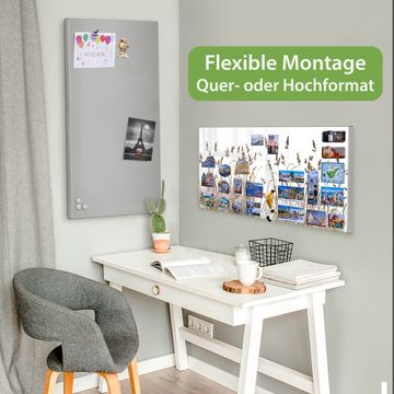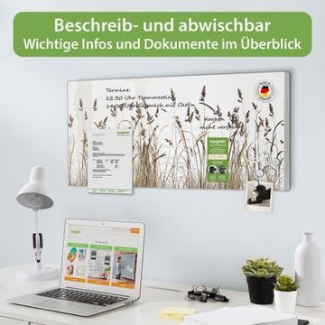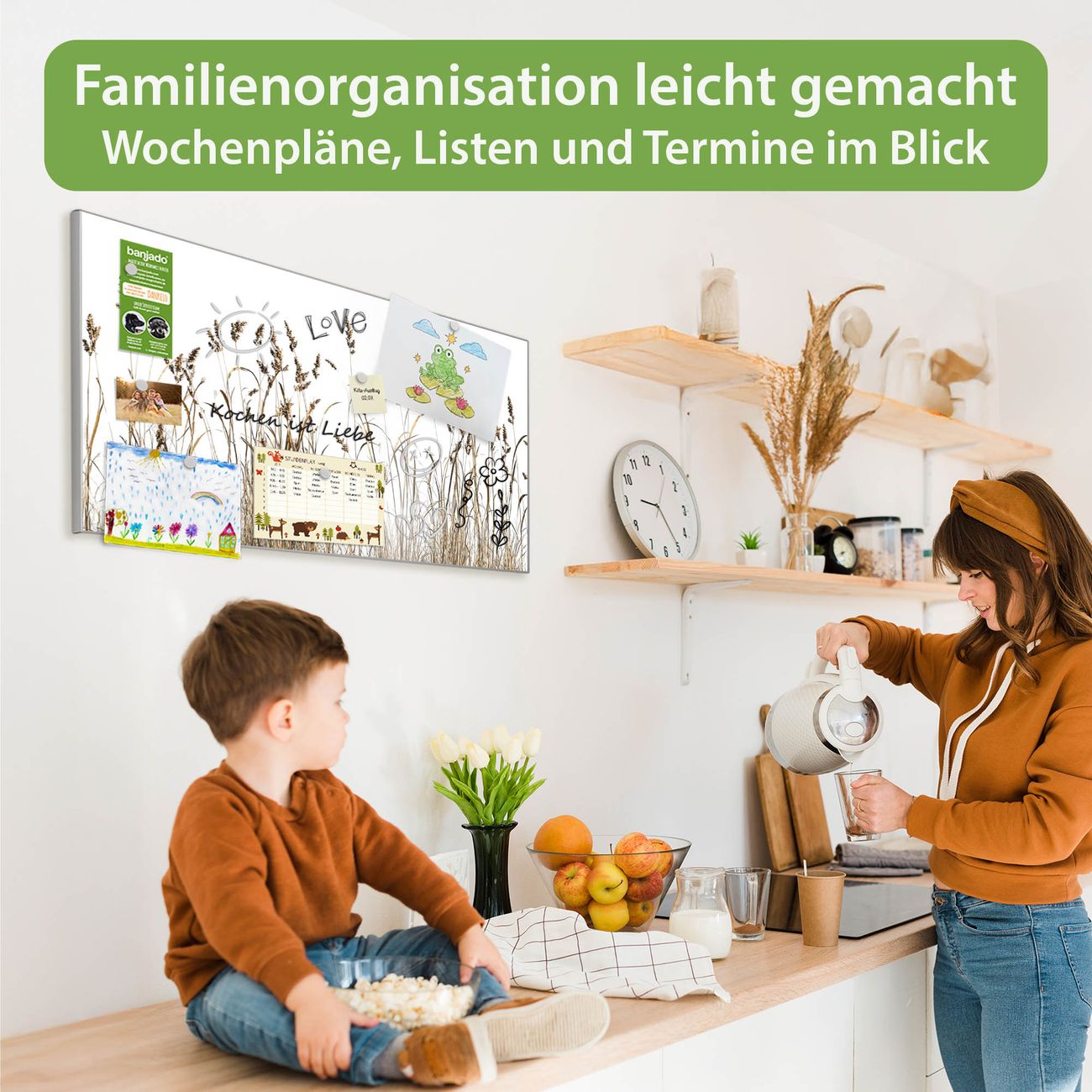 FUNKTION: Die banjado Magnettafel 78x37 cm im Design Motiv Wilde Gräser vereint Funktionalität und modernes Wohndesign auf stilvolle Weise. Diese hochwertige Magnetwand aus Metall hilft Ihnen dabei, Notizen, Fotos, Termine, Einkaufslisten oder Rezepte übersichtlich zu organisieren. Als praktisches Memoboard sorgt sie für Struktur im Alltag und setzt gleichzeitig einen dekorativen Akzent an Ihrer Wand. DESIGN: Die Metalltafel besteht aus robustem, lackiertem Stahl und ist mit allen handelsüblichen Magneten nutzbar. Besonders praktisch ist die beschreibbare Oberfläche. Sie können die Magnettafel ganz einfach mit Kreidestiften beschriften und die Inhalte bei Bedarf mit einem feuchten Tuch wieder entfernen. So eignet sich das Memoboard ideal für Wochenpläne, Menüpläne, To Do Listen oder kreative Botschaften. DETAILS: Mit ihrem großzügigen Querformat von 78x37 cm bietet die Magnettafel ausreichend Platz für Ihre Organisation. Das Motiv Motiv Wilde Gräser bringt eine warme, natürliche Optik in Küche, Flur, Büro oder Homeoffice und wirkt auch ohne Magnete oder Beschriftung wie ein modernes Wandbild. NUTZEN: Auf der Rückseite befinden sich vorgefertigte Löcher für eine schnelle und unkomplizierte Wandmontage. Jede banjado Magnettafel wird in Deutschland gefertigt und steht für Qualität, Langlebigkeit und liebevolle Verarbeitung. Dieses beschreibbare Memoboard ist die perfekte Kombination aus Metalltafel, Designobjekt und praktischer Magnetwand für Ihren Alltag. BANJADO: Wir sind ein kleines Team aus dem Herzen von Sachsen. Wir fertigen alle Artikel von Hand für Sie an, Sie erhalten keine preiswerte Importware. Auf Wunsch können Sie auch Ihr eigenes Foto auf die Magnettafel aufbringen, schreiben Sie uns an. Herzlichst, Ihr banjado-Team