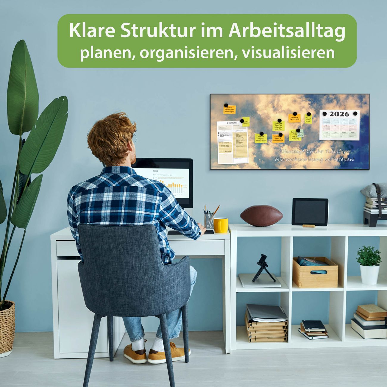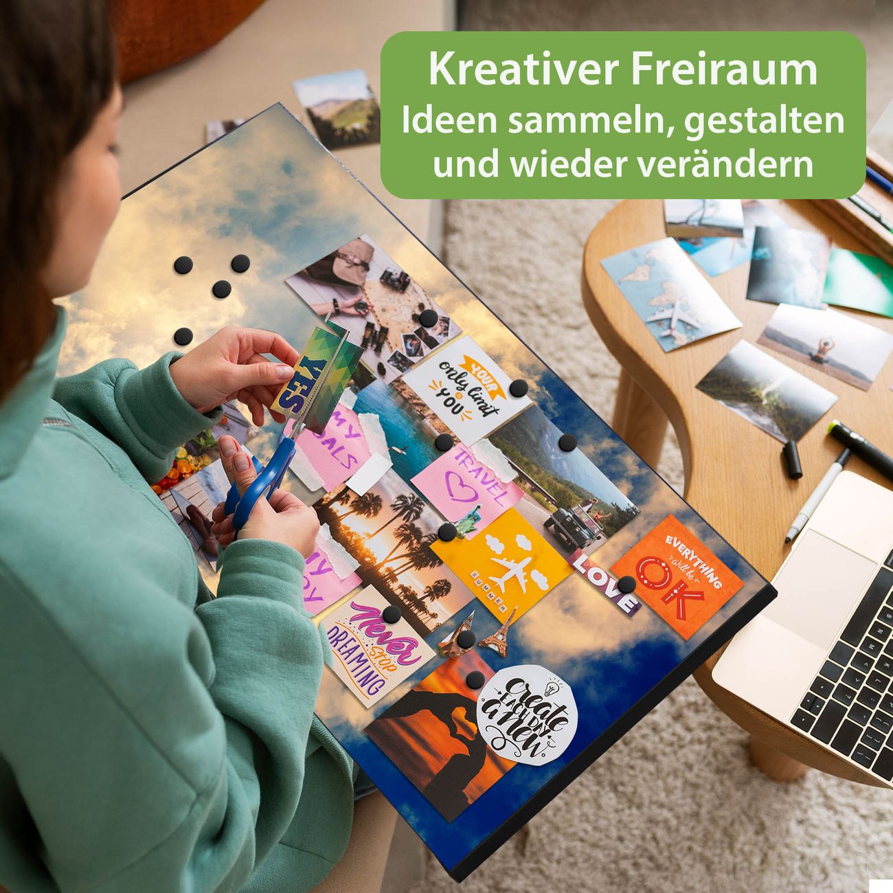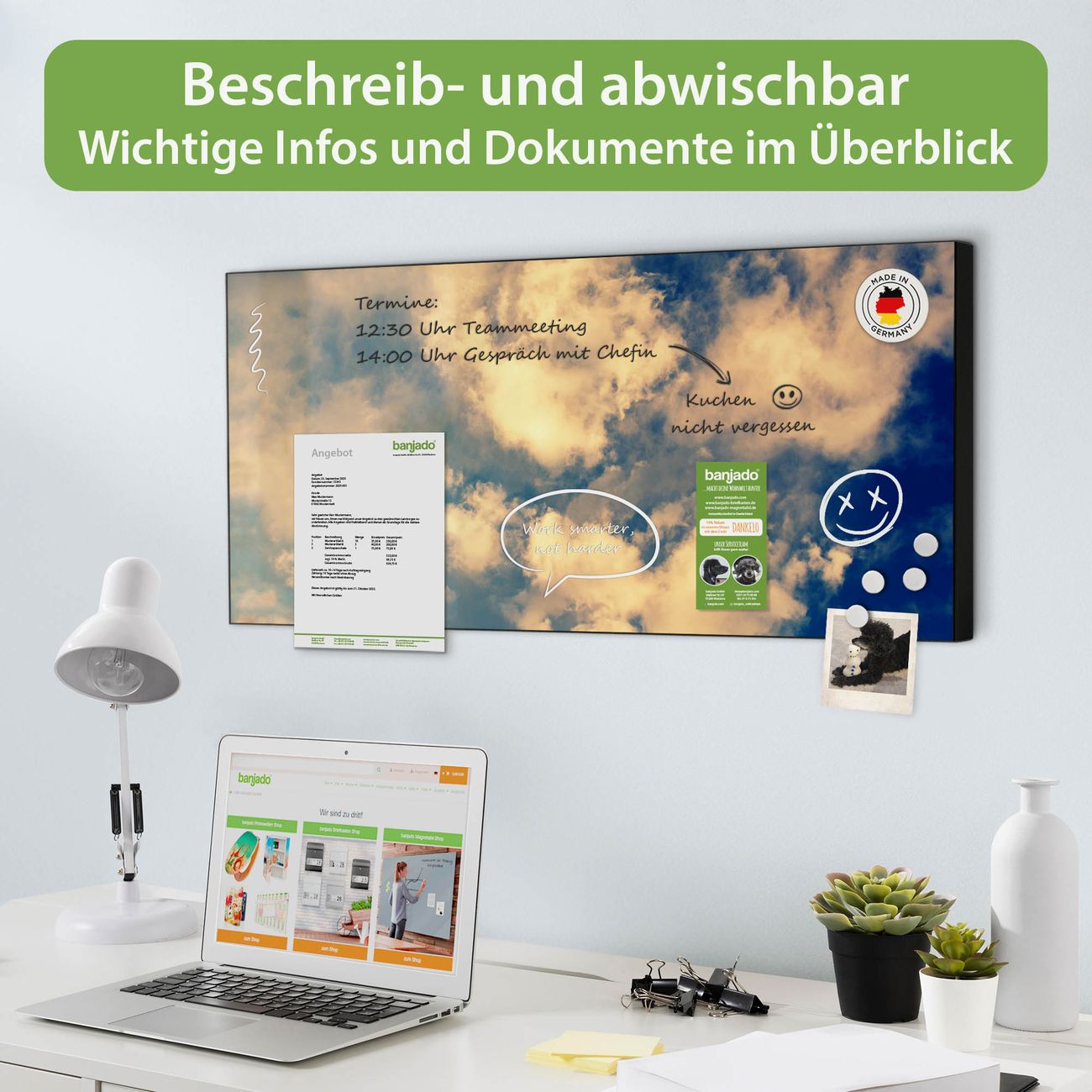 FUNKTION: Die banjado Magnettafel 78x37 cm im Design Motiv Wolken 3 vereint Funktionalität und modernes Wohndesign auf stilvolle Weise. Diese hochwertige Magnetwand aus Metall hilft Ihnen dabei, Notizen, Fotos, Termine, Einkaufslisten oder Rezepte übersichtlich zu organisieren. Als praktisches Memoboard sorgt sie für Struktur im Alltag und setzt gleichzeitig einen dekorativen Akzent an Ihrer Wand. DESIGN: Die Metalltafel besteht aus robustem, lackiertem Stahl und ist mit allen handelsüblichen Magneten nutzbar. Besonders praktisch ist die beschreibbare Oberfläche. Sie können die Magnettafel ganz einfach mit Kreidestiften beschriften und die Inhalte bei Bedarf mit einem feuchten Tuch wieder entfernen. So eignet sich das Memoboard ideal für Wochenpläne, Menüpläne, To Do Listen oder kreative Botschaften. DETAILS: Mit ihrem großzügigen Querformat von 78x37 cm bietet die Magnettafel ausreichend Platz für Ihre Organisation. Das Motiv Motiv Wolken 3 bringt eine warme, natürliche Optik in Küche, Flur, Büro oder Homeoffice und wirkt auch ohne Magnete oder Beschriftung wie ein modernes Wandbild. NUTZEN: Auf der Rückseite befinden sich vorgefertigte Löcher für eine schnelle und unkomplizierte Wandmontage. Jede banjado Magnettafel wird in Deutschland gefertigt und steht für Qualität, Langlebigkeit und liebevolle Verarbeitung. Dieses beschreibbare Memoboard ist die perfekte Kombination aus Metalltafel, Designobjekt und praktischer Magnetwand für Ihren Alltag. BANJADO: Wir sind ein kleines Team aus dem Herzen von Sachsen. Wir fertigen alle Artikel von Hand für Sie an, Sie erhalten keine preiswerte Importware. Auf Wunsch können Sie auch Ihr eigenes Foto auf die Magnettafel aufbringen, schreiben Sie uns an. Herzlichst, Ihr banjado-Team
