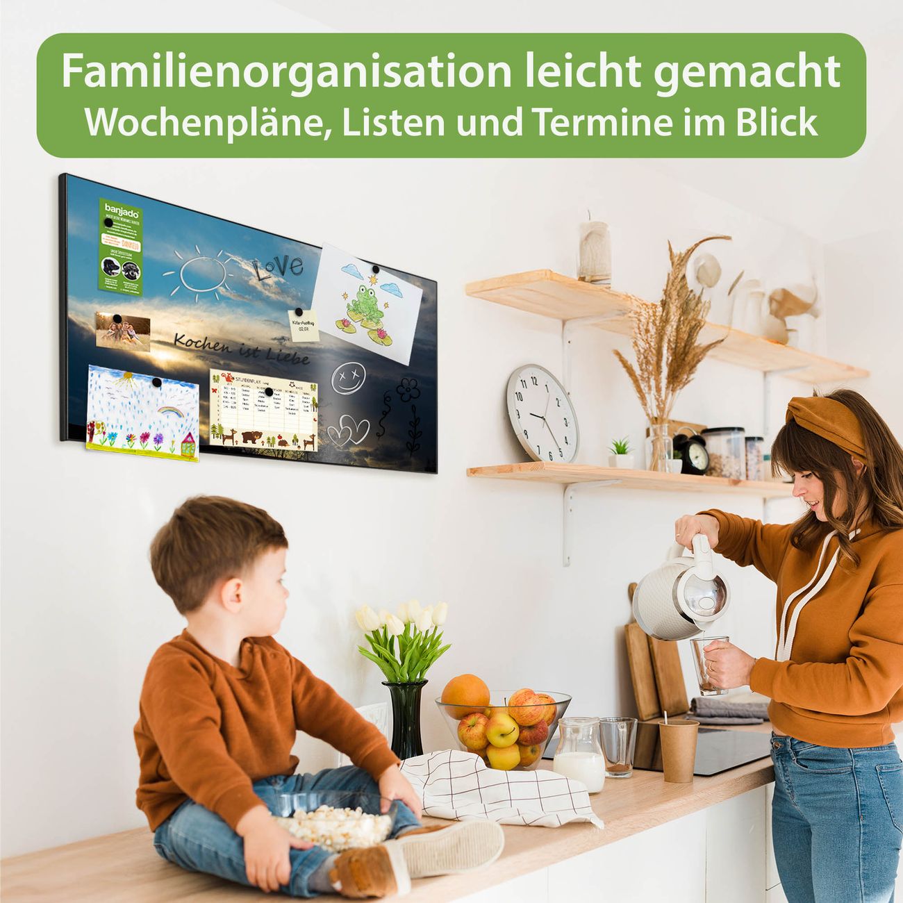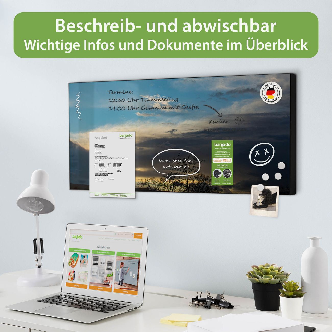 FUNKTION: Die banjado Magnettafel 78x37 cm im Design Motiv Wolken 7 vereint Funktionalität und modernes Wohndesign auf stilvolle Weise. Diese hochwertige Magnetwand aus Metall hilft Ihnen dabei, Notizen, Fotos, Termine, Einkaufslisten oder Rezepte übersichtlich zu organisieren. Als praktisches Memoboard sorgt sie für Struktur im Alltag und setzt gleichzeitig einen dekorativen Akzent an Ihrer Wand. DESIGN: Die Metalltafel besteht aus robustem, lackiertem Stahl und ist mit allen handelsüblichen Magneten nutzbar. Besonders praktisch ist die beschreibbare Oberfläche. Sie können die Magnettafel ganz einfach mit Kreidestiften beschriften und die Inhalte bei Bedarf mit einem feuchten Tuch wieder entfernen. So eignet sich das Memoboard ideal für Wochenpläne, Menüpläne, To Do Listen oder kreative Botschaften. DETAILS: Mit ihrem großzügigen Querformat von 78x37 cm bietet die Magnettafel ausreichend Platz für Ihre Organisation. Das Motiv Motiv Wolken 7 bringt eine warme, natürliche Optik in Küche, Flur, Büro oder Homeoffice und wirkt auch ohne Magnete oder Beschriftung wie ein modernes Wandbild. NUTZEN: Auf der Rückseite befinden sich vorgefertigte Löcher für eine schnelle und unkomplizierte Wandmontage. Jede banjado Magnettafel wird in Deutschland gefertigt und steht für Qualität, Langlebigkeit und liebevolle Verarbeitung. Dieses beschreibbare Memoboard ist die perfekte Kombination aus Metalltafel, Designobjekt und praktischer Magnetwand für Ihren Alltag. BANJADO: Wir sind ein kleines Team aus dem Herzen von Sachsen. Wir fertigen alle Artikel von Hand für Sie an, Sie erhalten keine preiswerte Importware. Auf Wunsch können Sie auch Ihr eigenes Foto auf die Magnettafel aufbringen, schreiben Sie uns an. Herzlichst, Ihr banjado-Team