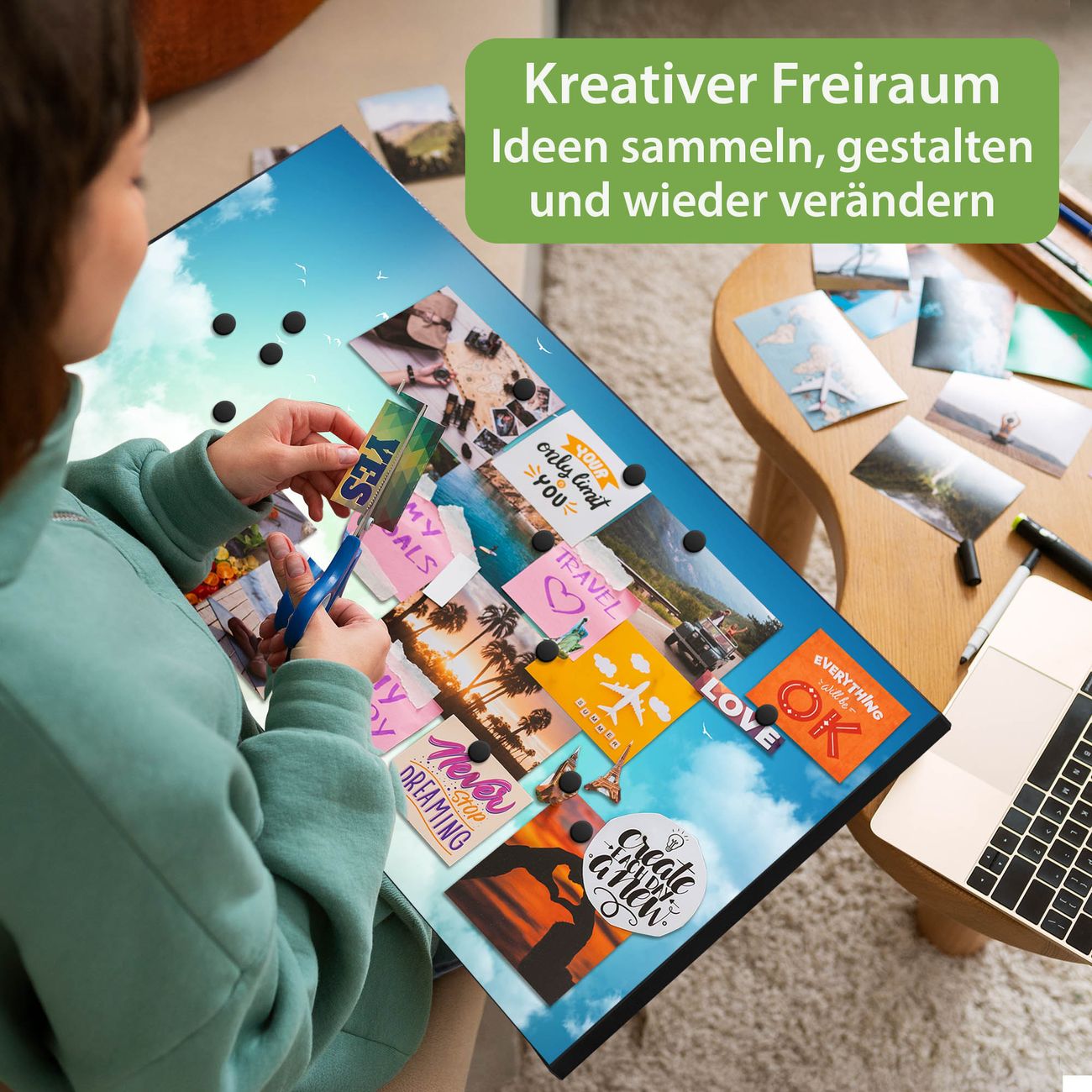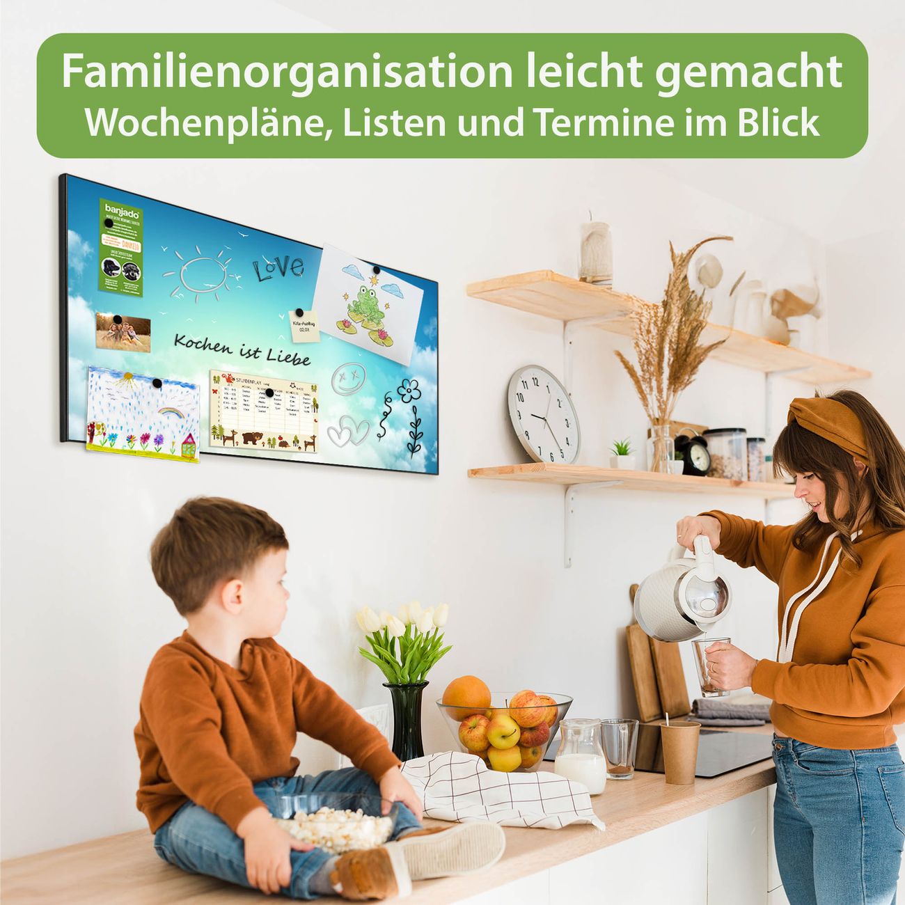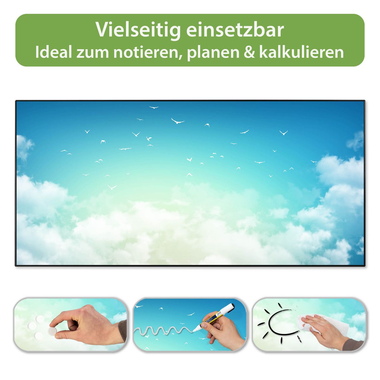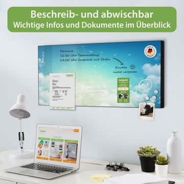 FUNKTION: Die banjado Magnettafel 78x37 cm im Design Motiv Wolken 8 vereint Funktionalität und modernes Wohndesign auf stilvolle Weise. Diese hochwertige Magnetwand aus Metall hilft Ihnen dabei, Notizen, Fotos, Termine, Einkaufslisten oder Rezepte übersichtlich zu organisieren. Als praktisches Memoboard sorgt sie für Struktur im Alltag und setzt gleichzeitig einen dekorativen Akzent an Ihrer Wand. DESIGN: Die Metalltafel besteht aus robustem, lackiertem Stahl und ist mit allen handelsüblichen Magneten nutzbar. Besonders praktisch ist die beschreibbare Oberfläche. Sie können die Magnettafel ganz einfach mit Kreidestiften beschriften und die Inhalte bei Bedarf mit einem feuchten Tuch wieder entfernen. So eignet sich das Memoboard ideal für Wochenpläne, Menüpläne, To Do Listen oder kreative Botschaften. DETAILS: Mit ihrem großzügigen Querformat von 78x37 cm bietet die Magnettafel ausreichend Platz für Ihre Organisation. Das Motiv Motiv Wolken 8 bringt eine warme, natürliche Optik in Küche, Flur, Büro oder Homeoffice und wirkt auch ohne Magnete oder Beschriftung wie ein modernes Wandbild. NUTZEN: Auf der Rückseite befinden sich vorgefertigte Löcher für eine schnelle und unkomplizierte Wandmontage. Jede banjado Magnettafel wird in Deutschland gefertigt und steht für Qualität, Langlebigkeit und liebevolle Verarbeitung. Dieses beschreibbare Memoboard ist die perfekte Kombination aus Metalltafel, Designobjekt und praktischer Magnetwand für Ihren Alltag. BANJADO: Wir sind ein kleines Team aus dem Herzen von Sachsen. Wir fertigen alle Artikel von Hand für Sie an, Sie erhalten keine preiswerte Importware. Auf Wunsch können Sie auch Ihr eigenes Foto auf die Magnettafel aufbringen, schreiben Sie uns an. Herzlichst, Ihr banjado-Team