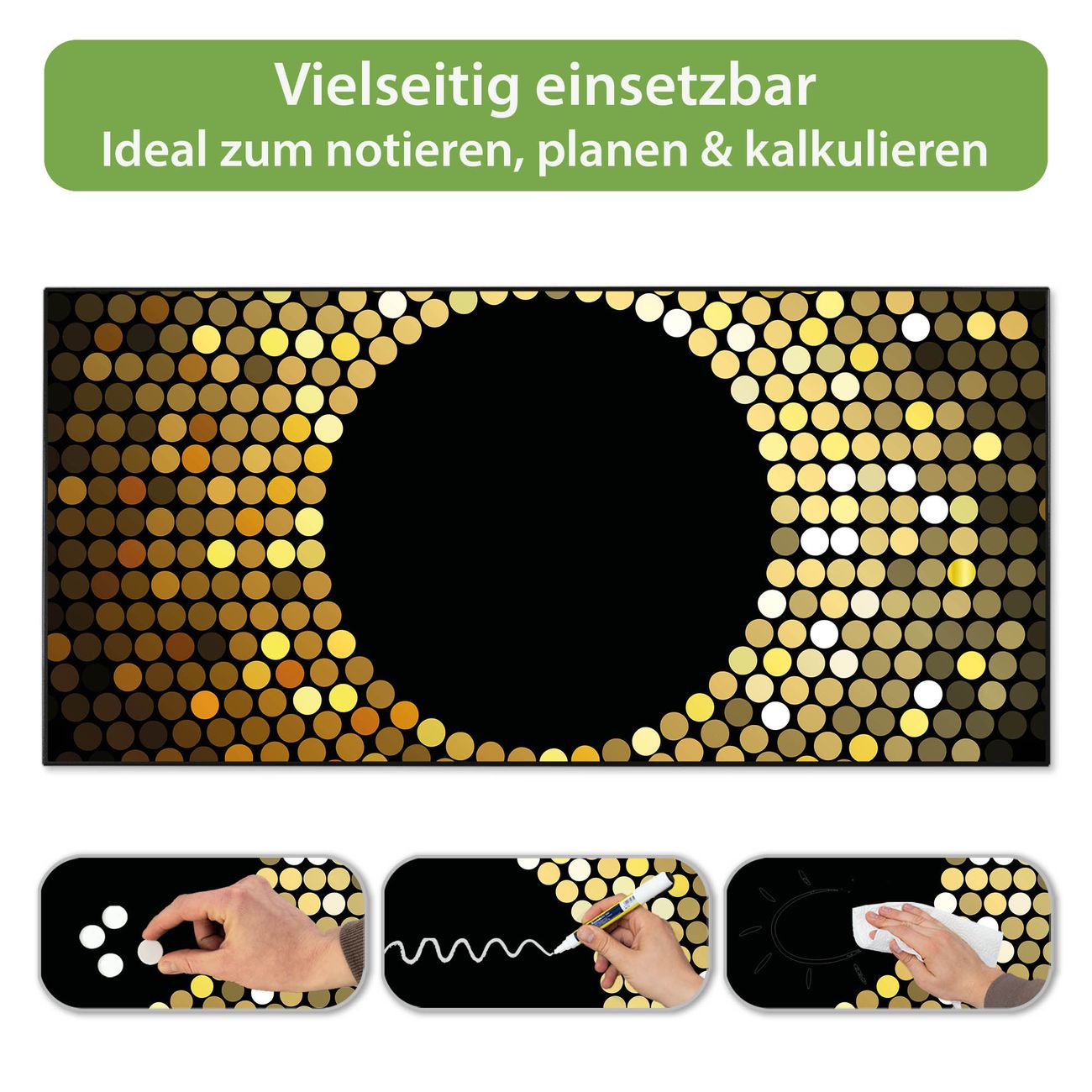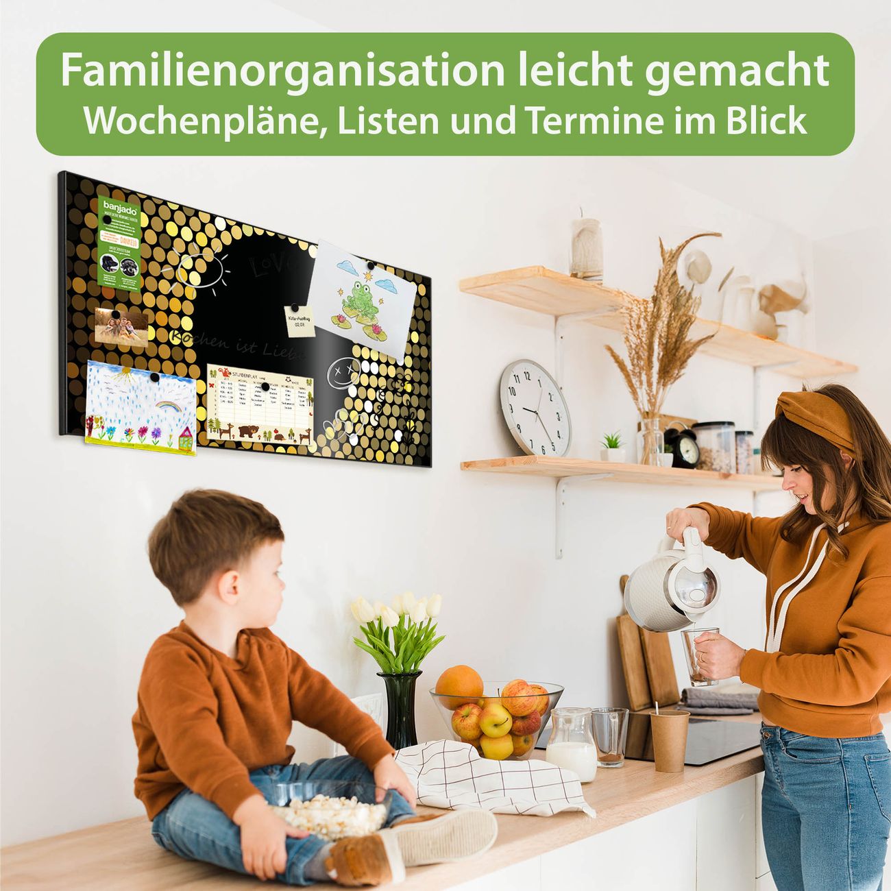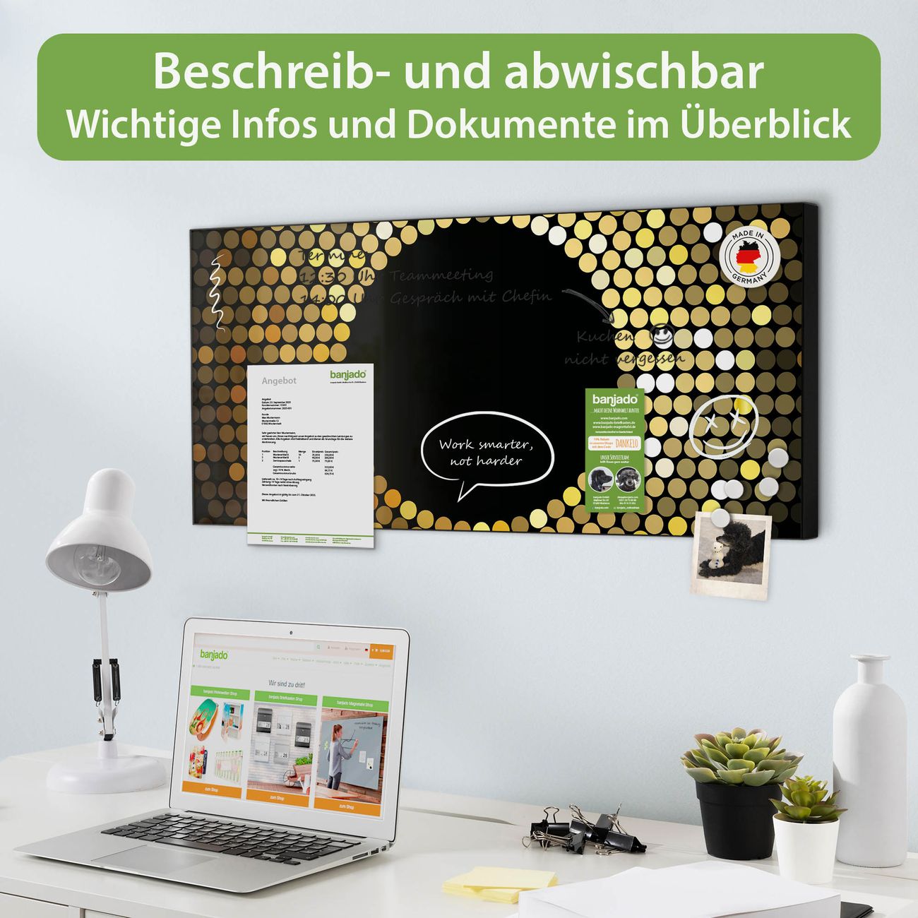 FUNKTION: Die banjado Magnettafel 78x37 cm im Design Motiv WT Gold Disco vereint Funktionalität und modernes Wohndesign auf stilvolle Weise. Diese hochwertige Magnetwand aus Metall hilft Ihnen dabei, Notizen, Fotos, Termine, Einkaufslisten oder Rezepte übersichtlich zu organisieren. Als praktisches Memoboard sorgt sie für Struktur im Alltag und setzt gleichzeitig einen dekorativen Akzent an Ihrer Wand. DESIGN: Die Metalltafel besteht aus robustem, lackiertem Stahl und ist mit allen handelsüblichen Magneten nutzbar. Besonders praktisch ist die beschreibbare Oberfläche. Sie können die Magnettafel ganz einfach mit Kreidestiften beschriften und die Inhalte bei Bedarf mit einem feuchten Tuch wieder entfernen. So eignet sich das Memoboard ideal für Wochenpläne, Menüpläne, To Do Listen oder kreative Botschaften. DETAILS: Mit ihrem großzügigen Querformat von 78x37 cm bietet die Magnettafel ausreichend Platz für Ihre Organisation. Das Motiv Motiv WT Gold Disco bringt eine warme, natürliche Optik in Küche, Flur, Büro oder Homeoffice und wirkt auch ohne Magnete oder Beschriftung wie ein modernes Wandbild. NUTZEN: Auf der Rückseite befinden sich vorgefertigte Löcher für eine schnelle und unkomplizierte Wandmontage. Jede banjado Magnettafel wird in Deutschland gefertigt und steht für Qualität, Langlebigkeit und liebevolle Verarbeitung. Dieses beschreibbare Memoboard ist die perfekte Kombination aus Metalltafel, Designobjekt und praktischer Magnetwand für Ihren Alltag. BANJADO: Wir sind ein kleines Team aus dem Herzen von Sachsen. Wir fertigen alle Artikel von Hand für Sie an, Sie erhalten keine preiswerte Importware. Auf Wunsch können Sie auch Ihr eigenes Foto auf die Magnettafel aufbringen, schreiben Sie uns an. Herzlichst, Ihr banjado-Team