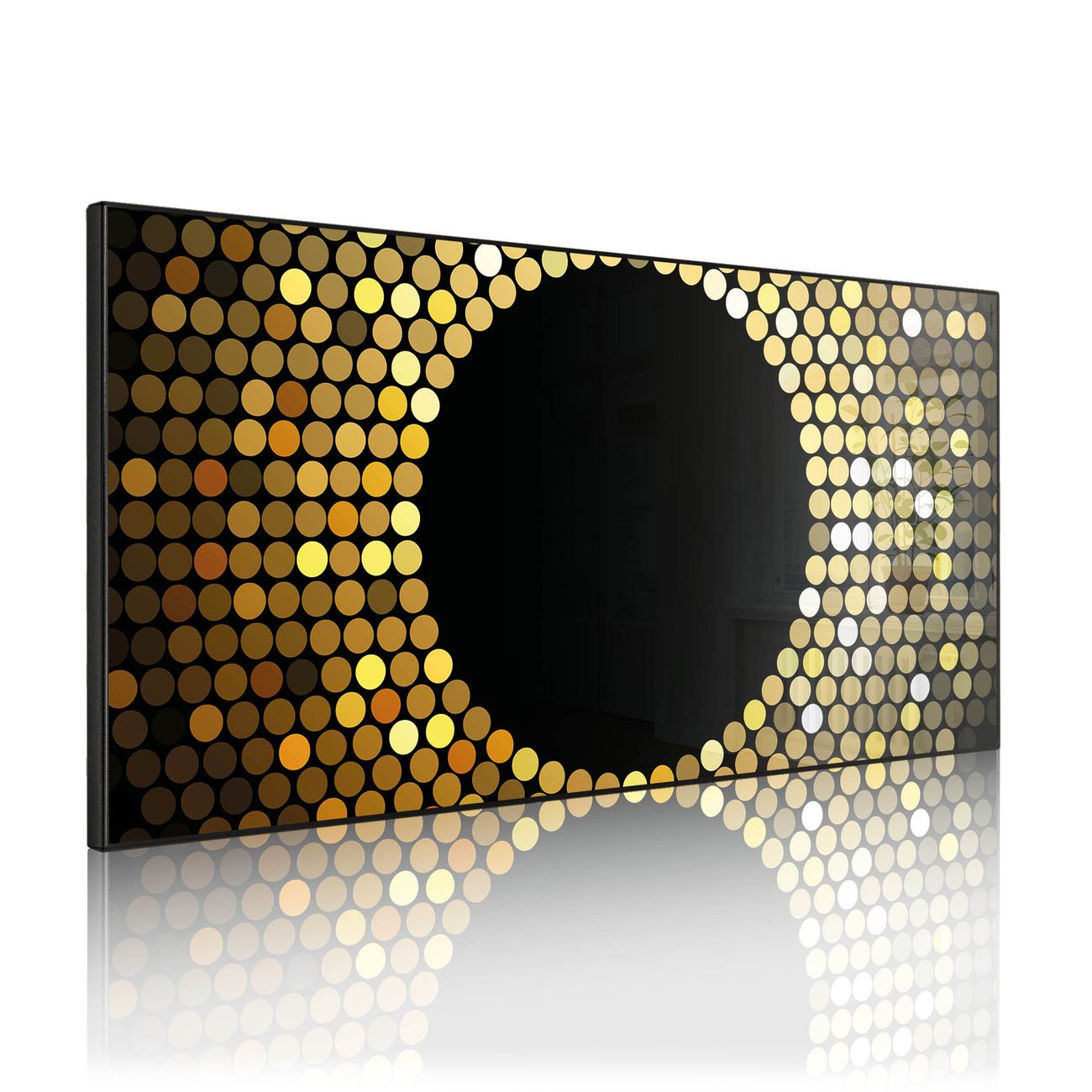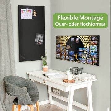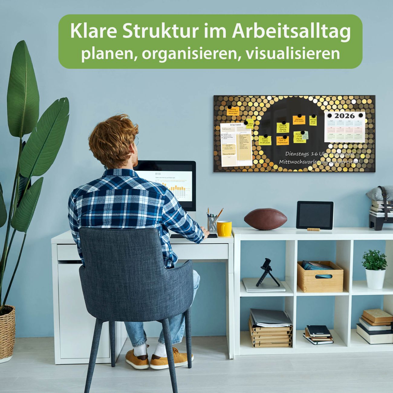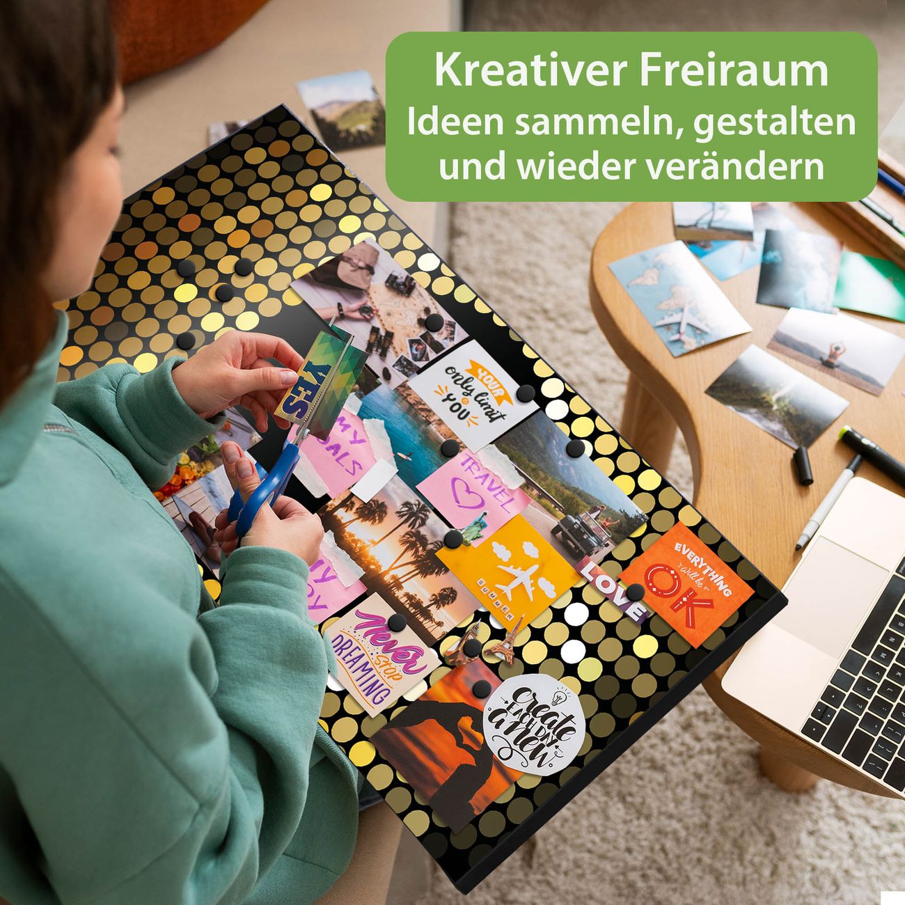 FUNKTION: Die banjado Magnettafel 78x37 cm im Design Motiv WT Gold Disco vereint Funktionalität und modernes Wohndesign auf stilvolle Weise. Diese hochwertige Magnetwand aus Metall hilft Ihnen dabei, Notizen, Fotos, Termine, Einkaufslisten oder Rezepte übersichtlich zu organisieren. Als praktisches Memoboard sorgt sie für Struktur im Alltag und setzt gleichzeitig einen dekorativen Akzent an Ihrer Wand. DESIGN: Die Metalltafel besteht aus robustem, lackiertem Stahl und ist mit allen handelsüblichen Magneten nutzbar. Besonders praktisch ist die beschreibbare Oberfläche. Sie können die Magnettafel ganz einfach mit Kreidestiften beschriften und die Inhalte bei Bedarf mit einem feuchten Tuch wieder entfernen. So eignet sich das Memoboard ideal für Wochenpläne, Menüpläne, To Do Listen oder kreative Botschaften. DETAILS: Mit ihrem großzügigen Querformat von 78x37 cm bietet die Magnettafel ausreichend Platz für Ihre Organisation. Das Motiv Motiv WT Gold Disco bringt eine warme, natürliche Optik in Küche, Flur, Büro oder Homeoffice und wirkt auch ohne Magnete oder Beschriftung wie ein modernes Wandbild. NUTZEN: Auf der Rückseite befinden sich vorgefertigte Löcher für eine schnelle und unkomplizierte Wandmontage. Jede banjado Magnettafel wird in Deutschland gefertigt und steht für Qualität, Langlebigkeit und liebevolle Verarbeitung. Dieses beschreibbare Memoboard ist die perfekte Kombination aus Metalltafel, Designobjekt und praktischer Magnetwand für Ihren Alltag. BANJADO: Wir sind ein kleines Team aus dem Herzen von Sachsen. Wir fertigen alle Artikel von Hand für Sie an, Sie erhalten keine preiswerte Importware. Auf Wunsch können Sie auch Ihr eigenes Foto auf die Magnettafel aufbringen, schreiben Sie uns an. Herzlichst, Ihr banjado-Team