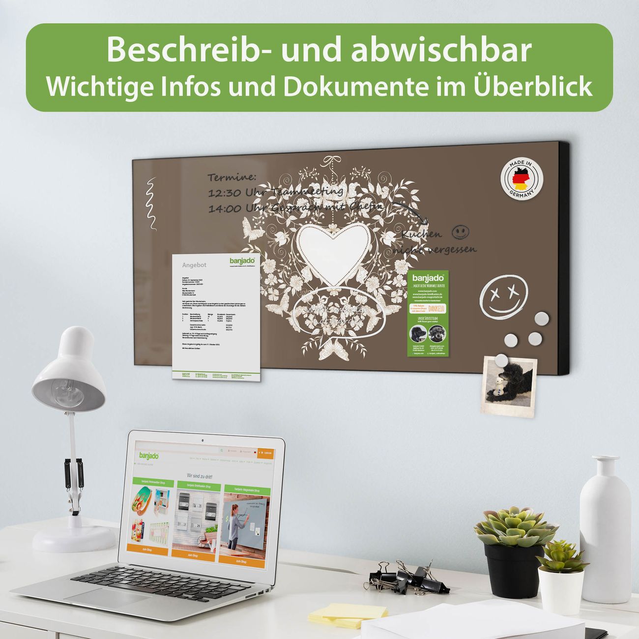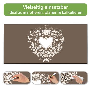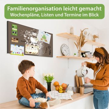 FUNKTION: Die banjado Magnettafel 78x37 cm im Design Motiv WT Schmetterlinge vereint Funktionalität und modernes Wohndesign auf stilvolle Weise. Diese hochwertige Magnetwand aus Metall hilft Ihnen dabei, Notizen, Fotos, Termine, Einkaufslisten oder Rezepte übersichtlich zu organisieren. Als praktisches Memoboard sorgt sie für Struktur im Alltag und setzt gleichzeitig einen dekorativen Akzent an Ihrer Wand. DESIGN: Die Metalltafel besteht aus robustem, lackiertem Stahl und ist mit allen handelsüblichen Magneten nutzbar. Besonders praktisch ist die beschreibbare Oberfläche. Sie können die Magnettafel ganz einfach mit Kreidestiften beschriften und die Inhalte bei Bedarf mit einem feuchten Tuch wieder entfernen. So eignet sich das Memoboard ideal für Wochenpläne, Menüpläne, To Do Listen oder kreative Botschaften. DETAILS: Mit ihrem großzügigen Querformat von 78x37 cm bietet die Magnettafel ausreichend Platz für Ihre Organisation. Das Motiv Motiv WT Schmetterlinge bringt eine warme, natürliche Optik in Küche, Flur, Büro oder Homeoffice und wirkt auch ohne Magnete oder Beschriftung wie ein modernes Wandbild. NUTZEN: Auf der Rückseite befinden sich vorgefertigte Löcher für eine schnelle und unkomplizierte Wandmontage. Jede banjado Magnettafel wird in Deutschland gefertigt und steht für Qualität, Langlebigkeit und liebevolle Verarbeitung. Dieses beschreibbare Memoboard ist die perfekte Kombination aus Metalltafel, Designobjekt und praktischer Magnetwand für Ihren Alltag. BANJADO: Wir sind ein kleines Team aus dem Herzen von Sachsen. Wir fertigen alle Artikel von Hand für Sie an, Sie erhalten keine preiswerte Importware. Auf Wunsch können Sie auch Ihr eigenes Foto auf die Magnettafel aufbringen, schreiben Sie uns an. Herzlichst, Ihr banjado-Team