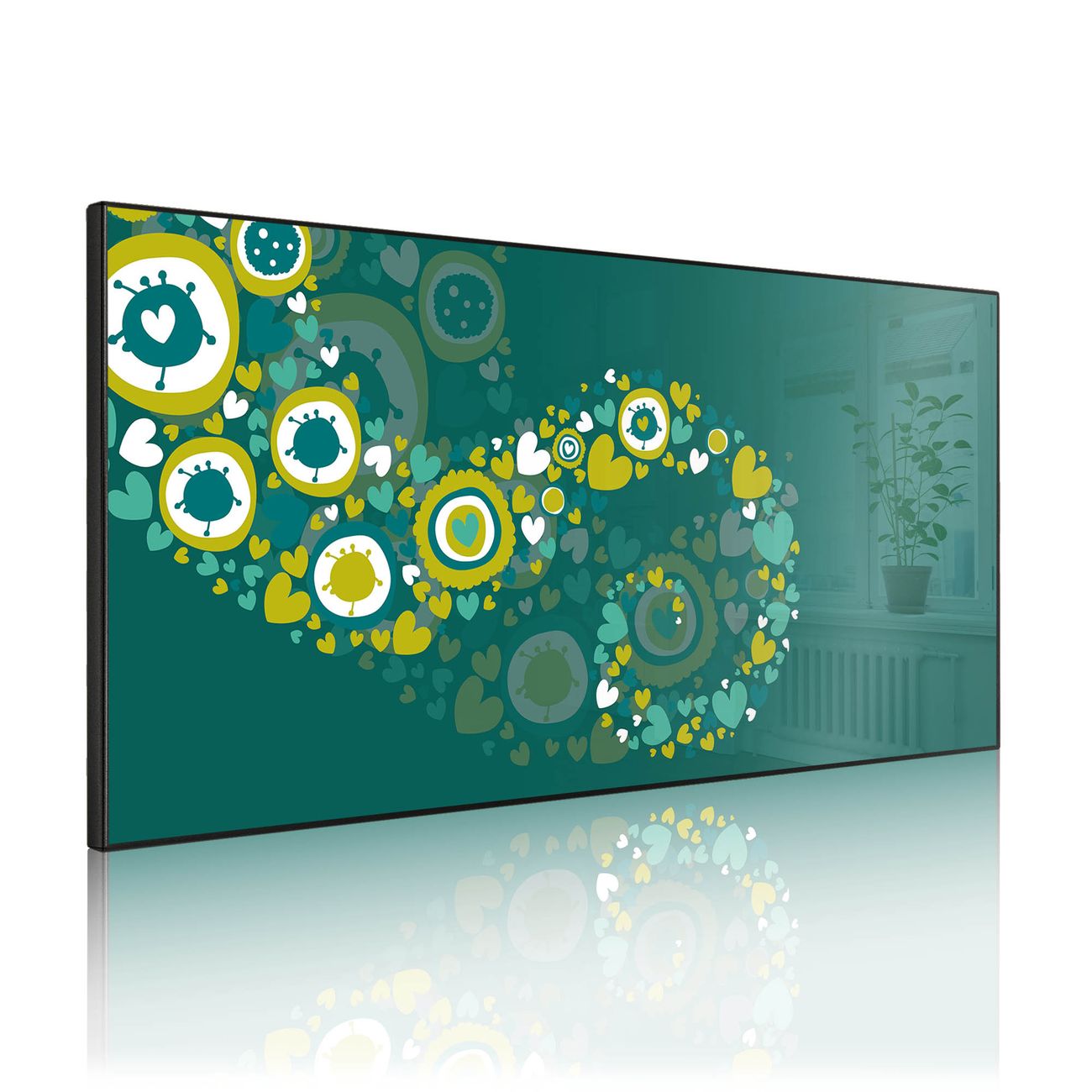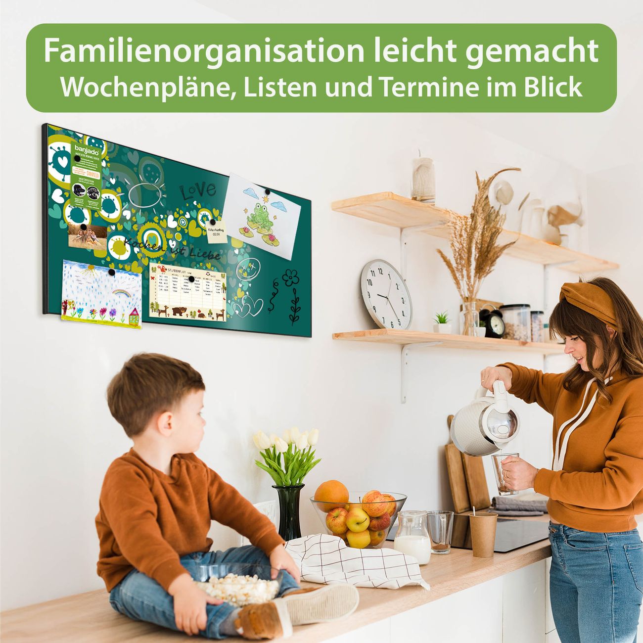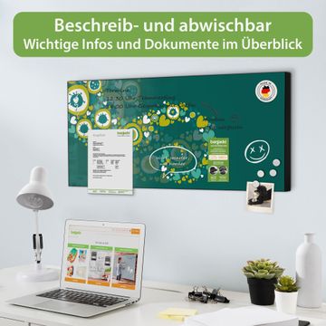 FUNKTION: Die banjado Magnettafel 78x37 cm im Design Motiv WT Strömende Herzen vereint Funktionalität und modernes Wohndesign auf stilvolle Weise. Diese hochwertige Magnetwand aus Metall hilft Ihnen dabei, Notizen, Fotos, Termine, Einkaufslisten oder Rezepte übersichtlich zu organisieren. Als praktisches Memoboard sorgt sie für Struktur im Alltag und setzt gleichzeitig einen dekorativen Akzent an Ihrer Wand. DESIGN: Die Metalltafel besteht aus robustem, lackiertem Stahl und ist mit allen handelsüblichen Magneten nutzbar. Besonders praktisch ist die beschreibbare Oberfläche. Sie können die Magnettafel ganz einfach mit Kreidestiften beschriften und die Inhalte bei Bedarf mit einem feuchten Tuch wieder entfernen. So eignet sich das Memoboard ideal für Wochenpläne, Menüpläne, To Do Listen oder kreative Botschaften. DETAILS: Mit ihrem großzügigen Querformat von 78x37 cm bietet die Magnettafel ausreichend Platz für Ihre Organisation. Das Motiv Motiv WT Strömende Herzen bringt eine warme, natürliche Optik in Küche, Flur, Büro oder Homeoffice und wirkt auch ohne Magnete oder Beschriftung wie ein modernes Wandbild. NUTZEN: Auf der Rückseite befinden sich vorgefertigte Löcher für eine schnelle und unkomplizierte Wandmontage. Jede banjado Magnettafel wird in Deutschland gefertigt und steht für Qualität, Langlebigkeit und liebevolle Verarbeitung. Dieses beschreibbare Memoboard ist die perfekte Kombination aus Metalltafel, Designobjekt und praktischer Magnetwand für Ihren Alltag. BANJADO: Wir sind ein kleines Team aus dem Herzen von Sachsen. Wir fertigen alle Artikel von Hand für Sie an, Sie erhalten keine preiswerte Importware. Auf Wunsch können Sie auch Ihr eigenes Foto auf die Magnettafel aufbringen, schreiben Sie uns an. Herzlichst, Ihr banjado-Team