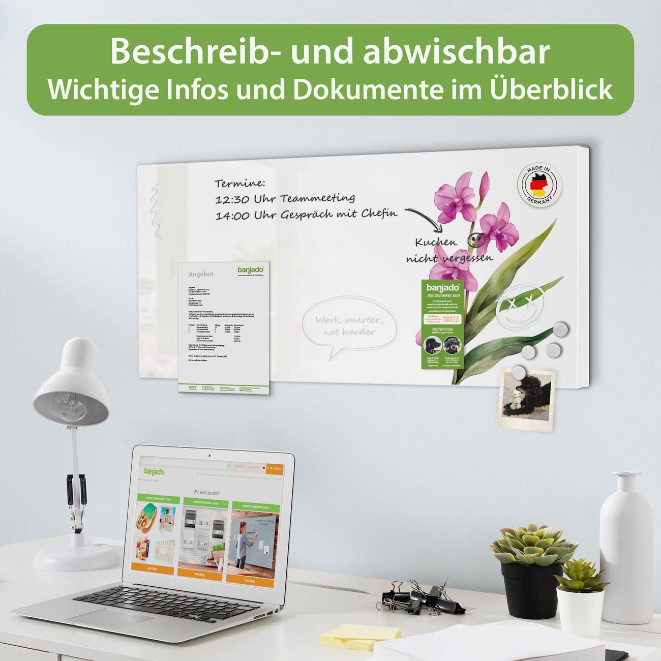 FUNKTION: Die banjado Magnettafel 78x37 cm im Design Motiv Zarte Orchidee vereint Funktionalität und modernes Wohndesign auf stilvolle Weise. Diese hochwertige Magnetwand aus Metall hilft Ihnen dabei, Notizen, Fotos, Termine, Einkaufslisten oder Rezepte übersichtlich zu organisieren. Als praktisches Memoboard sorgt sie für Struktur im Alltag und setzt gleichzeitig einen dekorativen Akzent an Ihrer Wand. DESIGN: Die Metalltafel besteht aus robustem, lackiertem Stahl und ist mit allen handelsüblichen Magneten nutzbar. Besonders praktisch ist die beschreibbare Oberfläche. Sie können die Magnettafel ganz einfach mit Kreidestiften beschriften und die Inhalte bei Bedarf mit einem feuchten Tuch wieder entfernen. So eignet sich das Memoboard ideal für Wochenpläne, Menüpläne, To Do Listen oder kreative Botschaften. DETAILS: Mit ihrem großzügigen Querformat von 78x37 cm bietet die Magnettafel ausreichend Platz für Ihre Organisation. Das Motiv Motiv Zarte Orchidee bringt eine warme, natürliche Optik in Küche, Flur, Büro oder Homeoffice und wirkt auch ohne Magnete oder Beschriftung wie ein modernes Wandbild. NUTZEN: Auf der Rückseite befinden sich vorgefertigte Löcher für eine schnelle und unkomplizierte Wandmontage. Jede banjado Magnettafel wird in Deutschland gefertigt und steht für Qualität, Langlebigkeit und liebevolle Verarbeitung. Dieses beschreibbare Memoboard ist die perfekte Kombination aus Metalltafel, Designobjekt und praktischer Magnetwand für Ihren Alltag. BANJADO: Wir sind ein kleines Team aus dem Herzen von Sachsen. Wir fertigen alle Artikel von Hand für Sie an, Sie erhalten keine preiswerte Importware. Auf Wunsch können Sie auch Ihr eigenes Foto auf die Magnettafel aufbringen, schreiben Sie uns an. Herzlichst, Ihr banjado-Team