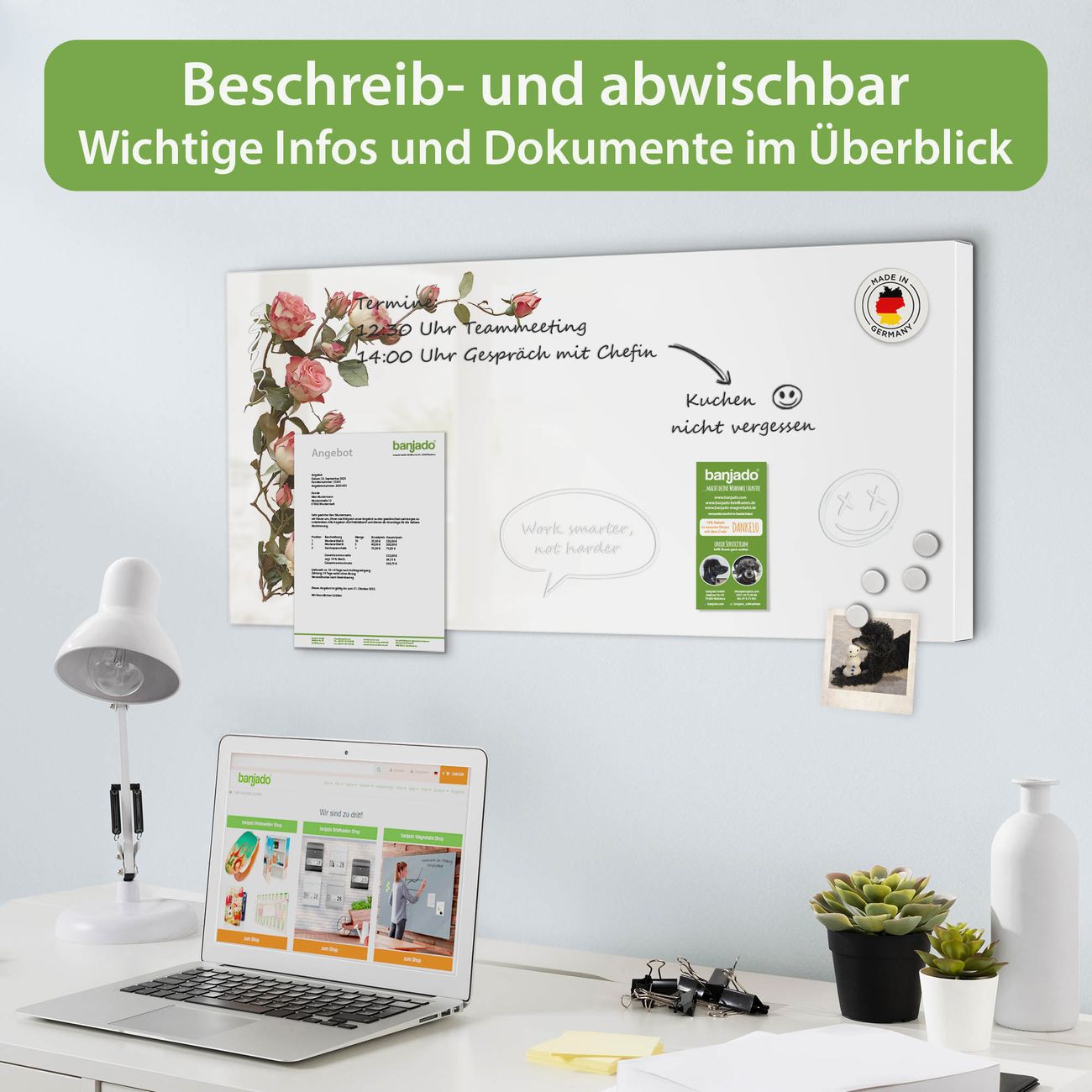 FUNKTION: Die banjado Magnettafel 78x37 cm im Design Motiv Zarte Rosenranken vereint Funktionalität und modernes Wohndesign auf stilvolle Weise. Diese hochwertige Magnetwand aus Metall hilft Ihnen dabei, Notizen, Fotos, Termine, Einkaufslisten oder Rezepte übersichtlich zu organisieren. Als praktisches Memoboard sorgt sie für Struktur im Alltag und setzt gleichzeitig einen dekorativen Akzent an Ihrer Wand. DESIGN: Die Metalltafel besteht aus robustem, lackiertem Stahl und ist mit allen handelsüblichen Magneten nutzbar. Besonders praktisch ist die beschreibbare Oberfläche. Sie können die Magnettafel ganz einfach mit Kreidestiften beschriften und die Inhalte bei Bedarf mit einem feuchten Tuch wieder entfernen. So eignet sich das Memoboard ideal für Wochenpläne, Menüpläne, To Do Listen oder kreative Botschaften. DETAILS: Mit ihrem großzügigen Querformat von 78x37 cm bietet die Magnettafel ausreichend Platz für Ihre Organisation. Das Motiv Motiv Zarte Rosenranken bringt eine warme, natürliche Optik in Küche, Flur, Büro oder Homeoffice und wirkt auch ohne Magnete oder Beschriftung wie ein modernes Wandbild. NUTZEN: Auf der Rückseite befinden sich vorgefertigte Löcher für eine schnelle und unkomplizierte Wandmontage. Jede banjado Magnettafel wird in Deutschland gefertigt und steht für Qualität, Langlebigkeit und liebevolle Verarbeitung. Dieses beschreibbare Memoboard ist die perfekte Kombination aus Metalltafel, Designobjekt und praktischer Magnetwand für Ihren Alltag. BANJADO: Wir sind ein kleines Team aus dem Herzen von Sachsen. Wir fertigen alle Artikel von Hand für Sie an, Sie erhalten keine preiswerte Importware. Auf Wunsch können Sie auch Ihr eigenes Foto auf die Magnettafel aufbringen, schreiben Sie uns an. Herzlichst, Ihr banjado-Team