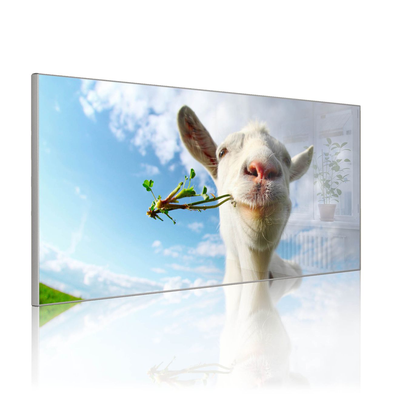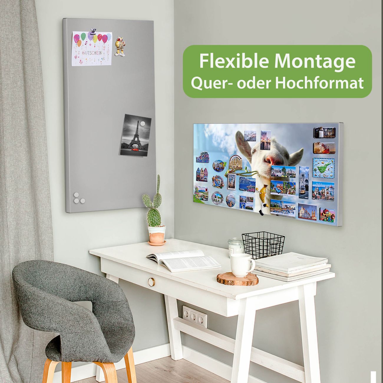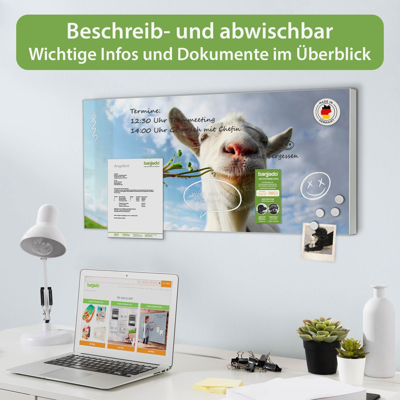 FUNKTION: Die banjado Magnettafel 78x37 cm im Design Motiv Ziege 2 vereint Funktionalität und modernes Wohndesign auf stilvolle Weise. Diese hochwertige Magnetwand aus Metall hilft Ihnen dabei, Notizen, Fotos, Termine, Einkaufslisten oder Rezepte übersichtlich zu organisieren. Als praktisches Memoboard sorgt sie für Struktur im Alltag und setzt gleichzeitig einen dekorativen Akzent an Ihrer Wand. DESIGN: Die Metalltafel besteht aus robustem, lackiertem Stahl und ist mit allen handelsüblichen Magneten nutzbar. Besonders praktisch ist die beschreibbare Oberfläche. Sie können die Magnettafel ganz einfach mit Kreidestiften beschriften und die Inhalte bei Bedarf mit einem feuchten Tuch wieder entfernen. So eignet sich das Memoboard ideal für Wochenpläne, Menüpläne, To Do Listen oder kreative Botschaften. DETAILS: Mit ihrem großzügigen Querformat von 78x37 cm bietet die Magnettafel ausreichend Platz für Ihre Organisation. Das Motiv Motiv Ziege 2 bringt eine warme, natürliche Optik in Küche, Flur, Büro oder Homeoffice und wirkt auch ohne Magnete oder Beschriftung wie ein modernes Wandbild. NUTZEN: Auf der Rückseite befinden sich vorgefertigte Löcher für eine schnelle und unkomplizierte Wandmontage. Jede banjado Magnettafel wird in Deutschland gefertigt und steht für Qualität, Langlebigkeit und liebevolle Verarbeitung. Dieses beschreibbare Memoboard ist die perfekte Kombination aus Metalltafel, Designobjekt und praktischer Magnetwand für Ihren Alltag. BANJADO: Wir sind ein kleines Team aus dem Herzen von Sachsen. Wir fertigen alle Artikel von Hand für Sie an, Sie erhalten keine preiswerte Importware. Auf Wunsch können Sie auch Ihr eigenes Foto auf die Magnettafel aufbringen, schreiben Sie uns an. Herzlichst, Ihr banjado-Team