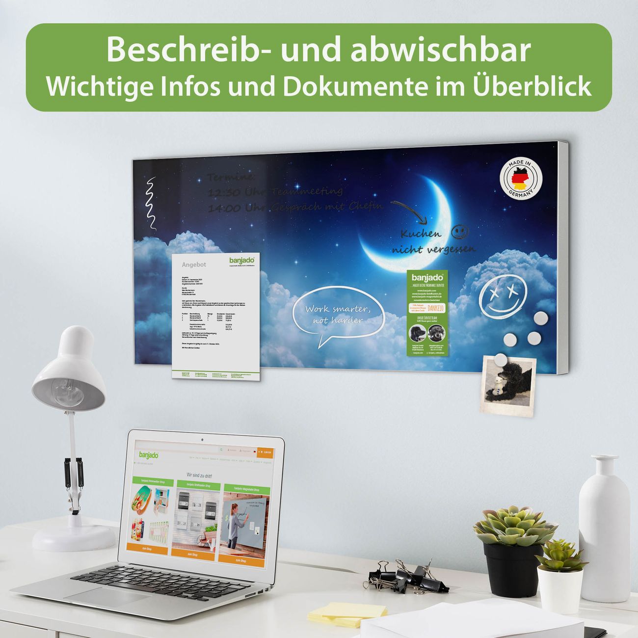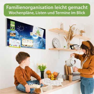 FUNKTION: Die banjado Magnettafel 78x37 cm im Design Motiv zunehmender Mond vereint Funktionalität und modernes Wohndesign auf stilvolle Weise. Diese hochwertige Magnetwand aus Metall hilft Ihnen dabei, Notizen, Fotos, Termine, Einkaufslisten oder Rezepte übersichtlich zu organisieren. Als praktisches Memoboard sorgt sie für Struktur im Alltag und setzt gleichzeitig einen dekorativen Akzent an Ihrer Wand. DESIGN: Die Metalltafel besteht aus robustem, lackiertem Stahl und ist mit allen handelsüblichen Magneten nutzbar. Besonders praktisch ist die beschreibbare Oberfläche. Sie können die Magnettafel ganz einfach mit Kreidestiften beschriften und die Inhalte bei Bedarf mit einem feuchten Tuch wieder entfernen. So eignet sich das Memoboard ideal für Wochenpläne, Menüpläne, To Do Listen oder kreative Botschaften. DETAILS: Mit ihrem großzügigen Querformat von 78x37 cm bietet die Magnettafel ausreichend Platz für Ihre Organisation. Das Motiv Motiv zunehmender Mond bringt eine warme, natürliche Optik in Küche, Flur, Büro oder Homeoffice und wirkt auch ohne Magnete oder Beschriftung wie ein modernes Wandbild. NUTZEN: Auf der Rückseite befinden sich vorgefertigte Löcher für eine schnelle und unkomplizierte Wandmontage. Jede banjado Magnettafel wird in Deutschland gefertigt und steht für Qualität, Langlebigkeit und liebevolle Verarbeitung. Dieses beschreibbare Memoboard ist die perfekte Kombination aus Metalltafel, Designobjekt und praktischer Magnetwand für Ihren Alltag. BANJADO: Wir sind ein kleines Team aus dem Herzen von Sachsen. Wir fertigen alle Artikel von Hand für Sie an, Sie erhalten keine preiswerte Importware. Auf Wunsch können Sie auch Ihr eigenes Foto auf die Magnettafel aufbringen, schreiben Sie uns an. Herzlichst, Ihr banjado-Team