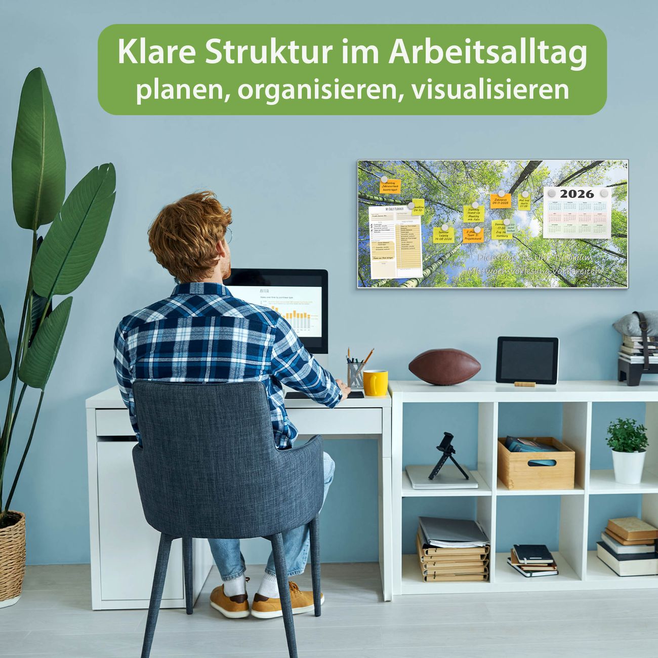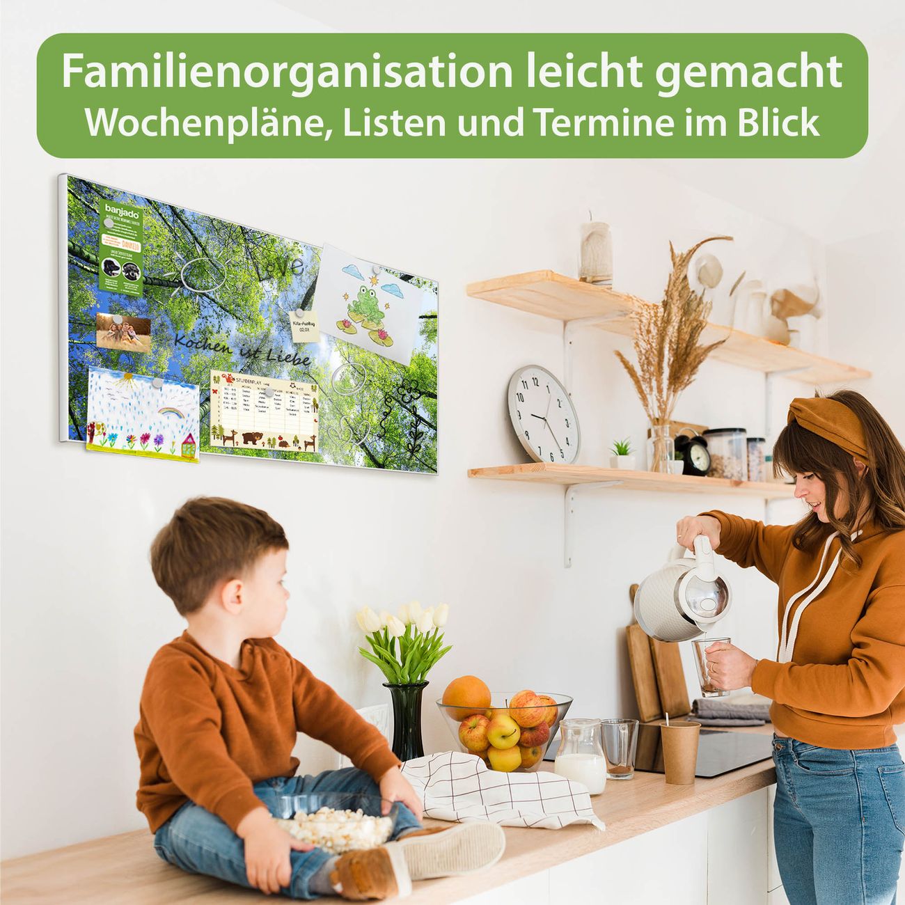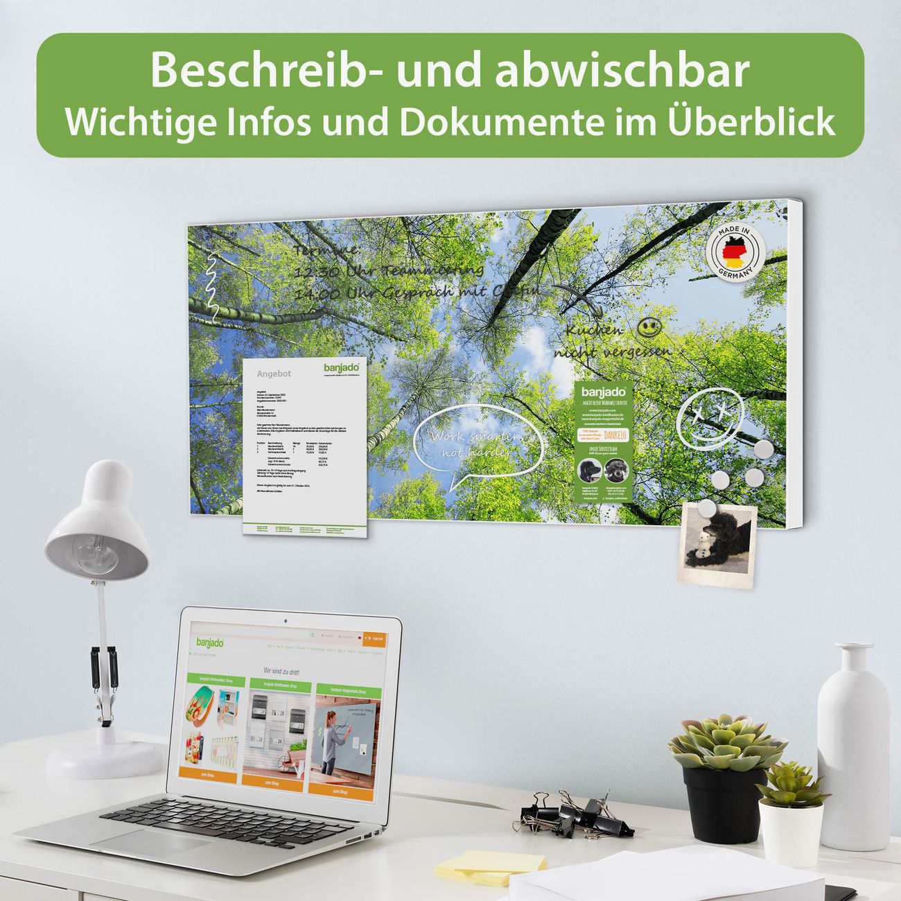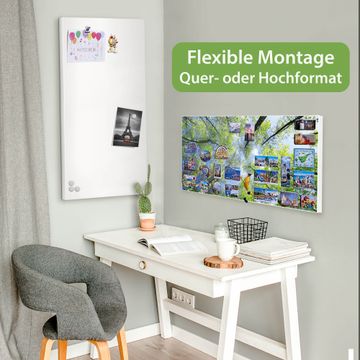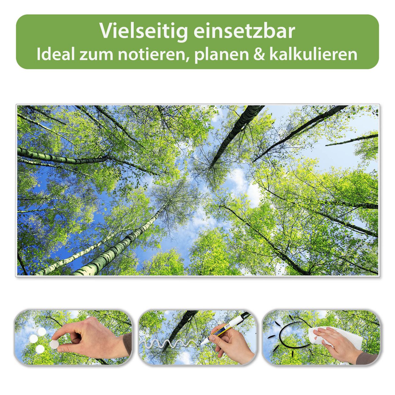 FUNKTION: Die banjado Magnettafel 78x37 cm im Design Motiv Zwischen Bäumen 3 vereint Funktionalität und modernes Wohndesign auf stilvolle Weise. Diese hochwertige Magnetwand aus Metall hilft Ihnen dabei, Notizen, Fotos, Termine, Einkaufslisten oder Rezepte übersichtlich zu organisieren. Als praktisches Memoboard sorgt sie für Struktur im Alltag und setzt gleichzeitig einen dekorativen Akzent an Ihrer Wand. DESIGN: Die Metalltafel besteht aus robustem, lackiertem Stahl und ist mit allen handelsüblichen Magneten nutzbar. Besonders praktisch ist die beschreibbare Oberfläche. Sie können die Magnettafel ganz einfach mit Kreidestiften beschriften und die Inhalte bei Bedarf mit einem feuchten Tuch wieder entfernen. So eignet sich das Memoboard ideal für Wochenpläne, Menüpläne, To Do Listen oder kreative Botschaften. DETAILS: Mit ihrem großzügigen Querformat von 78x37 cm bietet die Magnettafel ausreichend Platz für Ihre Organisation. Das Motiv Motiv Zwischen Bäumen 3 bringt eine warme, natürliche Optik in Küche, Flur, Büro oder Homeoffice und wirkt auch ohne Magnete oder Beschriftung wie ein modernes Wandbild. NUTZEN: Auf der Rückseite befinden sich vorgefertigte Löcher für eine schnelle und unkomplizierte Wandmontage. Jede banjado Magnettafel wird in Deutschland gefertigt und steht für Qualität, Langlebigkeit und liebevolle Verarbeitung. Dieses beschreibbare Memoboard ist die perfekte Kombination aus Metalltafel, Designobjekt und praktischer Magnetwand für Ihren Alltag. BANJADO: Wir sind ein kleines Team aus dem Herzen von Sachsen. Wir fertigen alle Artikel von Hand für Sie an, Sie erhalten keine preiswerte Importware. Auf Wunsch können Sie auch Ihr eigenes Foto auf die Magnettafel aufbringen, schreiben Sie uns an. Herzlichst, Ihr banjado-Team