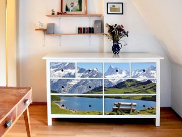 FUNKTION: Die banjado Möbelfolie mit Motiv Alpen zaubert im Handumdrehen aus Ihrer Ikea HEMNES Kommode ein individuell gestaltetes Unikat. Verziert mit einem traumhaften Motiv verbindet die HEMNES Kommode jede Menge Stauraum mit ansprechendem Design. Die gezeigte IKEA HEMNES Komode ist nicht im Angebot enthalten. DESIGN: Die banjado Klebefolie gestaltet Ihr Ikea Möbelstück völlig neu. So passt sich die HEMNESKommode verschiedenen Einrichtungsstilen an. Lassen Sie Ihrer Kreativität freien Raum, wir helfen Ihnen bei der Umsetzung. DETAILS: Der banjado Alpen Möbelsticker ist selbstklebend und wird Ihnen bereits fertig zugeschnitten geliefert. Sie können Schritt für Schritt jede Schublade einzeln bekleben, eine detaillierte Verklebeanleitung liegt selbstverständlich bei. Die Folie ist mit einem zusätzlichen Laminat überzogen, dass Ihr Möbelstück zusätzlich vor Kratzern schützt. NUTZEN: Sie können die banjado Möbelfolie wunderbar nutzen, um abgeplatzte, schmutzige oder unschöne Stellen an Ihrer Malm Kommode zu überdecken. Mit einem wechselnden Design können Sie Ihren Einrichtungsstil ändern oder aus einer Kinderkommode eine Flurkommode gestalten. Alle verwendeten Farben sind lösungsmittelfrei. BANJADO: Ihre Design Folie wird in Sachsen in einer kleinen Manufaktur angefertigt und verpackt. Wir legen großen Wert auf die Verbindung von Funktionalität und Design.