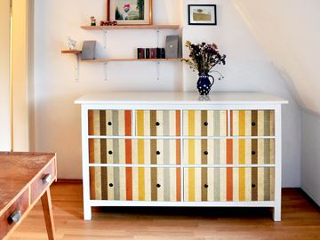 FUNKTION: Die banjado Möbelfolie mit Motiv Alte Streifen zaubert im Handumdrehen aus Ihrer Ikea HEMNES Kommode ein individuell gestaltetes Unikat. Verziert mit einem traumhaften Motiv verbindet die HEMNES Kommode jede Menge Stauraum mit ansprechendem Design. Die gezeigte IKEA HEMNES Komode ist nicht im Angebot enthalten. DESIGN: Die banjado Klebefolie gestaltet Ihr Ikea Möbelstück völlig neu. So passt sich die HEMNESKommode verschiedenen Einrichtungsstilen an. Lassen Sie Ihrer Kreativität freien Raum, wir helfen Ihnen bei der Umsetzung. DETAILS: Der banjado Alte Streifen Möbelsticker ist selbstklebend und wird Ihnen bereits fertig zugeschnitten geliefert. Sie können Schritt für Schritt jede Schublade einzeln bekleben, eine detaillierte Verklebeanleitung liegt selbstverständlich bei. Die Folie ist mit einem zusätzlichen Laminat überzogen, dass Ihr Möbelstück zusätzlich vor Kratzern schützt. NUTZEN: Sie können die banjado Möbelfolie wunderbar nutzen, um abgeplatzte, schmutzige oder unschöne Stellen an Ihrer Malm Kommode zu überdecken. Mit einem wechselnden Design können Sie Ihren Einrichtungsstil ändern oder aus einer Kinderkommode eine Flurkommode gestalten. Alle verwendeten Farben sind lösungsmittelfrei. BANJADO: Ihre Design Folie wird in Sachsen in einer kleinen Manufaktur angefertigt und verpackt. Wir legen großen Wert auf die Verbindung von Funktionalität und Design.