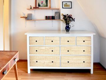 FUNKTION: Die banjado Möbelfolie mit Motiv Bretter zaubert im Handumdrehen aus Ihrer Ikea HEMNES Kommode ein individuell gestaltetes Unikat. Verziert mit einem traumhaften Motiv verbindet die HEMNES Kommode jede Menge Stauraum mit ansprechendem Design. Die gezeigte IKEA HEMNES Komode ist nicht im Angebot enthalten. DESIGN: Die banjado Klebefolie gestaltet Ihr Ikea Möbelstück völlig neu. So passt sich die HEMNESKommode verschiedenen Einrichtungsstilen an. Lassen Sie Ihrer Kreativität freien Raum, wir helfen Ihnen bei der Umsetzung. DETAILS: Der banjado Bretter Möbelsticker ist selbstklebend und wird Ihnen bereits fertig zugeschnitten geliefert. Sie können Schritt für Schritt jede Schublade einzeln bekleben, eine detaillierte Verklebeanleitung liegt selbstverständlich bei. Die Folie ist mit einem zusätzlichen Laminat überzogen, dass Ihr Möbelstück zusätzlich vor Kratzern schützt. NUTZEN: Sie können die banjado Möbelfolie wunderbar nutzen, um abgeplatzte, schmutzige oder unschöne Stellen an Ihrer Malm Kommode zu überdecken. Mit einem wechselnden Design können Sie Ihren Einrichtungsstil ändern oder aus einer Kinderkommode eine Flurkommode gestalten. Alle verwendeten Farben sind lösungsmittelfrei. BANJADO: Ihre Design Folie wird in Sachsen in einer kleinen Manufaktur angefertigt und verpackt. Wir legen großen Wert auf die Verbindung von Funktionalität und Design.
