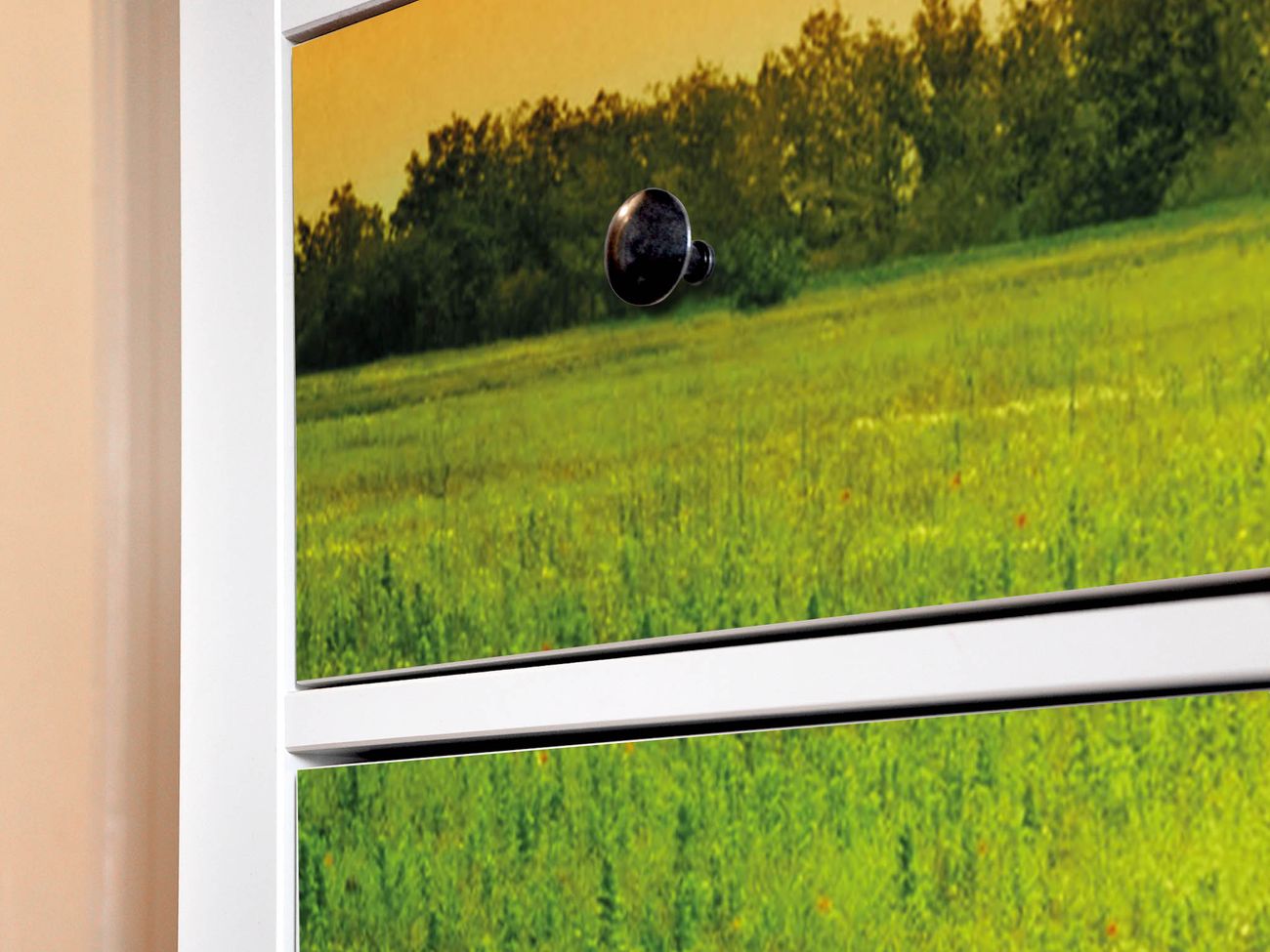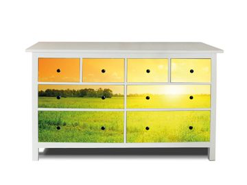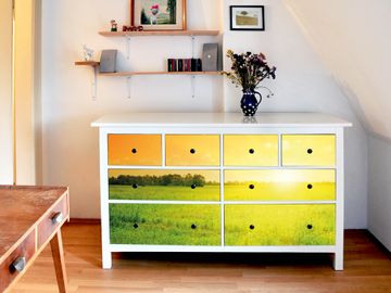 FUNKTION: Die banjado Möbelfolie mit Motiv Guten Morgen 2 zaubert im Handumdrehen aus Ihrer Ikea HEMNES Kommode ein individuell gestaltetes Unikat. Verziert mit einem traumhaften Motiv verbindet die HEMNES Kommode jede Menge Stauraum mit ansprechendem Design. Die gezeigte IKEA HEMNES Komode ist nicht im Angebot enthalten. DESIGN: Die banjado Klebefolie gestaltet Ihr Ikea Möbelstück völlig neu. So passt sich die HEMNESKommode verschiedenen Einrichtungsstilen an. Lassen Sie Ihrer Kreativität freien Raum, wir helfen Ihnen bei der Umsetzung. DETAILS: Der banjado Guten Morgen 2 Möbelsticker ist selbstklebend und wird Ihnen bereits fertig zugeschnitten geliefert. Sie können Schritt für Schritt jede Schublade einzeln bekleben, eine detaillierte Verklebeanleitung liegt selbstverständlich bei. Die Folie ist mit einem zusätzlichen Laminat überzogen, dass Ihr Möbelstück zusätzlich vor Kratzern schützt. NUTZEN: Sie können die banjado Möbelfolie wunderbar nutzen, um abgeplatzte, schmutzige oder unschöne Stellen an Ihrer Malm Kommode zu überdecken. Mit einem wechselnden Design können Sie Ihren Einrichtungsstil ändern oder aus einer Kinderkommode eine Flurkommode gestalten. Alle verwendeten Farben sind lösungsmittelfrei. BANJADO: Ihre Design Folie wird in Sachsen in einer kleinen Manufaktur angefertigt und verpackt. Wir legen großen Wert auf die Verbindung von Funktionalität und Design.