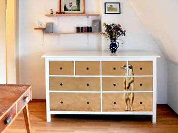 FUNKTION: Die banjado Möbelfolie mit Motiv Henryk 2 zaubert im Handumdrehen aus Ihrer Ikea HEMNES Kommode ein individuell gestaltetes Unikat. Verziert mit einem traumhaften Motiv verbindet die HEMNES Kommode jede Menge Stauraum mit ansprechendem Design. Die gezeigte IKEA HEMNES Komode ist nicht im Angebot enthalten. DESIGN: Die banjado Klebefolie gestaltet Ihr Ikea Möbelstück völlig neu. So passt sich die HEMNESKommode verschiedenen Einrichtungsstilen an. Lassen Sie Ihrer Kreativität freien Raum, wir helfen Ihnen bei der Umsetzung. DETAILS: Der banjado Henryk 2 Möbelsticker ist selbstklebend und wird Ihnen bereits fertig zugeschnitten geliefert. Sie können Schritt für Schritt jede Schublade einzeln bekleben, eine detaillierte Verklebeanleitung liegt selbstverständlich bei. Die Folie ist mit einem zusätzlichen Laminat überzogen, dass Ihr Möbelstück zusätzlich vor Kratzern schützt. NUTZEN: Sie können die banjado Möbelfolie wunderbar nutzen, um abgeplatzte, schmutzige oder unschöne Stellen an Ihrer Malm Kommode zu überdecken. Mit einem wechselnden Design können Sie Ihren Einrichtungsstil ändern oder aus einer Kinderkommode eine Flurkommode gestalten. Alle verwendeten Farben sind lösungsmittelfrei. BANJADO: Ihre Design Folie wird in Sachsen in einer kleinen Manufaktur angefertigt und verpackt. Wir legen großen Wert auf die Verbindung von Funktionalität und Design.