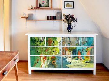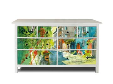 FUNKTION: Die banjado Möbelfolie mit Motiv Historischer Stadtkern zaubert im Handumdrehen aus Ihrer Ikea HEMNES Kommode ein individuell gestaltetes Unikat. Verziert mit einem traumhaften Motiv verbindet die HEMNES Kommode jede Menge Stauraum mit ansprechendem Design. Die gezeigte IKEA HEMNES Komode ist nicht im Angebot enthalten. DESIGN: Die banjado Klebefolie gestaltet Ihr Ikea Möbelstück völlig neu. So passt sich die HEMNESKommode verschiedenen Einrichtungsstilen an. Lassen Sie Ihrer Kreativität freien Raum, wir helfen Ihnen bei der Umsetzung. DETAILS: Der banjado Historischer Stadtkern Möbelsticker ist selbstklebend und wird Ihnen bereits fertig zugeschnitten geliefert. Sie können Schritt für Schritt jede Schublade einzeln bekleben, eine detaillierte Verklebeanleitung liegt selbstverständlich bei. Die Folie ist mit einem zusätzlichen Laminat überzogen, dass Ihr Möbelstück zusätzlich vor Kratzern schützt. NUTZEN: Sie können die banjado Möbelfolie wunderbar nutzen, um abgeplatzte, schmutzige oder unschöne Stellen an Ihrer Malm Kommode zu überdecken. Mit einem wechselnden Design können Sie Ihren Einrichtungsstil ändern oder aus einer Kinderkommode eine Flurkommode gestalten. Alle verwendeten Farben sind lösungsmittelfrei. BANJADO: Ihre Design Folie wird in Sachsen in einer kleinen Manufaktur angefertigt und verpackt. Wir legen großen Wert auf die Verbindung von Funktionalität und Design.
