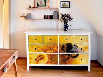 FUNKTION: Die banjado Möbelfolie mit Motiv Hummel zaubert im Handumdrehen aus Ihrer Ikea HEMNES Kommode ein individuell gestaltetes Unikat. Verziert mit einem traumhaften Motiv verbindet die HEMNES Kommode jede Menge Stauraum mit ansprechendem Design. Die gezeigte IKEA HEMNES Komode ist nicht im Angebot enthalten. DESIGN: Die banjado Klebefolie gestaltet Ihr Ikea Möbelstück völlig neu. So passt sich die HEMNESKommode verschiedenen Einrichtungsstilen an. Lassen Sie Ihrer Kreativität freien Raum, wir helfen Ihnen bei der Umsetzung. DETAILS: Der banjado Hummel Möbelsticker ist selbstklebend und wird Ihnen bereits fertig zugeschnitten geliefert. Sie können Schritt für Schritt jede Schublade einzeln bekleben, eine detaillierte Verklebeanleitung liegt selbstverständlich bei. Die Folie ist mit einem zusätzlichen Laminat überzogen, dass Ihr Möbelstück zusätzlich vor Kratzern schützt. NUTZEN: Sie können die banjado Möbelfolie wunderbar nutzen, um abgeplatzte, schmutzige oder unschöne Stellen an Ihrer Malm Kommode zu überdecken. Mit einem wechselnden Design können Sie Ihren Einrichtungsstil ändern oder aus einer Kinderkommode eine Flurkommode gestalten. Alle verwendeten Farben sind lösungsmittelfrei. BANJADO: Ihre Design Folie wird in Sachsen in einer kleinen Manufaktur angefertigt und verpackt. Wir legen großen Wert auf die Verbindung von Funktionalität und Design.