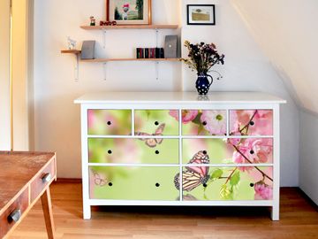 FUNKTION: Die banjado Möbelfolie mit Motiv Japanische Kirschblüte zaubert im Handumdrehen aus Ihrer Ikea HEMNES Kommode ein individuell gestaltetes Unikat. Verziert mit einem traumhaften Motiv verbindet die HEMNES Kommode jede Menge Stauraum mit ansprechendem Design. Die gezeigte IKEA HEMNES Komode ist nicht im Angebot enthalten. DESIGN: Die banjado Klebefolie gestaltet Ihr Ikea Möbelstück völlig neu. So passt sich die HEMNESKommode verschiedenen Einrichtungsstilen an. Lassen Sie Ihrer Kreativität freien Raum, wir helfen Ihnen bei der Umsetzung. DETAILS: Der banjado Japanische Kirschblüte Möbelsticker ist selbstklebend und wird Ihnen bereits fertig zugeschnitten geliefert. Sie können Schritt für Schritt jede Schublade einzeln bekleben, eine detaillierte Verklebeanleitung liegt selbstverständlich bei. Die Folie ist mit einem zusätzlichen Laminat überzogen, dass Ihr Möbelstück zusätzlich vor Kratzern schützt. NUTZEN: Sie können die banjado Möbelfolie wunderbar nutzen, um abgeplatzte, schmutzige oder unschöne Stellen an Ihrer Malm Kommode zu überdecken. Mit einem wechselnden Design können Sie Ihren Einrichtungsstil ändern oder aus einer Kinderkommode eine Flurkommode gestalten. Alle verwendeten Farben sind lösungsmittelfrei. BANJADO: Ihre Design Folie wird in Sachsen in einer kleinen Manufaktur angefertigt und verpackt. Wir legen großen Wert auf die Verbindung von Funktionalität und Design.
