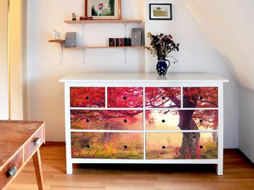 FUNKTION: Die banjado Möbelfolie mit Motiv Lichtung Im Herbst zaubert im Handumdrehen aus Ihrer Ikea HEMNES Kommode ein individuell gestaltetes Unikat. Verziert mit einem traumhaften Motiv verbindet die HEMNES Kommode jede Menge Stauraum mit ansprechendem Design. Die gezeigte IKEA HEMNES Komode ist nicht im Angebot enthalten. DESIGN: Die banjado Klebefolie gestaltet Ihr Ikea Möbelstück völlig neu. So passt sich die HEMNESKommode verschiedenen Einrichtungsstilen an. Lassen Sie Ihrer Kreativität freien Raum, wir helfen Ihnen bei der Umsetzung. DETAILS: Der banjado Lichtung Im Herbst Möbelsticker ist selbstklebend und wird Ihnen bereits fertig zugeschnitten geliefert. Sie können Schritt für Schritt jede Schublade einzeln bekleben, eine detaillierte Verklebeanleitung liegt selbstverständlich bei. Die Folie ist mit einem zusätzlichen Laminat überzogen, dass Ihr Möbelstück zusätzlich vor Kratzern schützt. NUTZEN: Sie können die banjado Möbelfolie wunderbar nutzen, um abgeplatzte, schmutzige oder unschöne Stellen an Ihrer Malm Kommode zu überdecken. Mit einem wechselnden Design können Sie Ihren Einrichtungsstil ändern oder aus einer Kinderkommode eine Flurkommode gestalten. Alle verwendeten Farben sind lösungsmittelfrei. BANJADO: Ihre Design Folie wird in Sachsen in einer kleinen Manufaktur angefertigt und verpackt. Wir legen großen Wert auf die Verbindung von Funktionalität und Design.