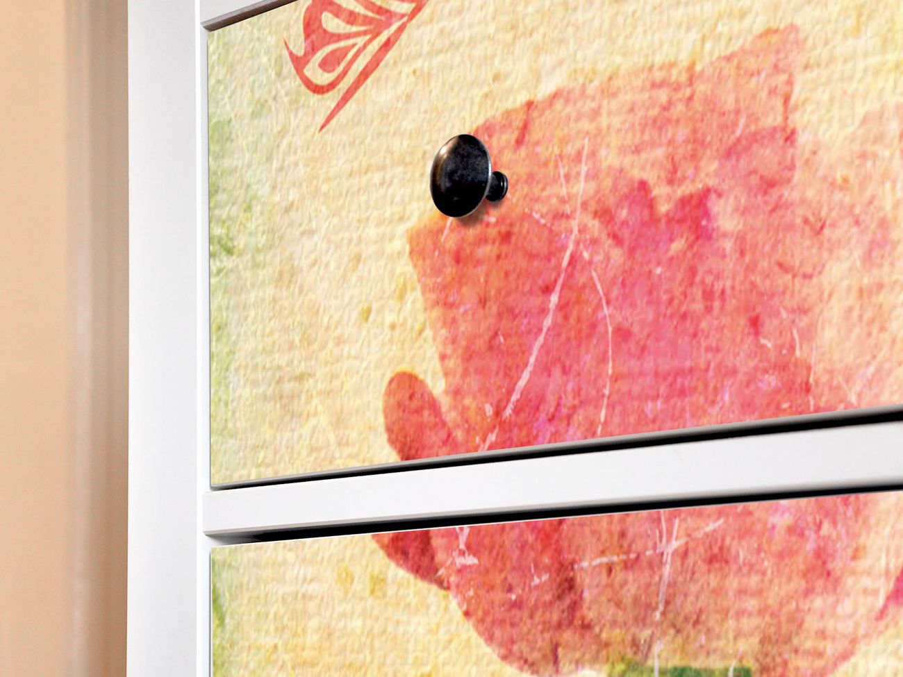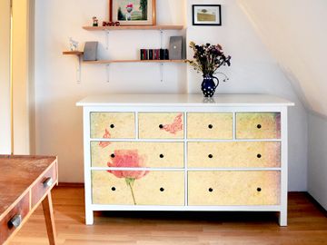 FUNKTION: Die banjado Möbelfolie mit Motiv Romantik zaubert im Handumdrehen aus Ihrer Ikea HEMNES Kommode ein individuell gestaltetes Unikat. Verziert mit einem traumhaften Motiv verbindet die HEMNES Kommode jede Menge Stauraum mit ansprechendem Design. Die gezeigte IKEA HEMNES Komode ist nicht im Angebot enthalten. DESIGN: Die banjado Klebefolie gestaltet Ihr Ikea Möbelstück völlig neu. So passt sich die HEMNESKommode verschiedenen Einrichtungsstilen an. Lassen Sie Ihrer Kreativität freien Raum, wir helfen Ihnen bei der Umsetzung. DETAILS: Der banjado Romantik Möbelsticker ist selbstklebend und wird Ihnen bereits fertig zugeschnitten geliefert. Sie können Schritt für Schritt jede Schublade einzeln bekleben, eine detaillierte Verklebeanleitung liegt selbstverständlich bei. Die Folie ist mit einem zusätzlichen Laminat überzogen, dass Ihr Möbelstück zusätzlich vor Kratzern schützt. NUTZEN: Sie können die banjado Möbelfolie wunderbar nutzen, um abgeplatzte, schmutzige oder unschöne Stellen an Ihrer Malm Kommode zu überdecken. Mit einem wechselnden Design können Sie Ihren Einrichtungsstil ändern oder aus einer Kinderkommode eine Flurkommode gestalten. Alle verwendeten Farben sind lösungsmittelfrei. BANJADO: Ihre Design Folie wird in Sachsen in einer kleinen Manufaktur angefertigt und verpackt. Wir legen großen Wert auf die Verbindung von Funktionalität und Design.