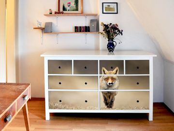 FUNKTION: Die banjado Möbelfolie mit Motiv Rosalie zaubert im Handumdrehen aus Ihrer Ikea HEMNES Kommode ein individuell gestaltetes Unikat. Verziert mit einem traumhaften Motiv verbindet die HEMNES Kommode jede Menge Stauraum mit ansprechendem Design. Die gezeigte IKEA HEMNES Komode ist nicht im Angebot enthalten. DESIGN: Die banjado Klebefolie gestaltet Ihr Ikea Möbelstück völlig neu. So passt sich die HEMNESKommode verschiedenen Einrichtungsstilen an. Lassen Sie Ihrer Kreativität freien Raum, wir helfen Ihnen bei der Umsetzung. DETAILS: Der banjado Rosalie Möbelsticker ist selbstklebend und wird Ihnen bereits fertig zugeschnitten geliefert. Sie können Schritt für Schritt jede Schublade einzeln bekleben, eine detaillierte Verklebeanleitung liegt selbstverständlich bei. Die Folie ist mit einem zusätzlichen Laminat überzogen, dass Ihr Möbelstück zusätzlich vor Kratzern schützt. NUTZEN: Sie können die banjado Möbelfolie wunderbar nutzen, um abgeplatzte, schmutzige oder unschöne Stellen an Ihrer Malm Kommode zu überdecken. Mit einem wechselnden Design können Sie Ihren Einrichtungsstil ändern oder aus einer Kinderkommode eine Flurkommode gestalten. Alle verwendeten Farben sind lösungsmittelfrei. BANJADO: Ihre Design Folie wird in Sachsen in einer kleinen Manufaktur angefertigt und verpackt. Wir legen großen Wert auf die Verbindung von Funktionalität und Design.