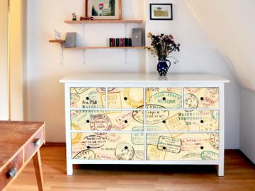 FUNKTION: Die banjado Möbelfolie mit Motiv Stempel zaubert im Handumdrehen aus Ihrer Ikea HEMNES Kommode ein individuell gestaltetes Unikat. Verziert mit einem traumhaften Motiv verbindet die HEMNES Kommode jede Menge Stauraum mit ansprechendem Design. Die gezeigte IKEA HEMNES Komode ist nicht im Angebot enthalten. DESIGN: Die banjado Klebefolie gestaltet Ihr Ikea Möbelstück völlig neu. So passt sich die HEMNESKommode verschiedenen Einrichtungsstilen an. Lassen Sie Ihrer Kreativität freien Raum, wir helfen Ihnen bei der Umsetzung. DETAILS: Der banjado Stempel Möbelsticker ist selbstklebend und wird Ihnen bereits fertig zugeschnitten geliefert. Sie können Schritt für Schritt jede Schublade einzeln bekleben, eine detaillierte Verklebeanleitung liegt selbstverständlich bei. Die Folie ist mit einem zusätzlichen Laminat überzogen, dass Ihr Möbelstück zusätzlich vor Kratzern schützt. NUTZEN: Sie können die banjado Möbelfolie wunderbar nutzen, um abgeplatzte, schmutzige oder unschöne Stellen an Ihrer Malm Kommode zu überdecken. Mit einem wechselnden Design können Sie Ihren Einrichtungsstil ändern oder aus einer Kinderkommode eine Flurkommode gestalten. Alle verwendeten Farben sind lösungsmittelfrei. BANJADO: Ihre Design Folie wird in Sachsen in einer kleinen Manufaktur angefertigt und verpackt. Wir legen großen Wert auf die Verbindung von Funktionalität und Design.