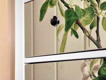 FUNKTION: Die banjado Möbelfolie mit Motiv Stillleben Kirschblüten zaubert im Handumdrehen aus Ihrer Ikea HEMNES Kommode ein individuell gestaltetes Unikat. Verziert mit einem traumhaften Motiv verbindet die HEMNES Kommode jede Menge Stauraum mit ansprechendem Design. Die gezeigte IKEA HEMNES Komode ist nicht im Angebot enthalten. DESIGN: Die banjado Klebefolie gestaltet Ihr Ikea Möbelstück völlig neu. So passt sich die HEMNESKommode verschiedenen Einrichtungsstilen an. Lassen Sie Ihrer Kreativität freien Raum, wir helfen Ihnen bei der Umsetzung. DETAILS: Der banjado Stillleben Kirschblüten Möbelsticker ist selbstklebend und wird Ihnen bereits fertig zugeschnitten geliefert. Sie können Schritt für Schritt jede Schublade einzeln bekleben, eine detaillierte Verklebeanleitung liegt selbstverständlich bei. Die Folie ist mit einem zusätzlichen Laminat überzogen, dass Ihr Möbelstück zusätzlich vor Kratzern schützt. NUTZEN: Sie können die banjado Möbelfolie wunderbar nutzen, um abgeplatzte, schmutzige oder unschöne Stellen an Ihrer Malm Kommode zu überdecken. Mit einem wechselnden Design können Sie Ihren Einrichtungsstil ändern oder aus einer Kinderkommode eine Flurkommode gestalten. Alle verwendeten Farben sind lösungsmittelfrei. BANJADO: Ihre Design Folie wird in Sachsen in einer kleinen Manufaktur angefertigt und verpackt. Wir legen großen Wert auf die Verbindung von Funktionalität und Design.