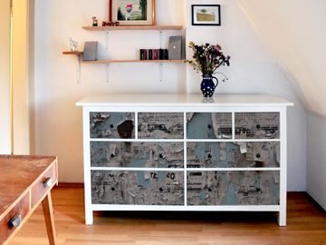 FUNKTION: Die banjado Möbelfolie mit Motiv Wand mit Zeitungen zaubert im Handumdrehen aus Ihrer Ikea HEMNES Kommode ein individuell gestaltetes Unikat. Verziert mit einem traumhaften Motiv verbindet die HEMNES Kommode jede Menge Stauraum mit ansprechendem Design. Die gezeigte IKEA HEMNES Komode ist nicht im Angebot enthalten. DESIGN: Die banjado Klebefolie gestaltet Ihr Ikea Möbelstück völlig neu. So passt sich die HEMNESKommode verschiedenen Einrichtungsstilen an. Lassen Sie Ihrer Kreativität freien Raum, wir helfen Ihnen bei der Umsetzung. DETAILS: Der banjado Wand mit Zeitungen Möbelsticker ist selbstklebend und wird Ihnen bereits fertig zugeschnitten geliefert. Sie können Schritt für Schritt jede Schublade einzeln bekleben, eine detaillierte Verklebeanleitung liegt selbstverständlich bei. Die Folie ist mit einem zusätzlichen Laminat überzogen, dass Ihr Möbelstück zusätzlich vor Kratzern schützt. NUTZEN: Sie können die banjado Möbelfolie wunderbar nutzen, um abgeplatzte, schmutzige oder unschöne Stellen an Ihrer Malm Kommode zu überdecken. Mit einem wechselnden Design können Sie Ihren Einrichtungsstil ändern oder aus einer Kinderkommode eine Flurkommode gestalten. Alle verwendeten Farben sind lösungsmittelfrei. BANJADO: Ihre Design Folie wird in Sachsen in einer kleinen Manufaktur angefertigt und verpackt. Wir legen großen Wert auf die Verbindung von Funktionalität und Design.