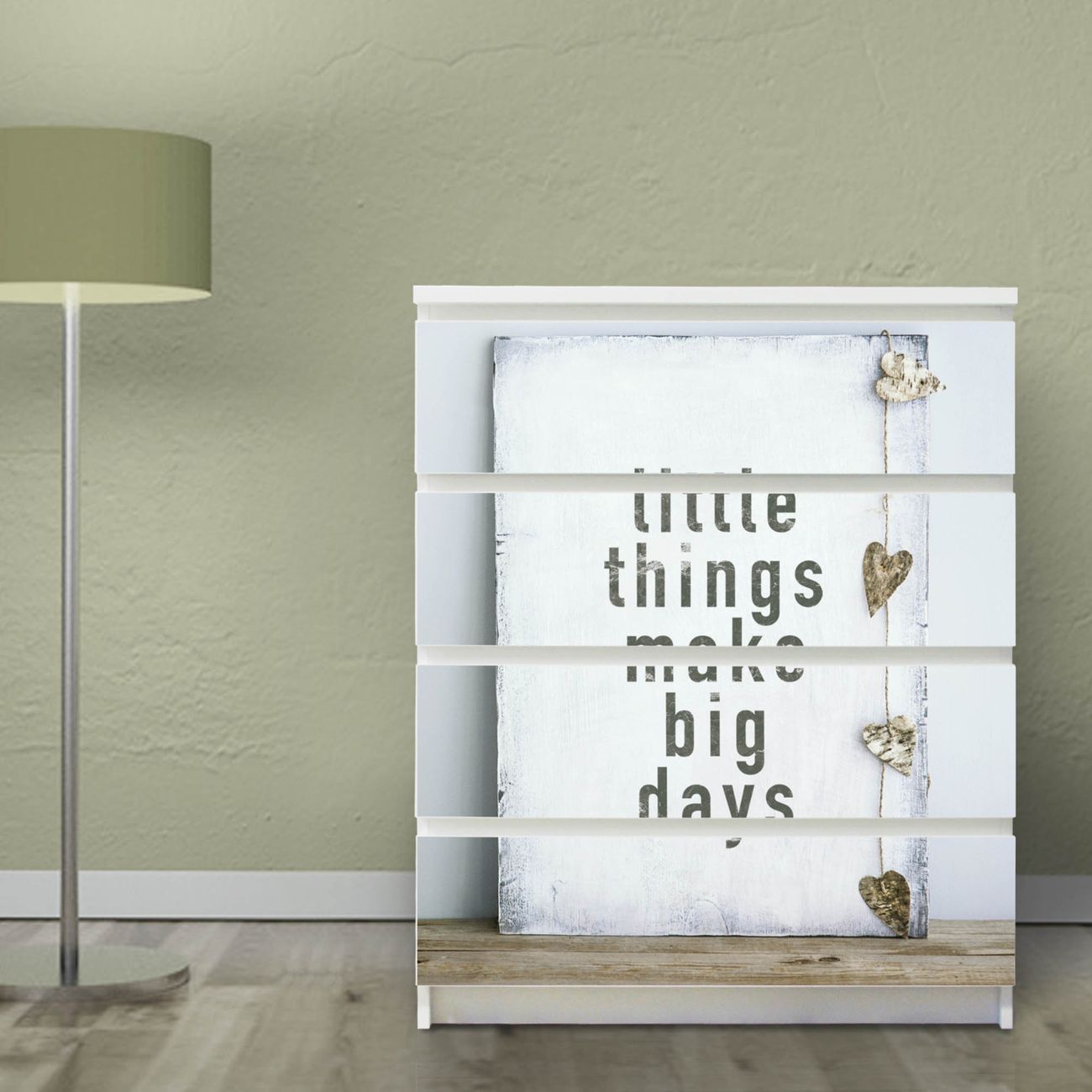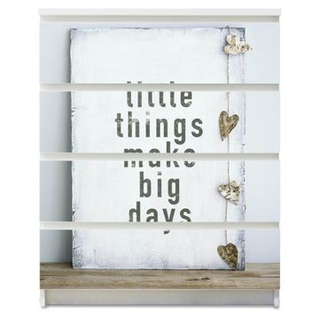 FUNKTION: Die banjado Möbelfolie mit Motiv Motiv Little Things zaubert im Handumdrehen aus Ihrer Ikea MALM Kommode ein individuell gestaltetes Unikat. Verziert mit einem traumhaften Motiv verbindet die Malm Kommode jede Menge Stauraum mit ansprechendem Design. Die gezeigte IKEA Malm Komode ist nicht im Angebot enthalten. DESIGN: Die banjado Klebefolie gestaltet Ihr Ikea Möbelstück völlig neu. So passt sich die Malm Kommode verschiedenen Einrichtungsstilen an. Lassen Sie Ihrer Kreativität freien Raum, wir helfen Ihnen bei der Umsetzung. Egal ob 2, 3, 4 oder 6 Schubkästen, wählen Sie einfach Ihre passende Variante. DETAILS: Der banjado Motiv Little Things Möbelsticker ist selbstklebend und wird Ihnen bereits fertig zugeschnitten geliefert. Sie können Schritt für Schritt jede Schublade einzeln bekleben, eine detaillierte Verklebeanleitung liegt selbstverständlich bei. Die Folie ist mit einem zusätzlichen Laminat überzogen, dass Ihr Möbelstück zusätzlich vor Kratzern schützt. NUTZEN: Sie können die banjado Möbelfolie wunderbar nutzen, um abgeplatzte, schmutzige oder unschöne Stellen an Ihrer Malm Kommode zu überdecken. Mit einem wechselnden Design können Sie Ihren Einrichtungsstil ändern oder aus einer Flurkommode eine Kinderkommode gestalten. Alle verwendeten Farben sind lösungsmittelfrei. BANJADO: Ihre Design Folie wird in Sachsen in einer kleinen Manufaktur angefertigt und verpackt. Wir legen großen Wert auf die Verbindung von Funktionalität und Design.
