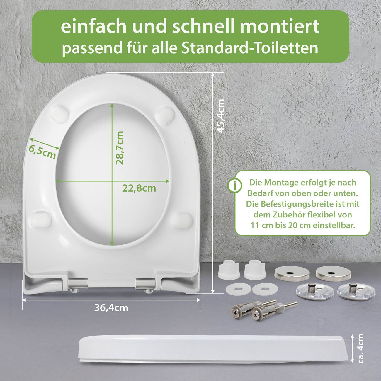 Der Toilettensitz mit Softclose Absenkautomatik besteht aus hochwertigem Duroplast. Ein Material, dass robust, angenehm in der Haptik und hygienisch ist. Die Montage erfolgt komplett von oben und ist kinderleicht.