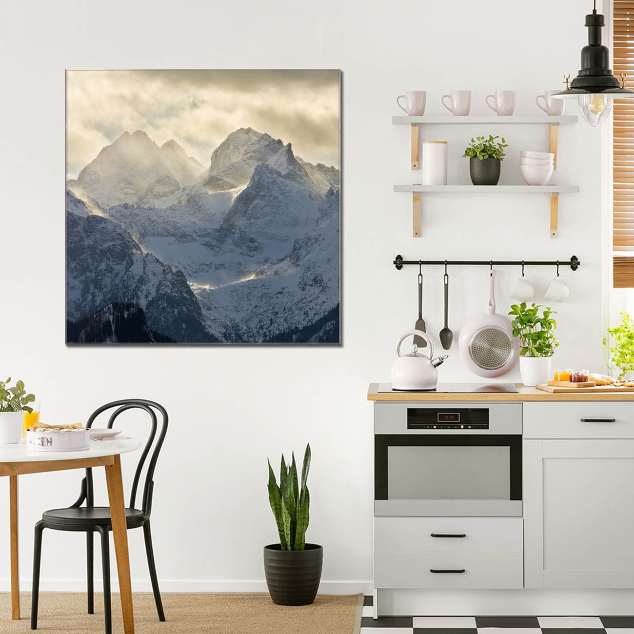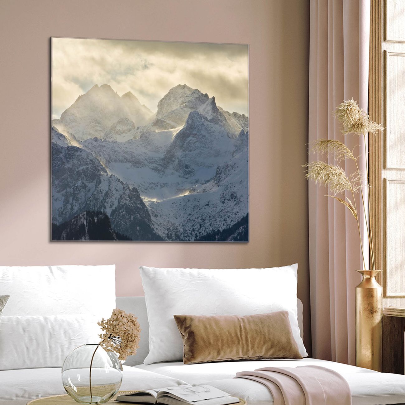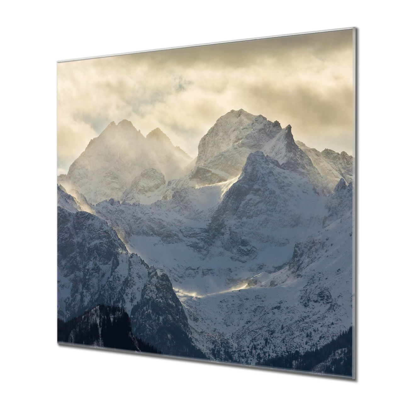 Quadratisches Wandbild aus Glas Alpen im Sonnenschein
