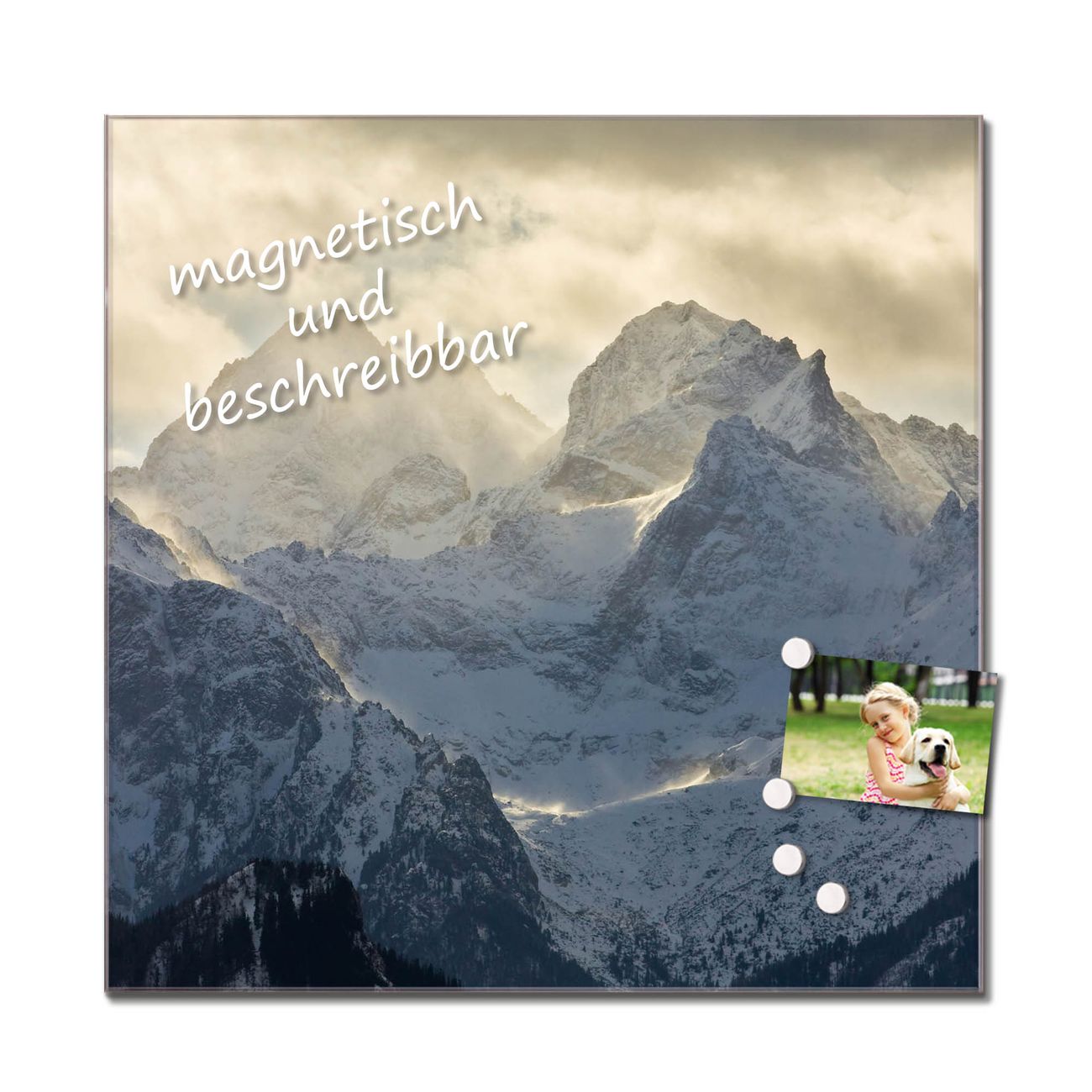 Das Glasbild besteht aus 4mm gehärtetem zertifiziertem ESG Sicherheitsglas, die Rückwand aus einem magnetischen Stahlblech. Durch die superflache Bauweise haben Sie die Wahl aus einer Vielzahl von Befestigungsmöglichkeiten. Sie können das Wandbild mit einem Montagekleber superflach an die Wand kleben oder Sie wählen eines unserer passenden Befestigungssets, welches eine optimale Montage garantiert. Durch die mitgelieferten 4 Neodym-Magnete ist Ihr Glaswandbild sofort einsatzbereit. Wir sind ein kleines Team aus dem Herzen von Sachsen und fertigen alle Artikel von Hand für Sie an. Wir entwerfen unsere Produkte selbst mit großer Liebe zum Detail.