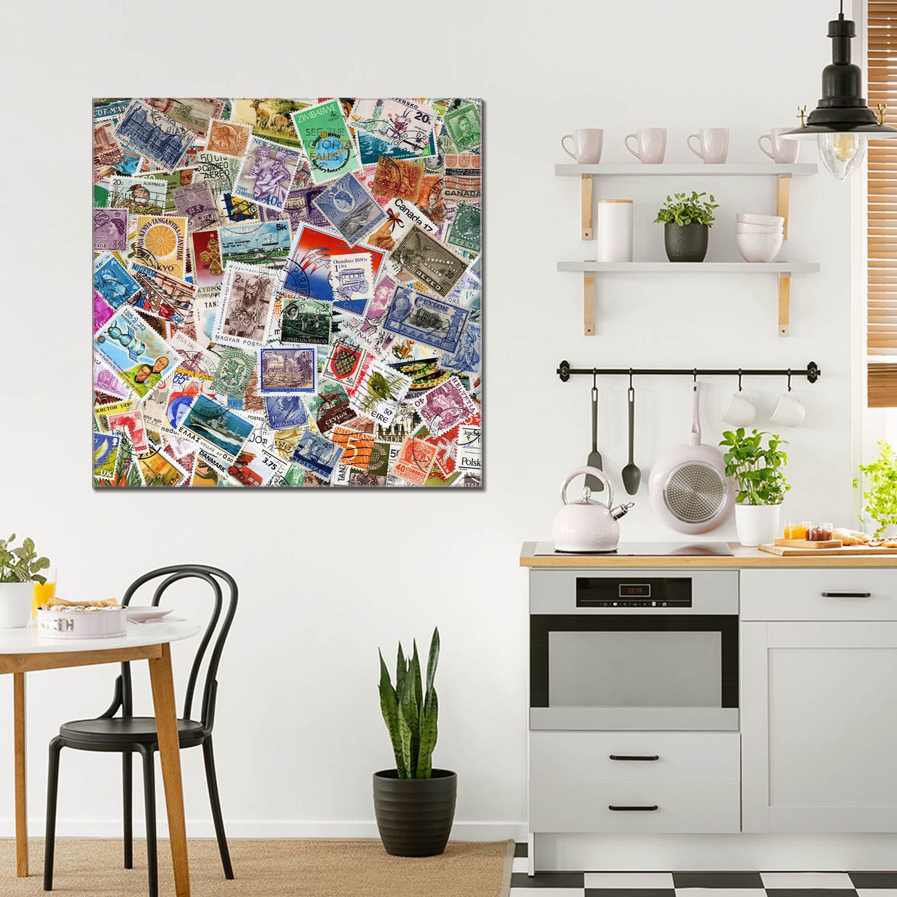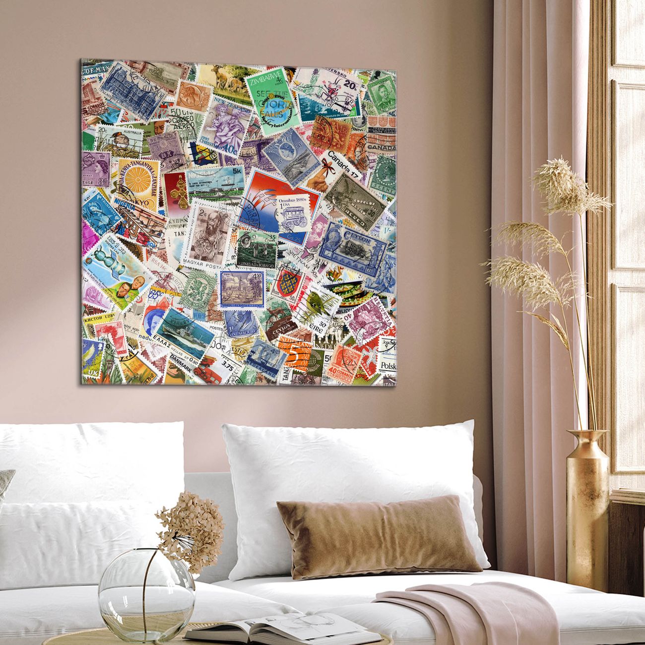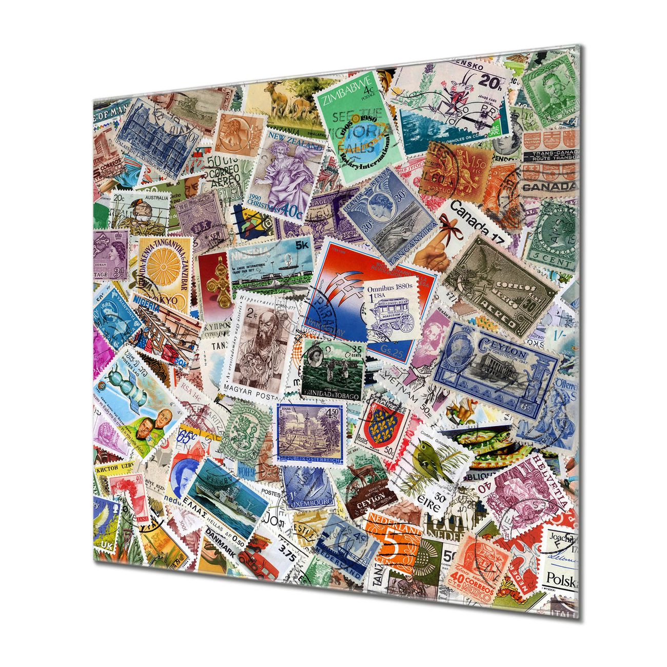 Quadratisches Wandbild aus Glas Briefmarken