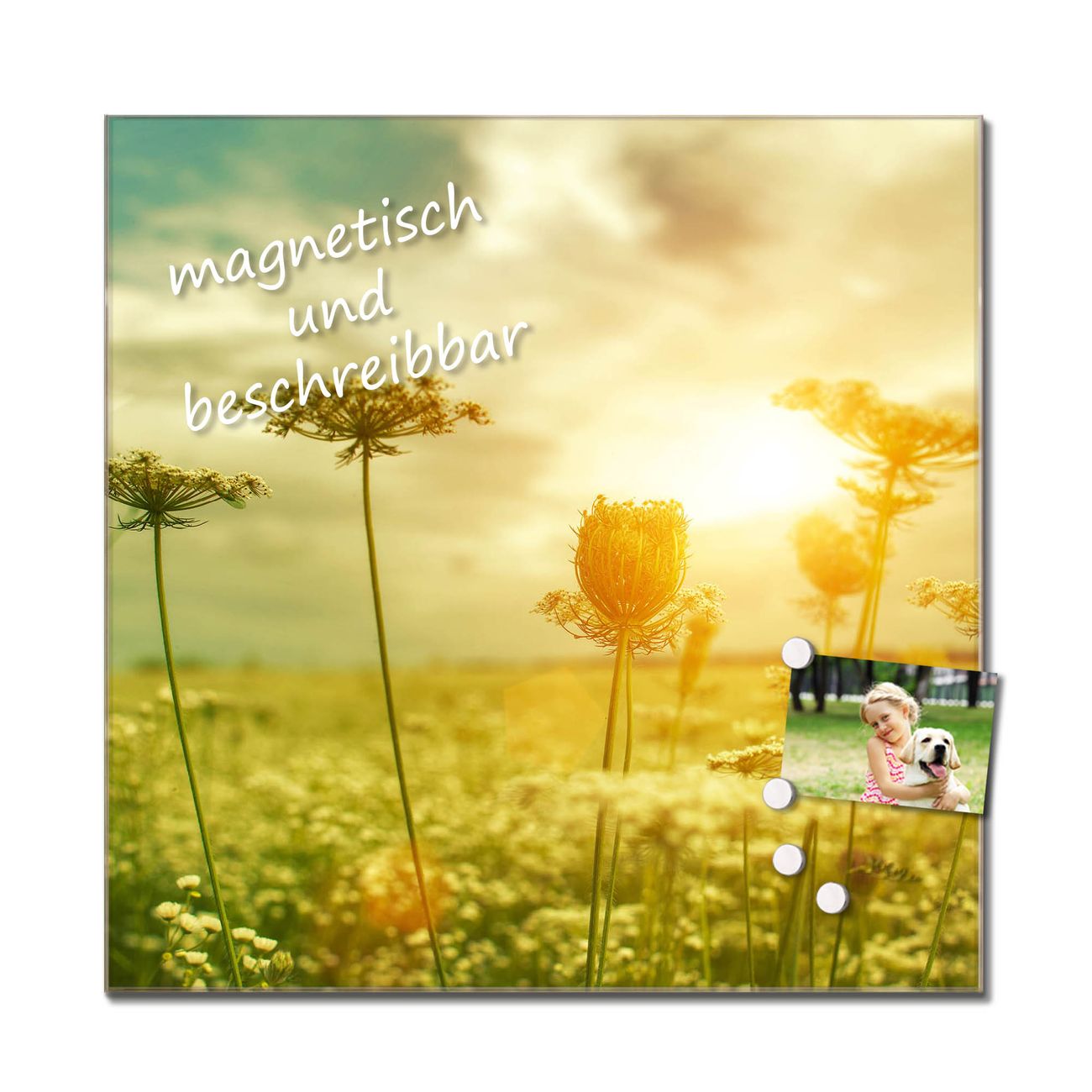 Das Glasbild besteht aus 4mm gehärtetem zertifiziertem ESG Sicherheitsglas, die Rückwand aus einem magnetischen Stahlblech. Durch die superflache Bauweise haben Sie die Wahl aus einer Vielzahl von Befestigungsmöglichkeiten. Sie können das Wandbild mit einem Montagekleber superflach an die Wand kleben oder Sie wählen eines unserer passenden Befestigungssets, welches eine optimale Montage garantiert. Durch die mitgelieferten 4 Neodym-Magnete ist Ihr Glaswandbild sofort einsatzbereit. Wir sind ein kleines Team aus dem Herzen von Sachsen und fertigen alle Artikel von Hand für Sie an. Wir entwerfen unsere Produkte selbst mit großer Liebe zum Detail.