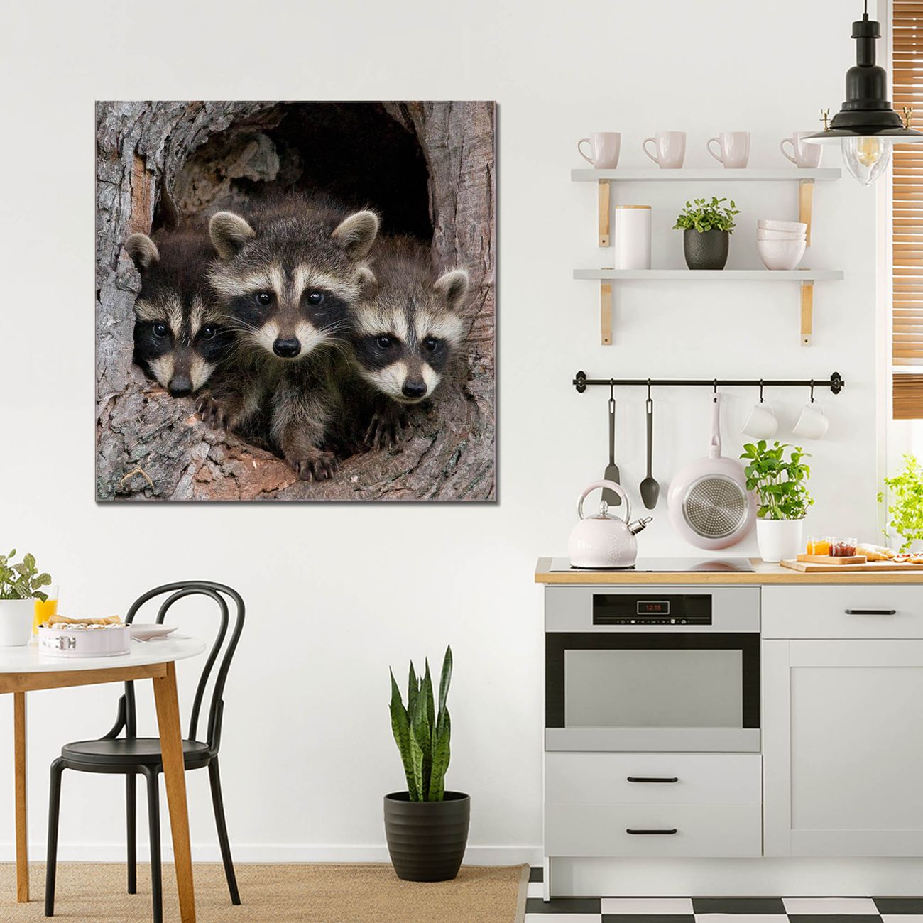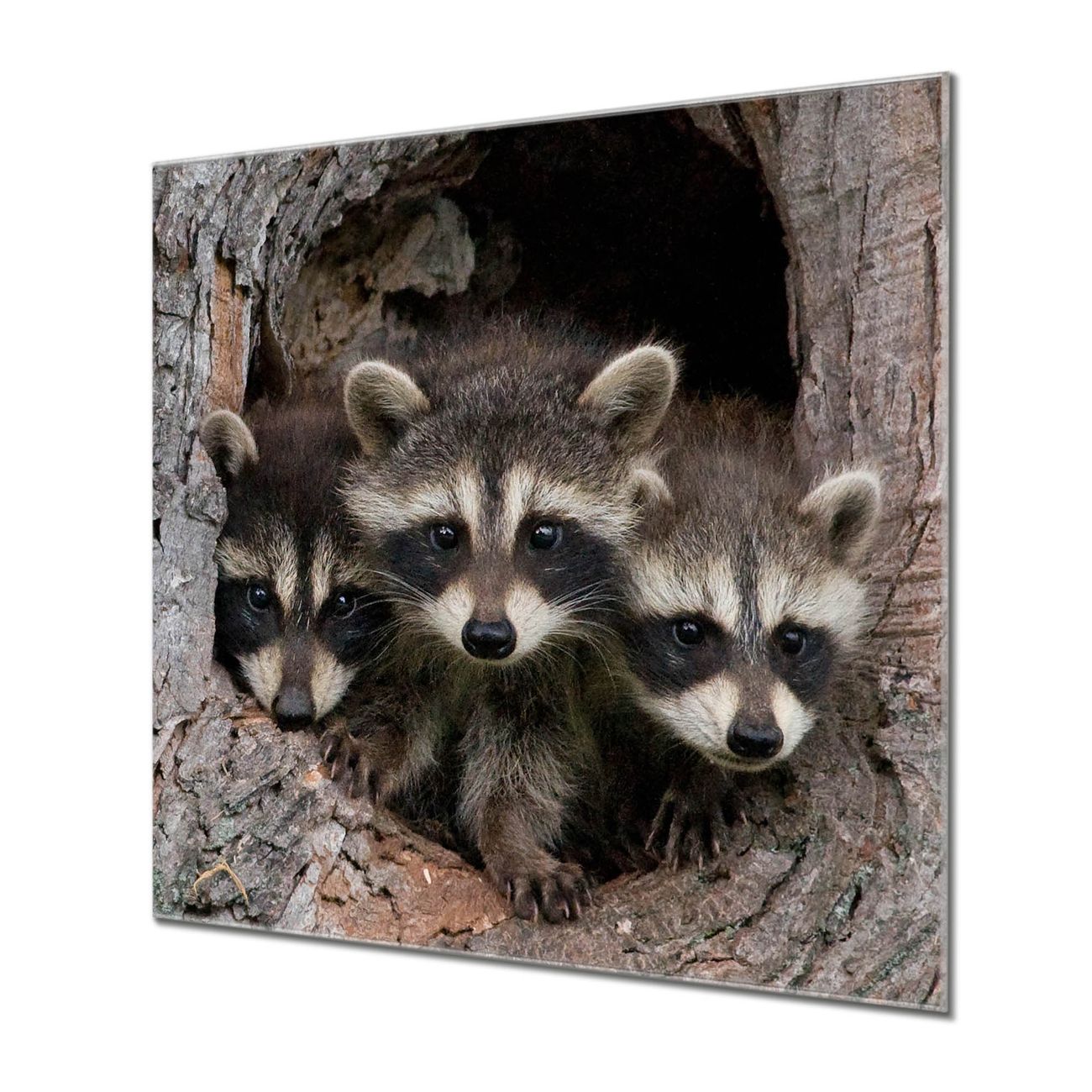 Unsere einzigartigen Glasbilder im Querformat von banjado mit Motiv Drei Waschbären sind der absolute Hingucker! Unsere Banjado Glasbilder sind sehr begehrt, weil sie top verarbeitet sind und sich ganz leicht montieren lassen. Schon mit wenigen Handgriffen hängen sie an der Wand und strahlen mit höchster brillianz. Durch die Ramenlose Herstellung schwebt das Echtglasbild förmlich an der Wand. Das Motiv erscheint besonders ausdrucksstark und hochwertig und ist hinter dem Echtglas geschützt.