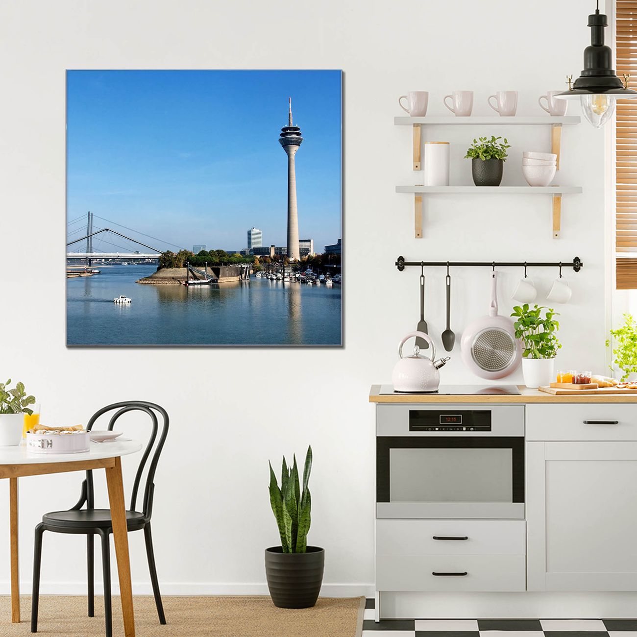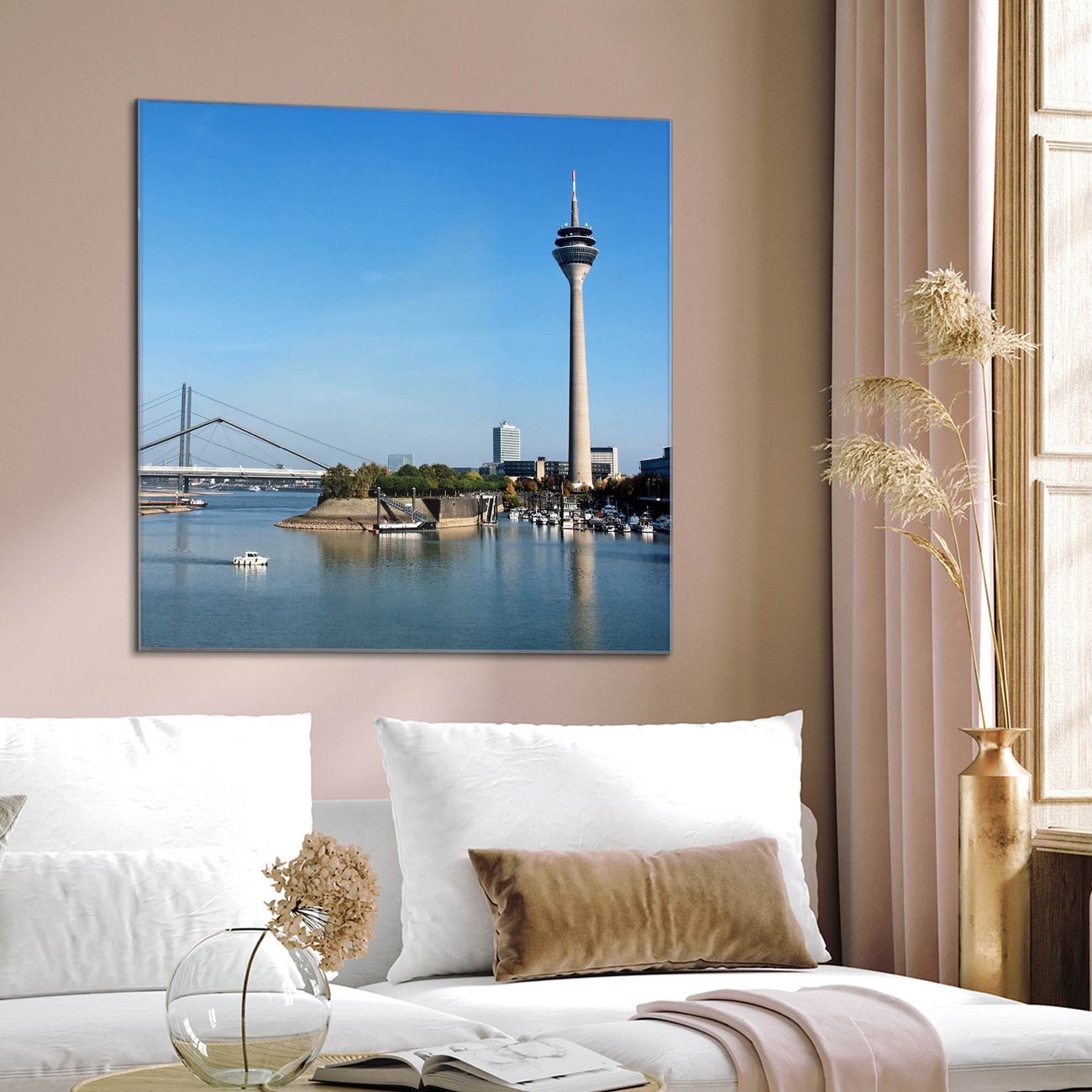 Unsere einzigartigen Glasbilder im Querformat von banjado mit Motiv Düsseldorf sind der absolute Hingucker! Unsere Banjado Glasbilder sind sehr begehrt, weil sie top verarbeitet sind und sich ganz leicht montieren lassen. Schon mit wenigen Handgriffen hängen sie an der Wand und strahlen mit höchster brillianz. Durch die Ramenlose Herstellung schwebt das Echtglasbild förmlich an der Wand. Das Motiv erscheint besonders ausdrucksstark und hochwertig und ist hinter dem Echtglas geschützt.