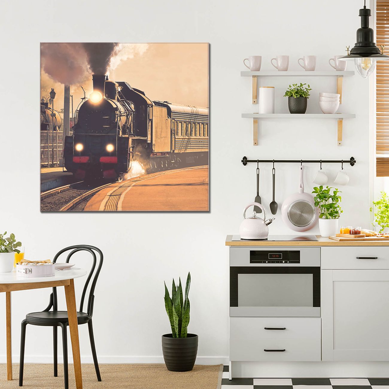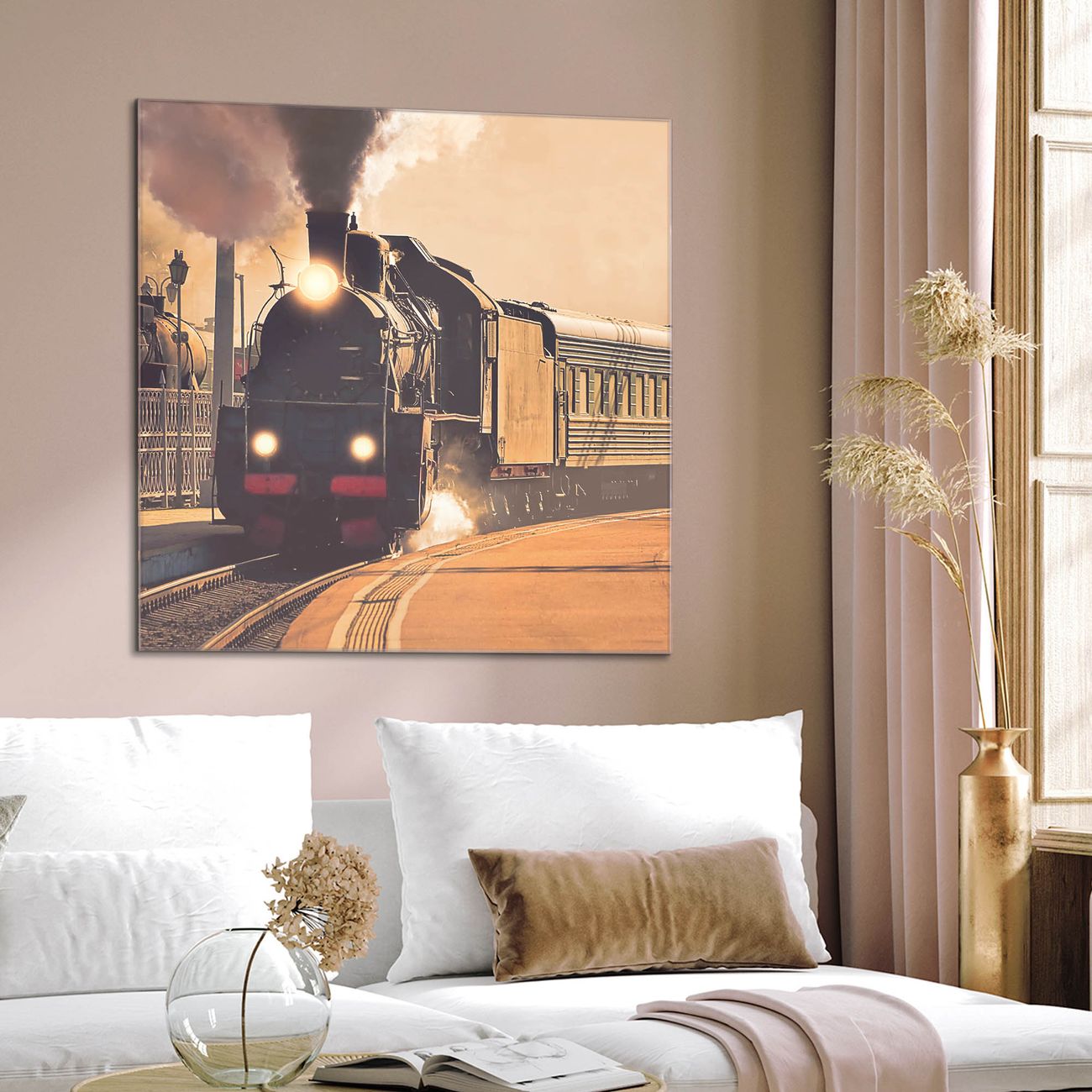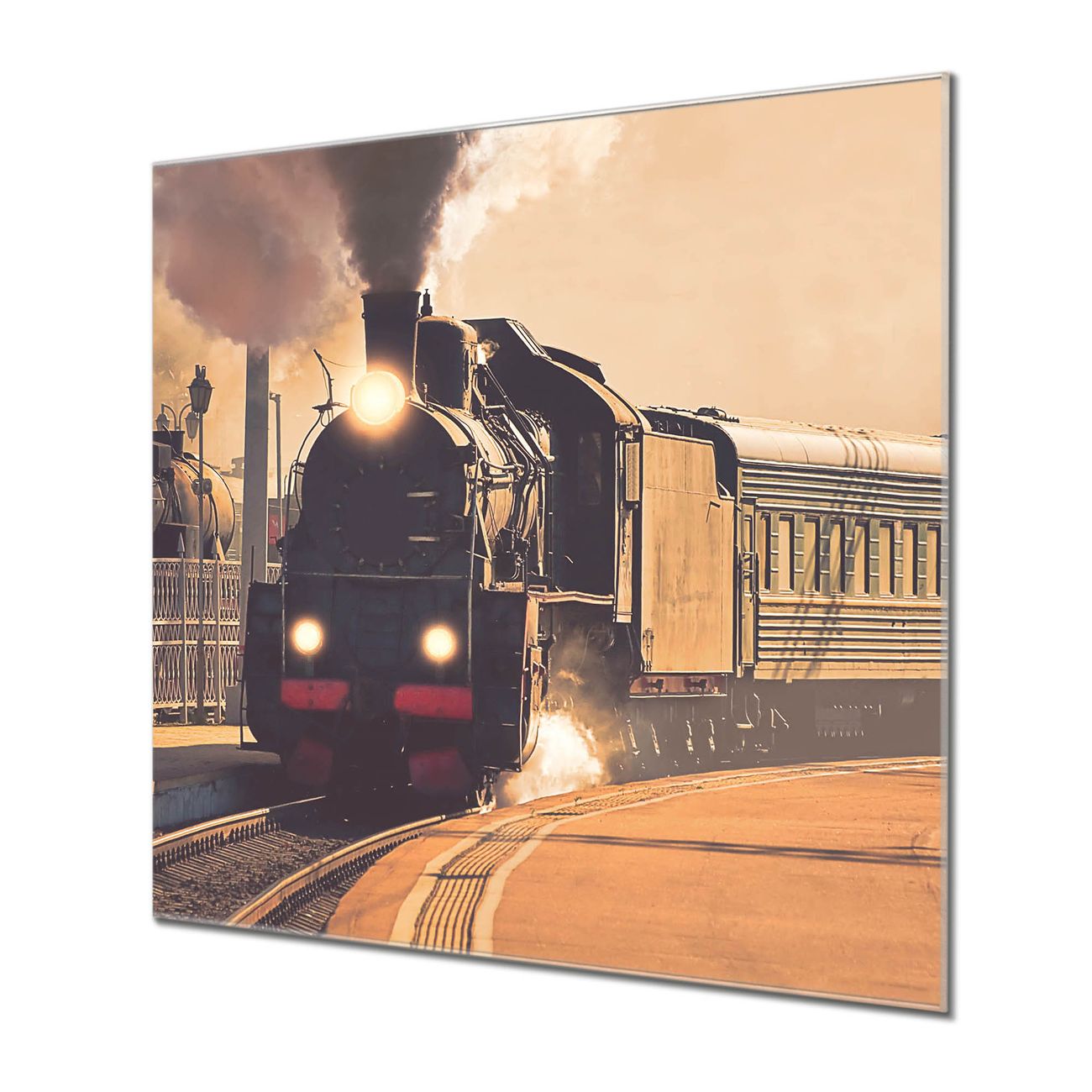 Quadratisches Wandbild aus Glas Einfahrender Zug