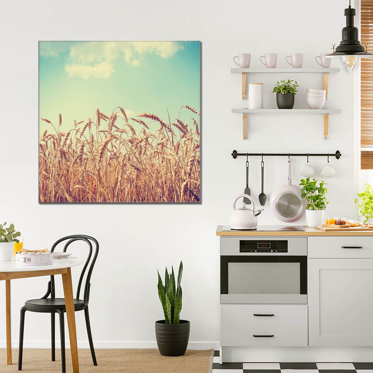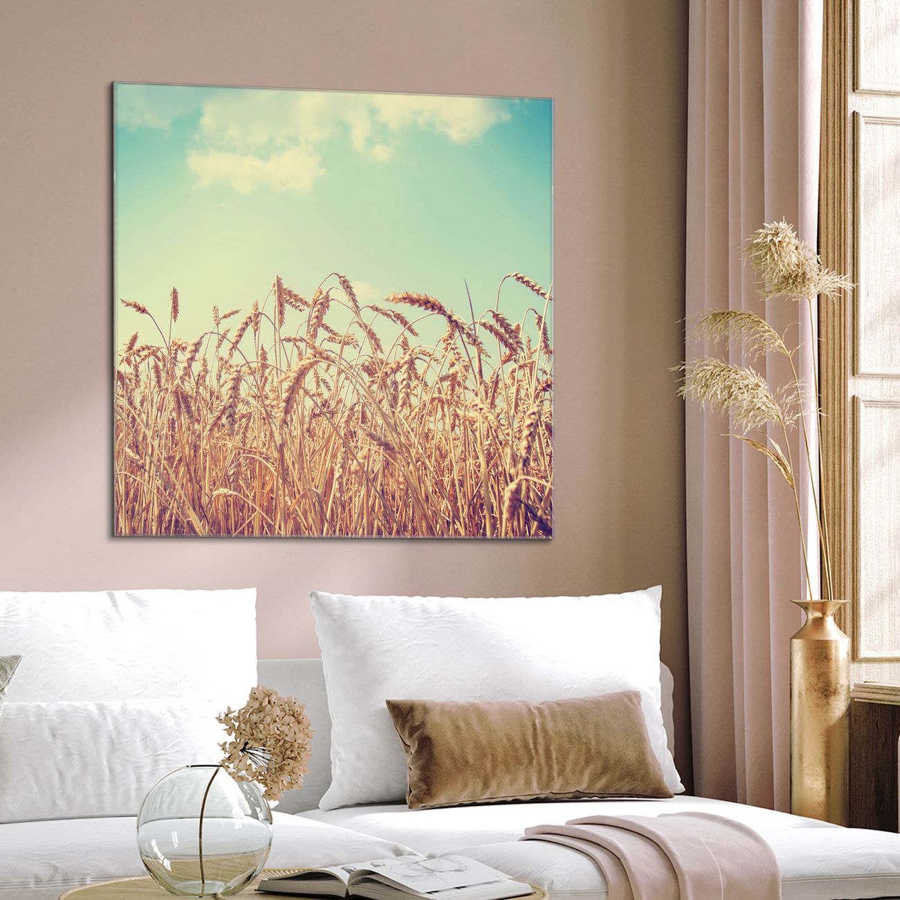 Unsere einzigartigen Glasbilder im Querformat von banjado mit Motiv Erntezeit sind der absolute Hingucker! Unsere Banjado Glasbilder sind sehr begehrt, weil sie top verarbeitet sind und sich ganz leicht montieren lassen. Schon mit wenigen Handgriffen hängen sie an der Wand und strahlen mit höchster brillianz. Durch die Ramenlose Herstellung schwebt das Echtglasbild förmlich an der Wand. Das Motiv erscheint besonders ausdrucksstark und hochwertig und ist hinter dem Echtglas geschützt.